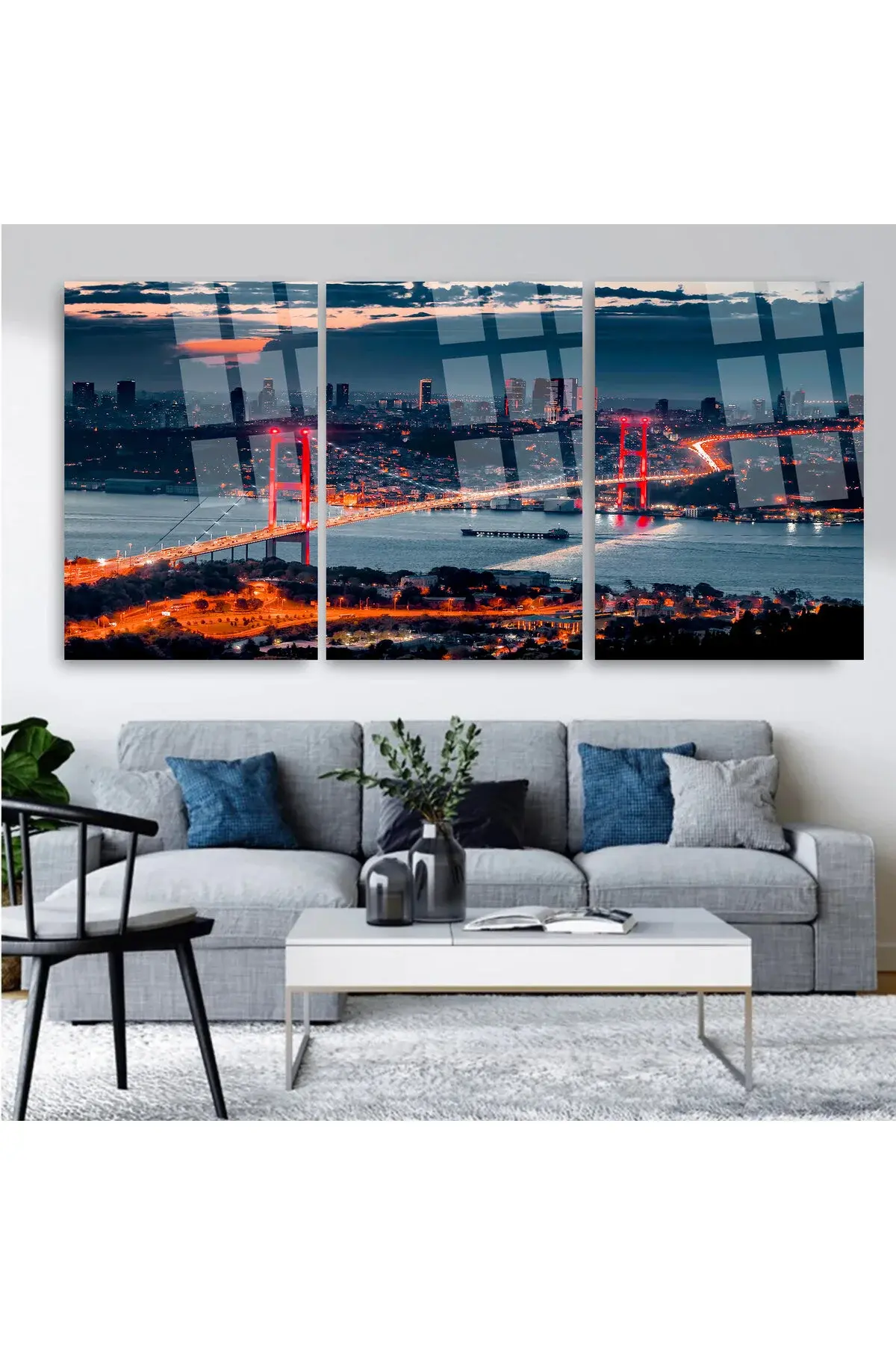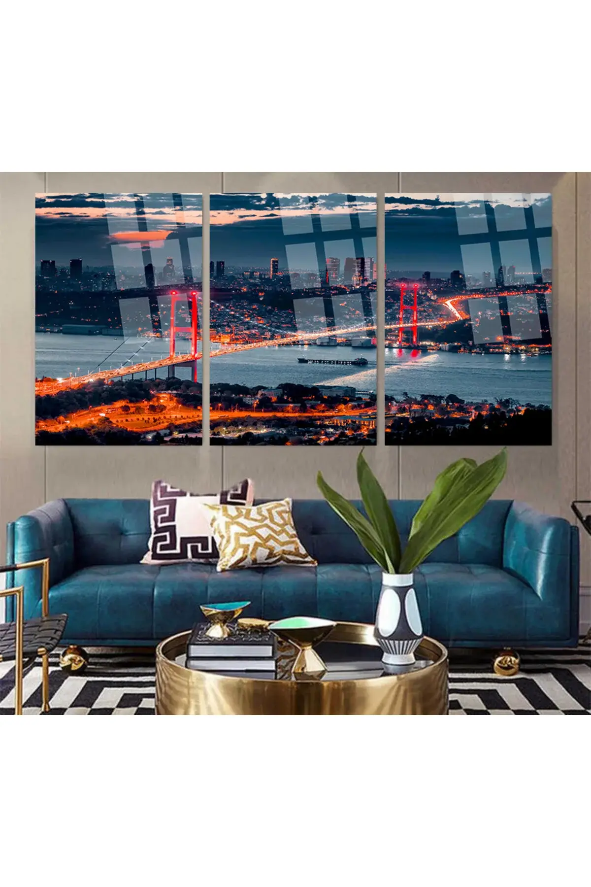 3 PARÇA HARİKA İSTANBUL MANZARASI SET MODERN TABLO ULTRA CANLI RENKLİ KIRILMAZ CAM TABLO EV HEDİYESİ Lacivert