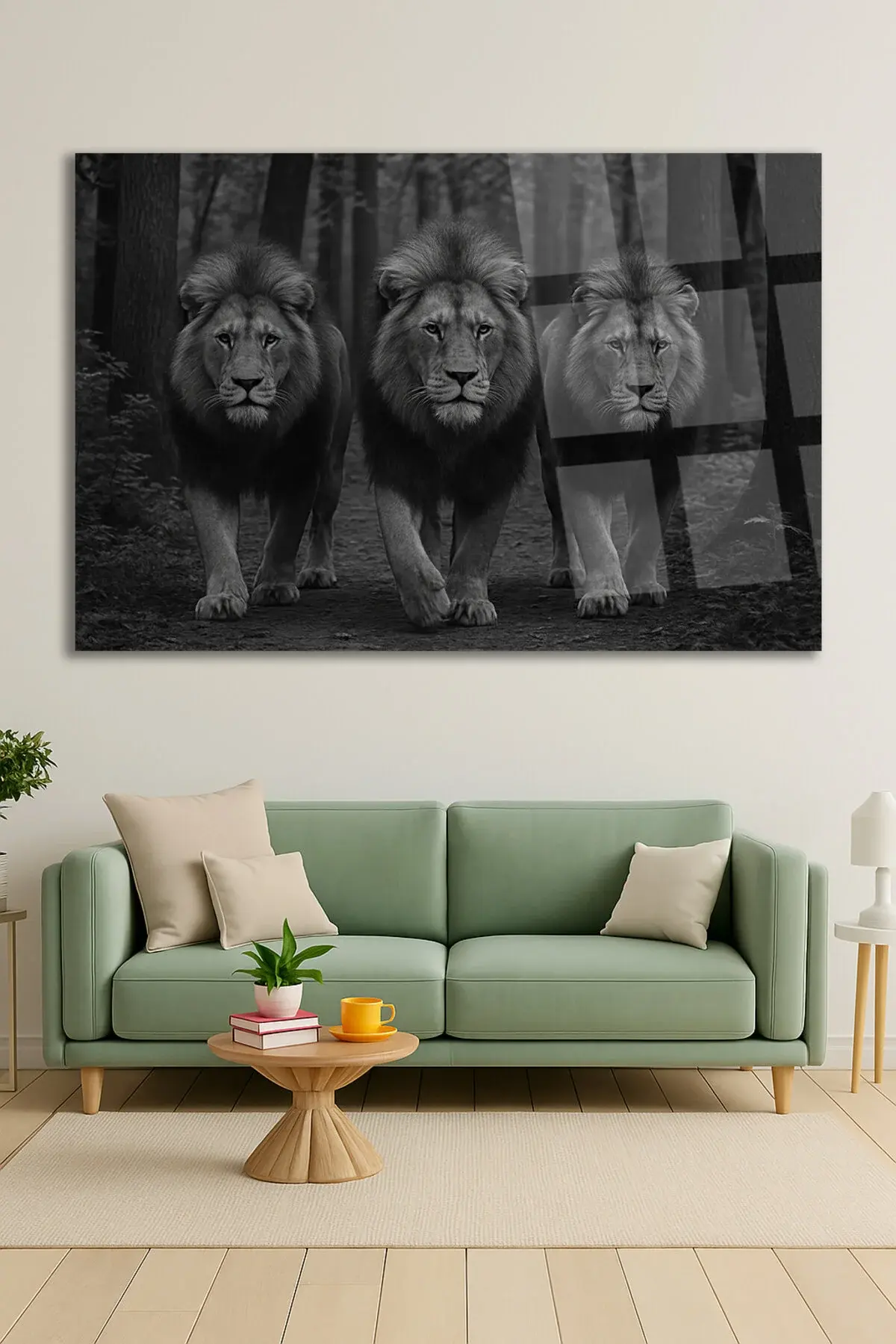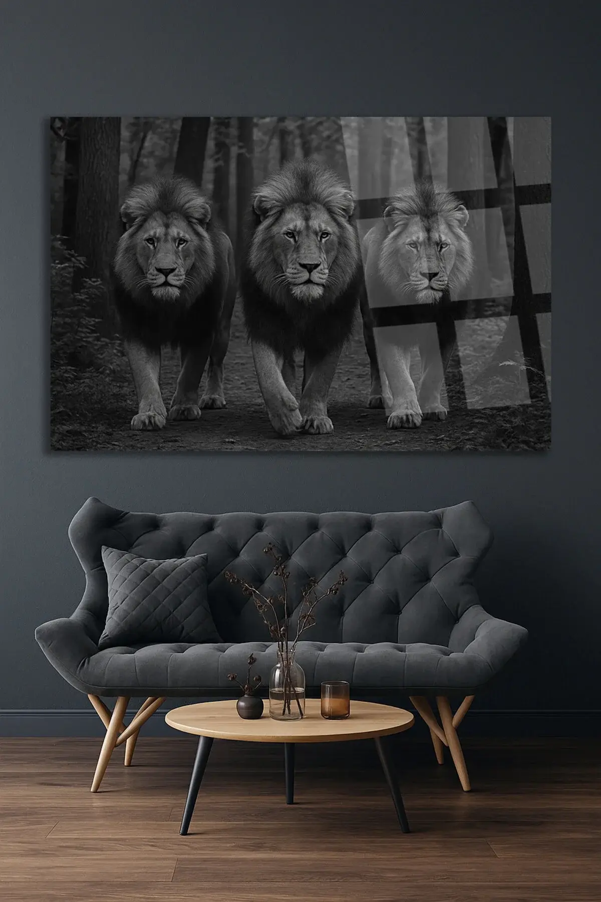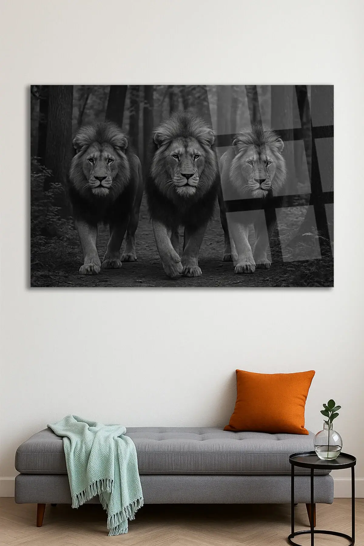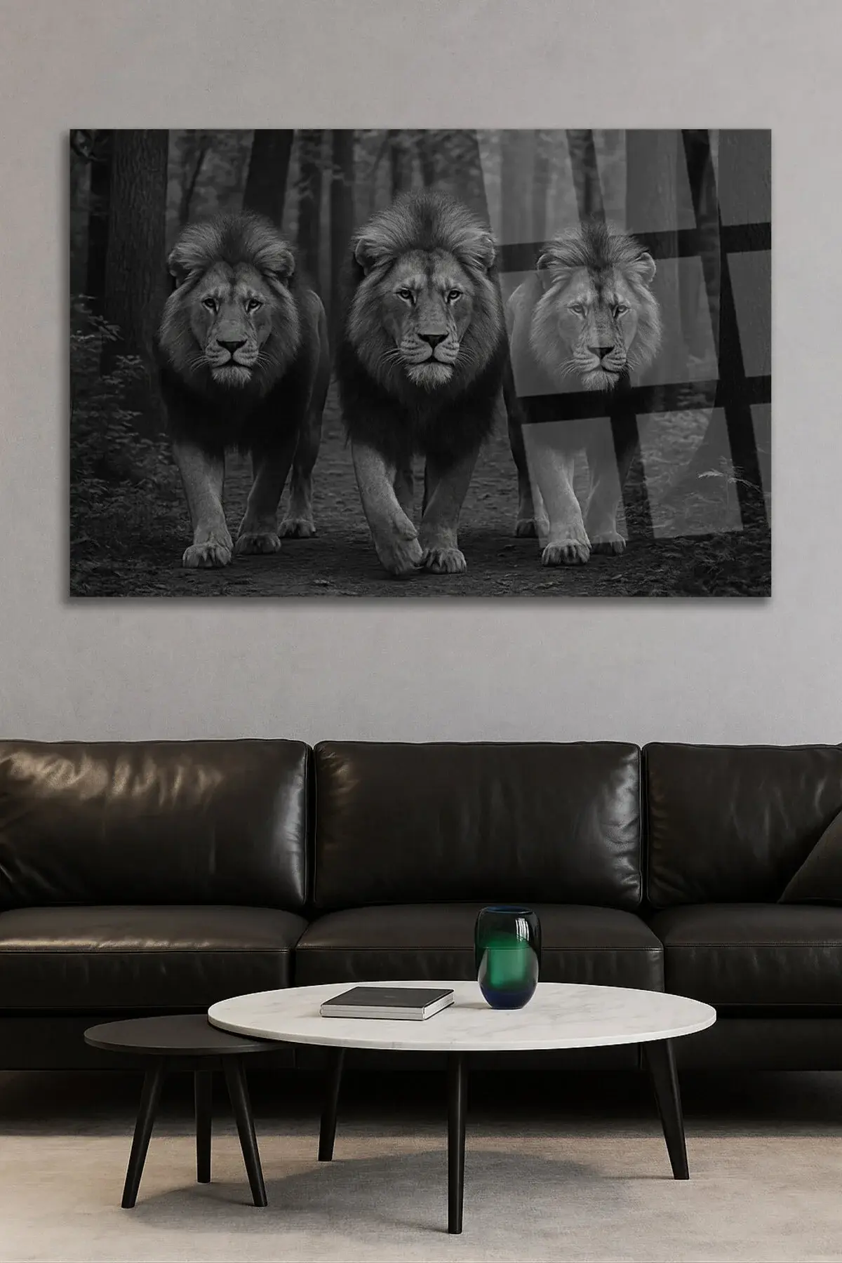 3 ÜÇ ARKADAŞ ASLAN ASİL GÖRKEMLİ KIRILMAZ LÜKS CAM TABLO ULTRA CANLI RENKLER LÜKS HEDİYE TABLO Siyah