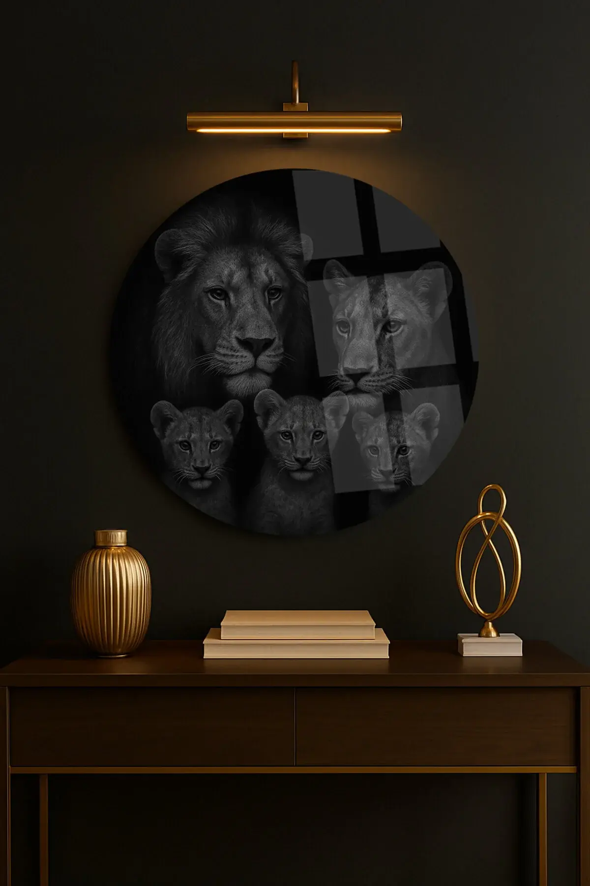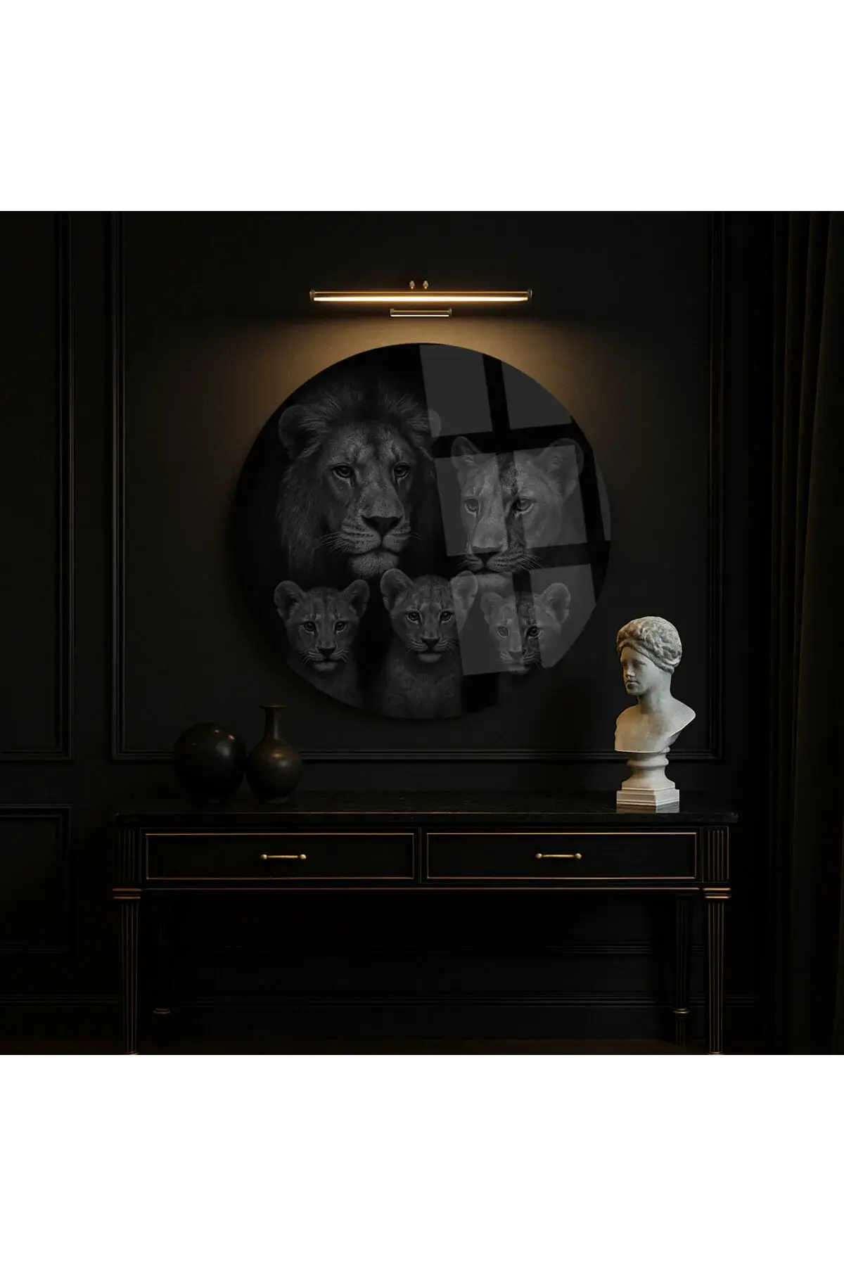 3 ÜÇ KİŞİLİK ASLAN AİLESİ TASARIMI KIRILMAZ YUVARLAK LÜKS CAM TABO EV HEDİYESİ ULTRA CANLI RENKLER Siyah