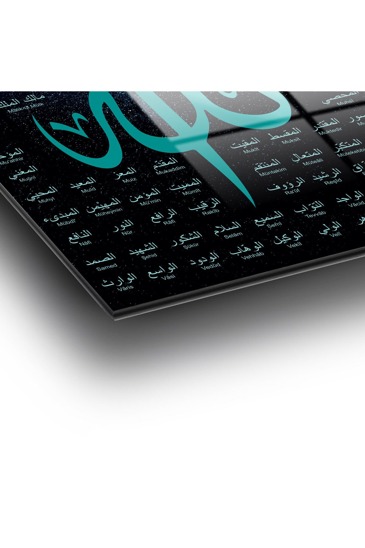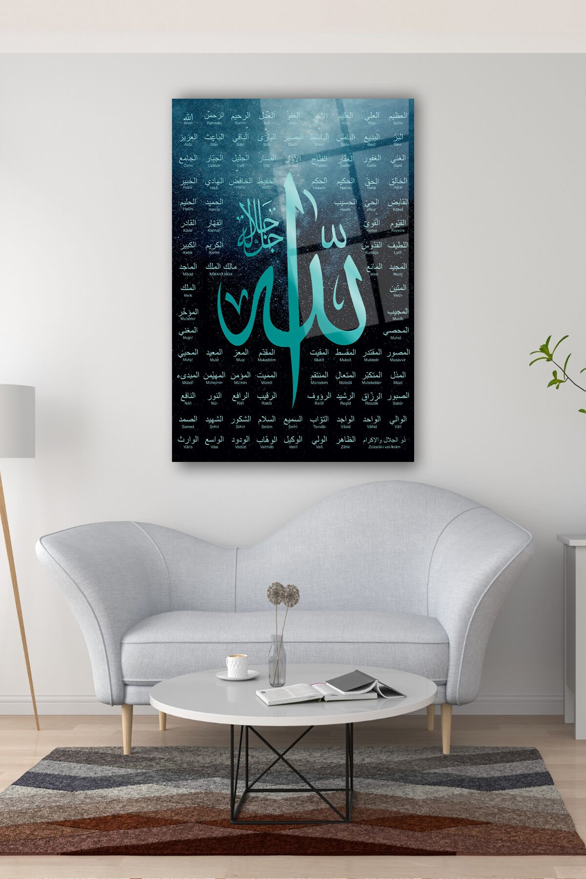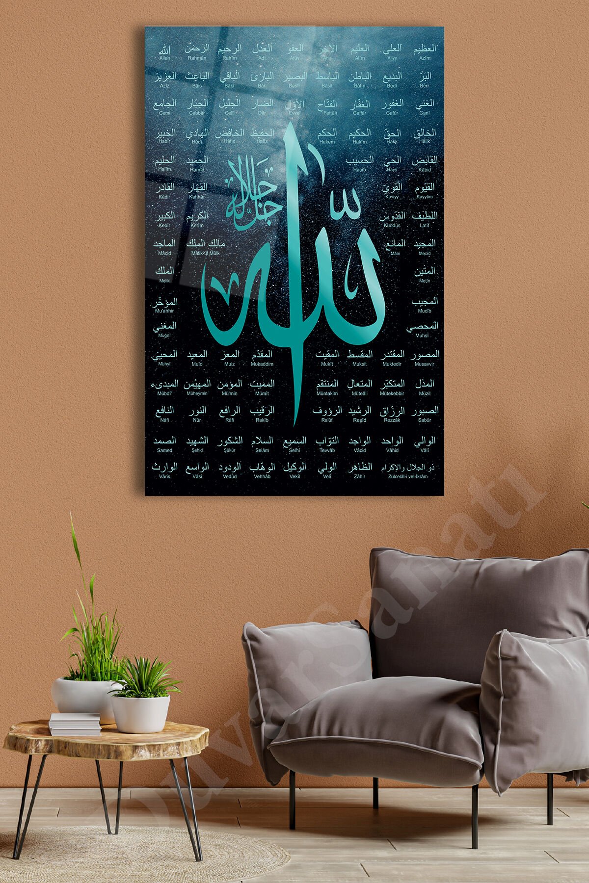 Allah'ın 99 İsmi Esmaül Hüsna Dini Dikey Cam Tablo Ev Ofis Salon Duvar Dekoru Hediyelik Büyük Tablo Turkuaz