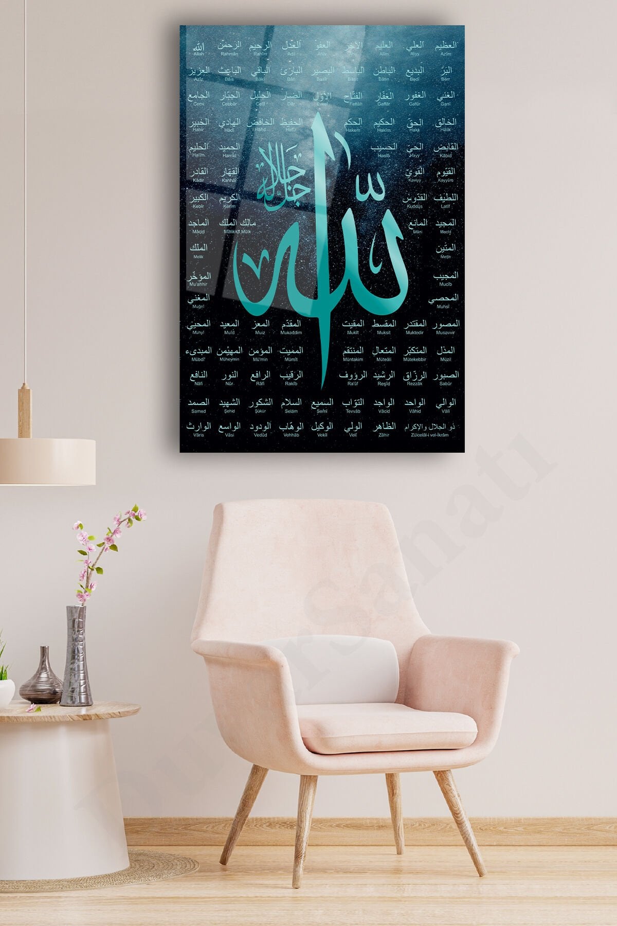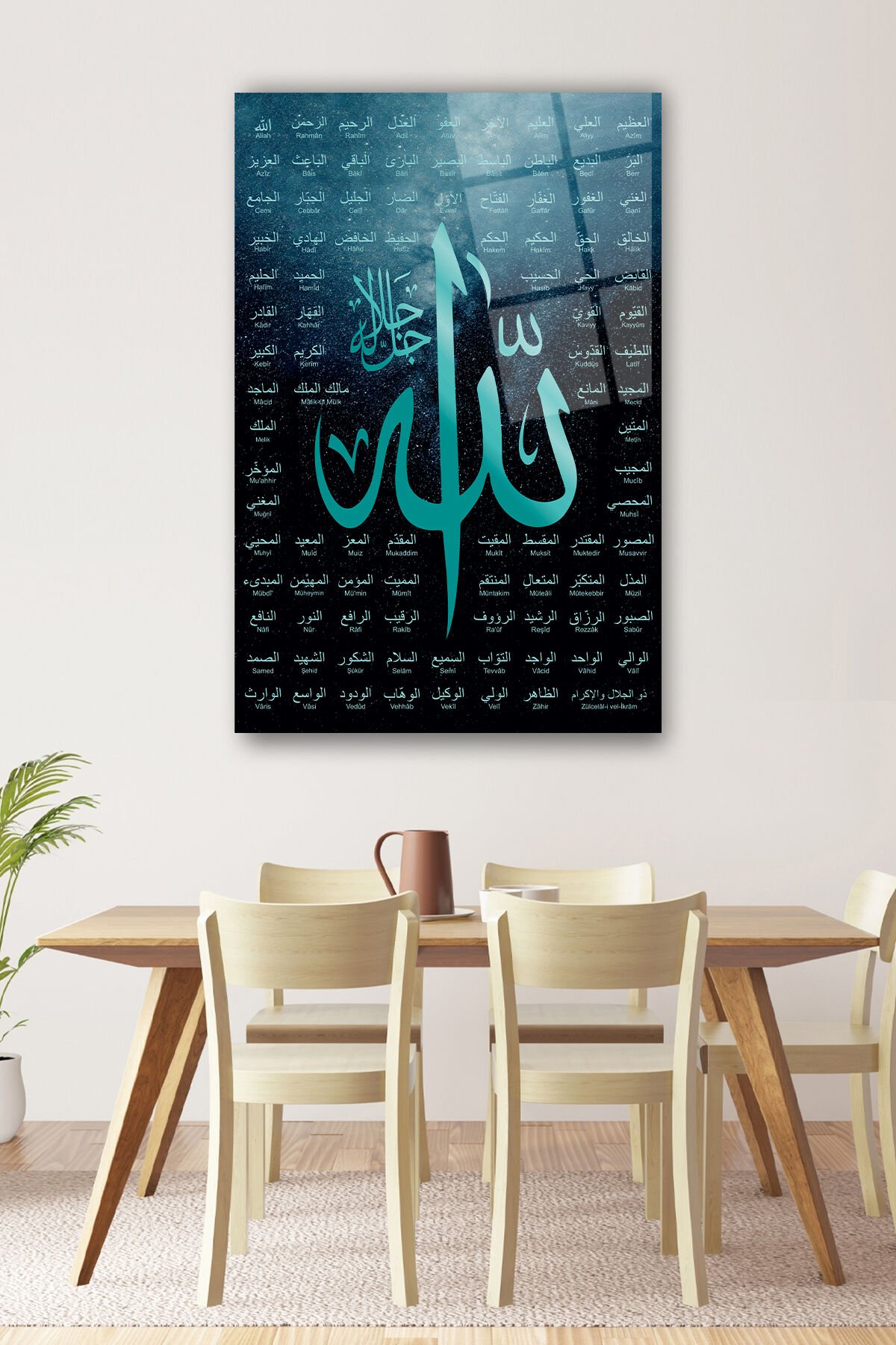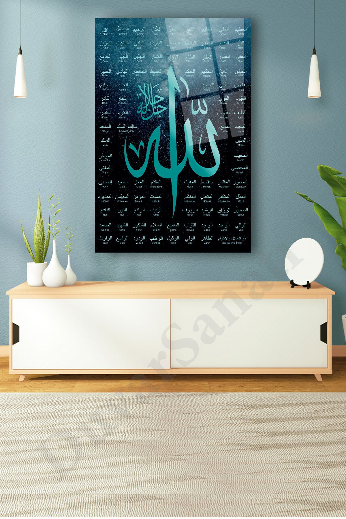Allah'ın 99 İsmi Esmaül Hüsna Dini Dikey Cam Tablo Ev Ofis Salon Duvar Dekoru Hediyelik Büyük Tablo Turkuaz