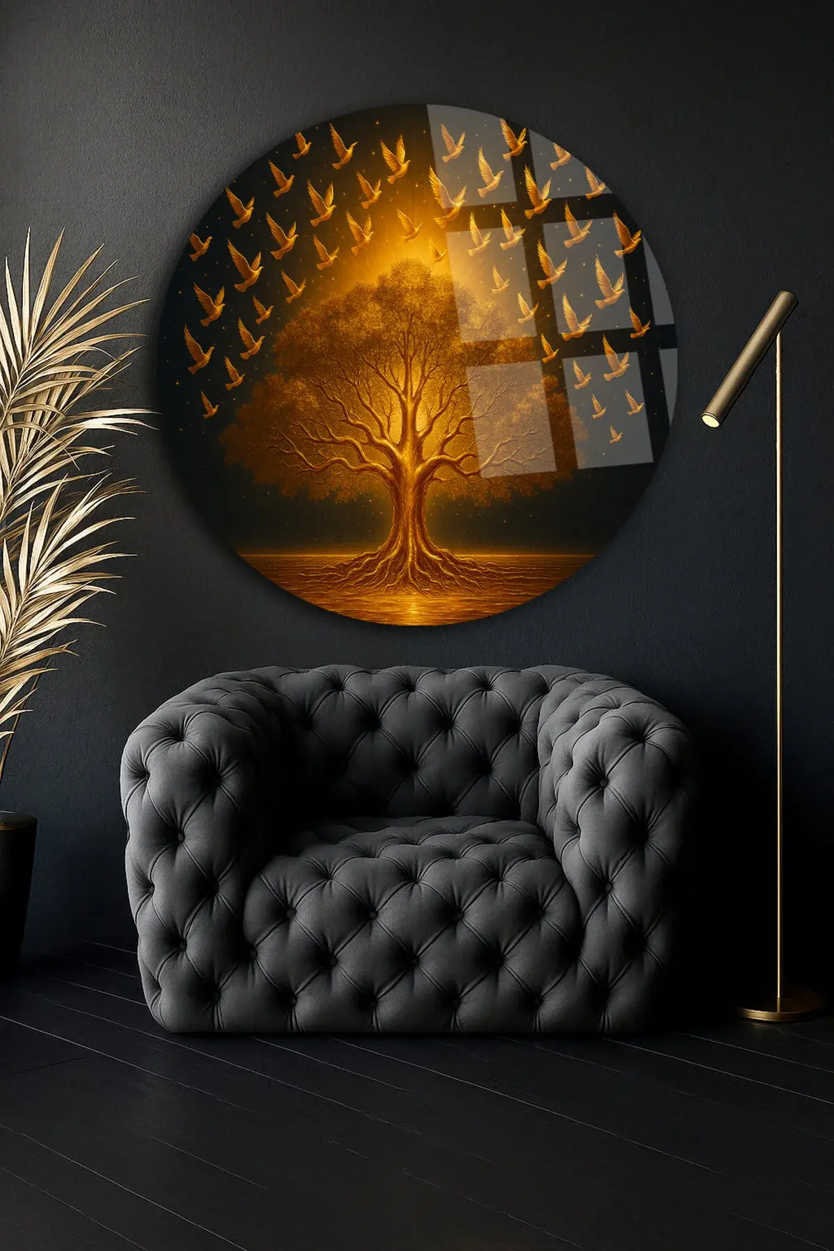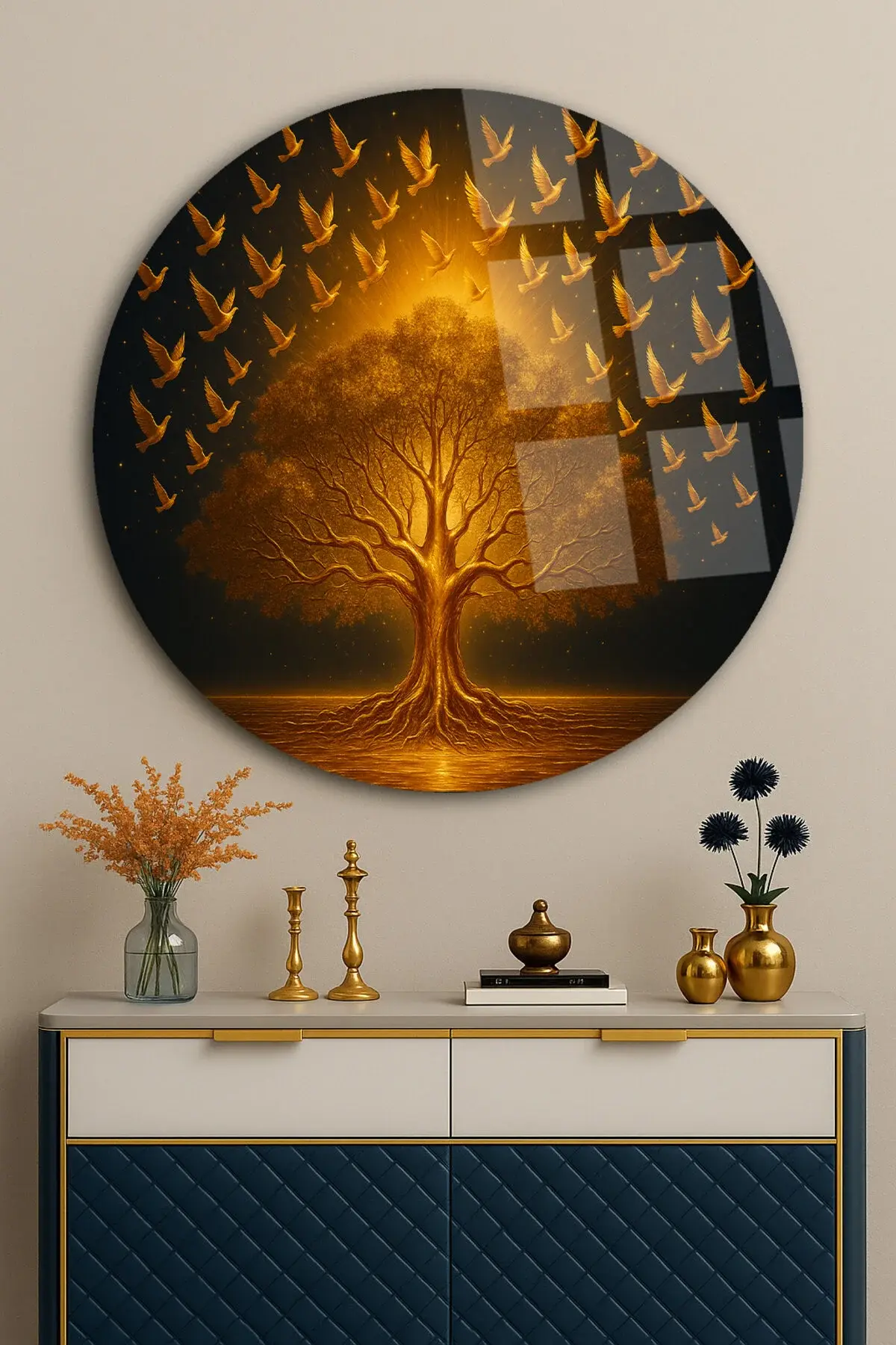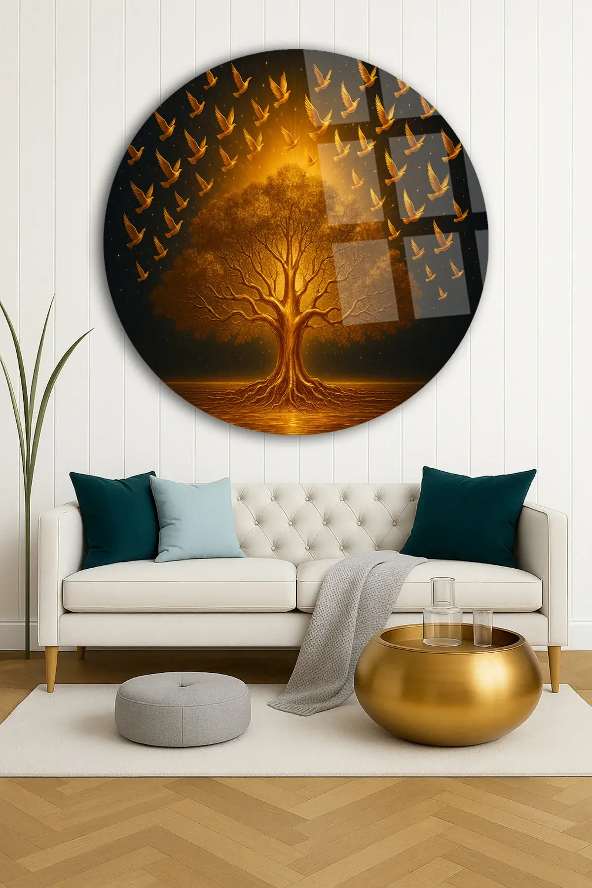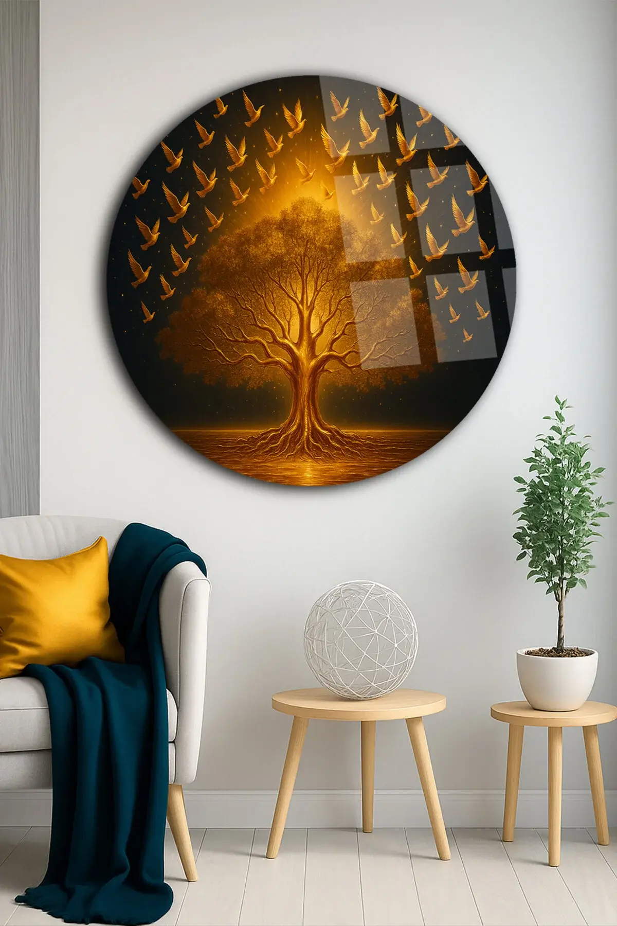 ALTIN AĞA VE KUŞLAR MODERN TABLO KIRILMAZ LÜKS CAM TABLO YUVARLAK CAM TABLO EV HEDİYESİ Turuncu