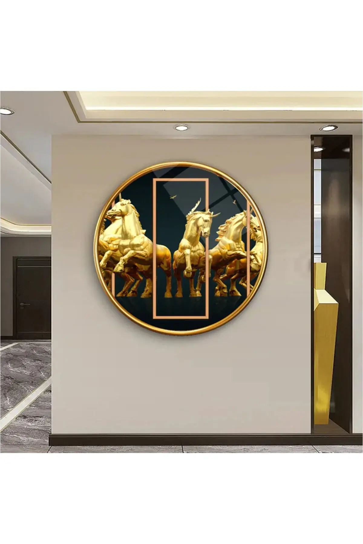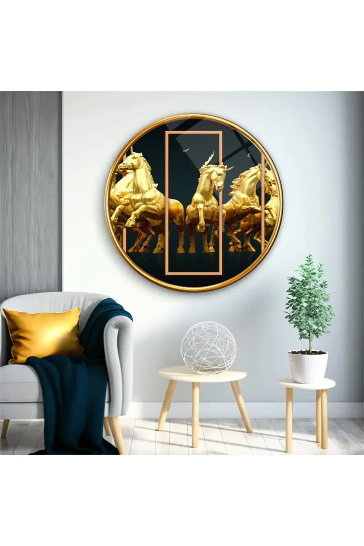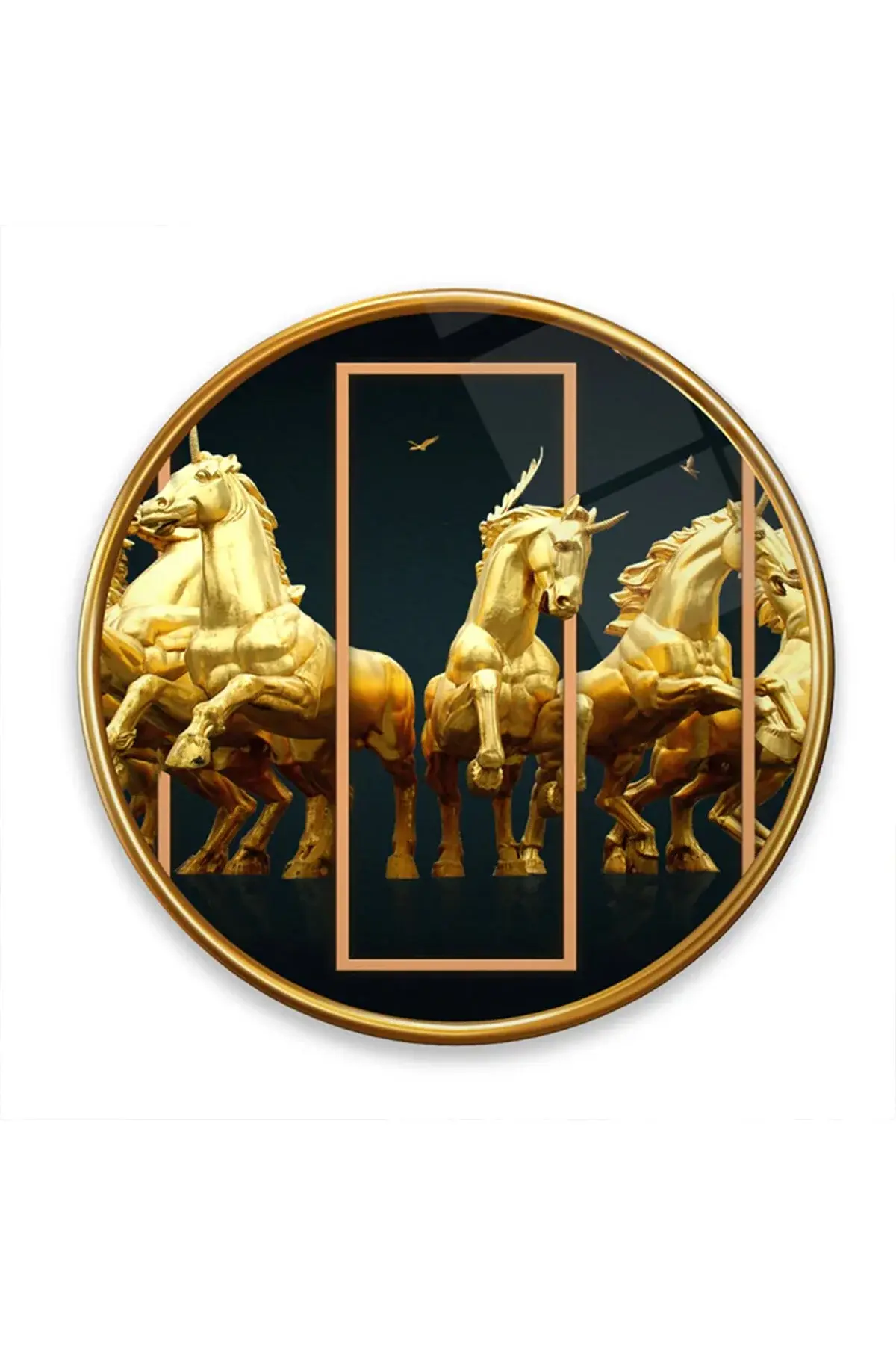 ALTIN ATLAR TASARIMI YUVARLAK KIRILMAZ MODERN CAM TABLO EV HEDİYESİ LÜKS ODA TABLOSU Sarı