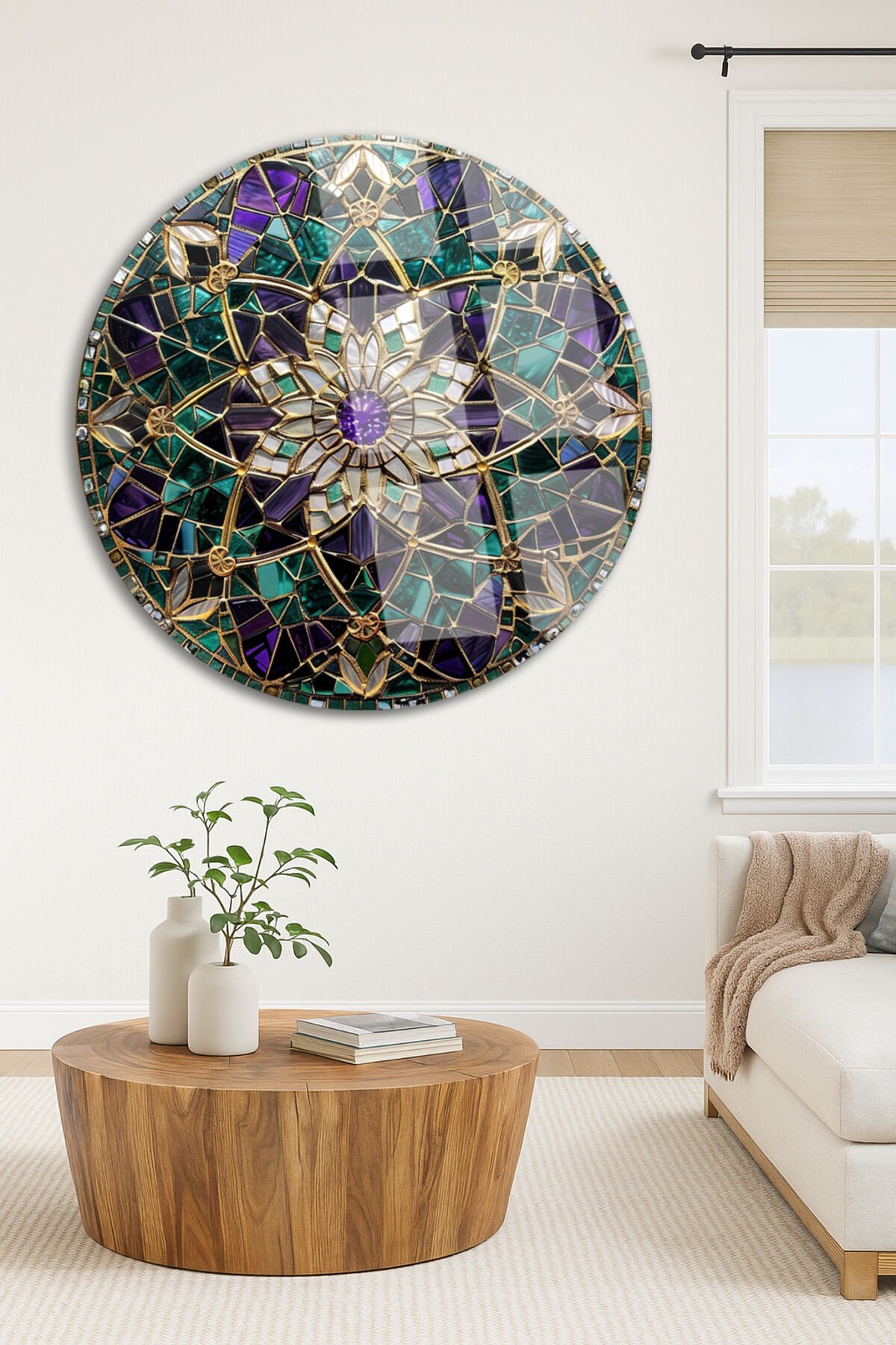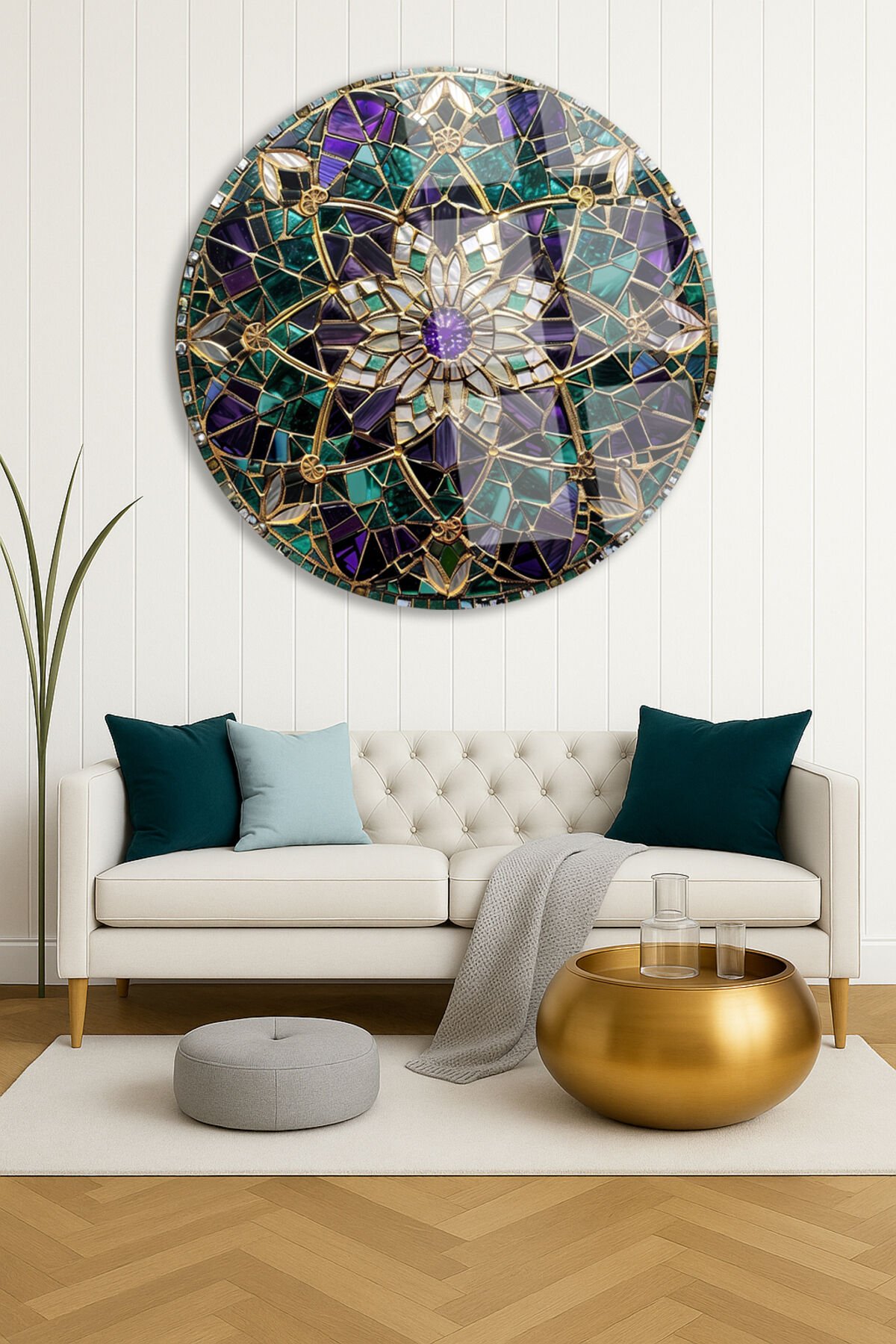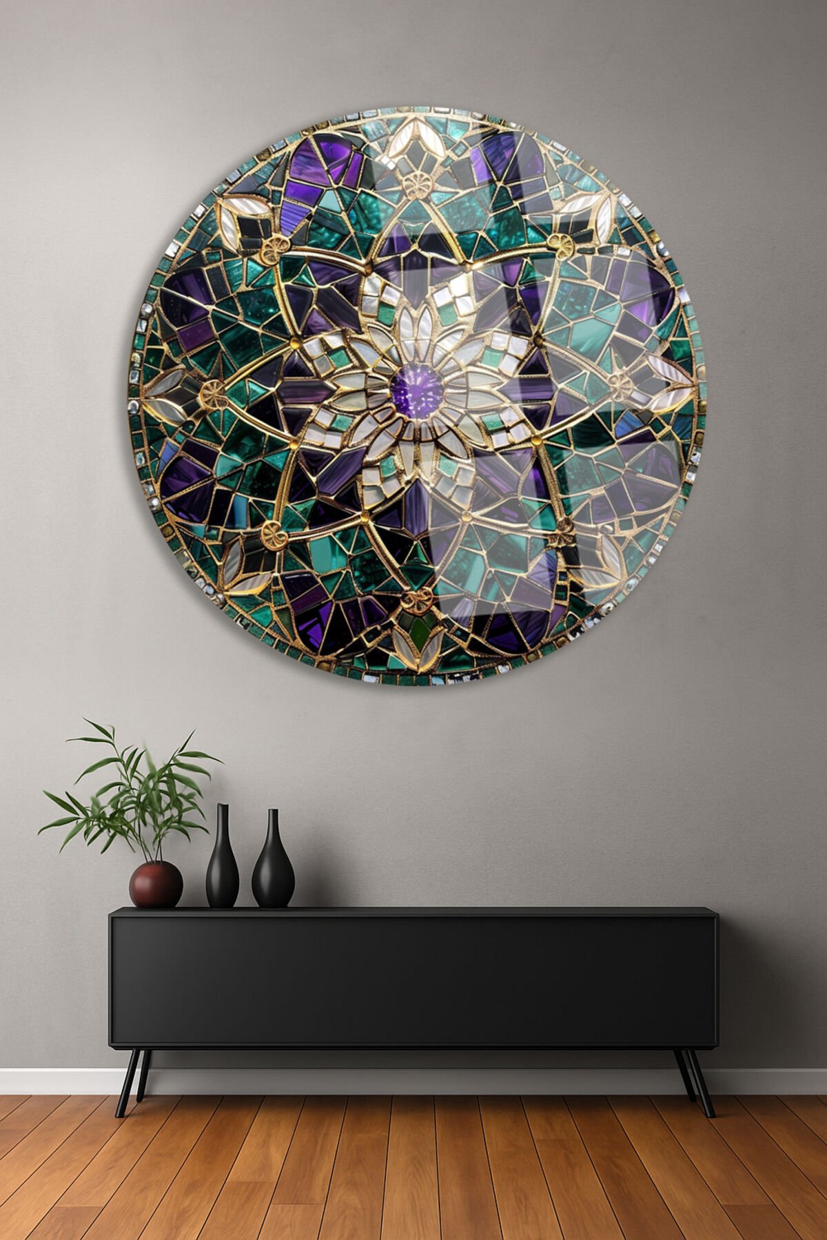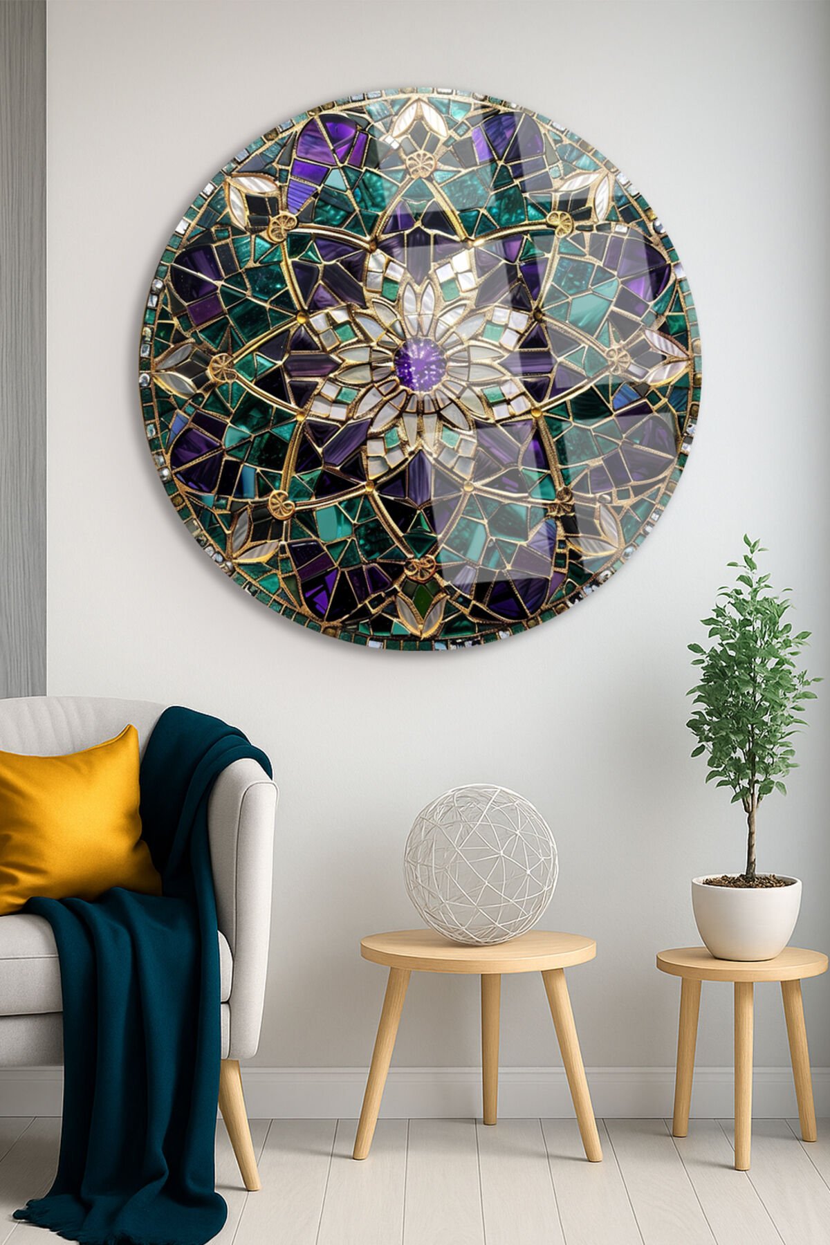 Altın Çerçeveli Mandala Çiçek Desenli Yuvarlak Kırılmaz Cam Tablo Modern Tablo Ev Hediyesi Tablo Mor