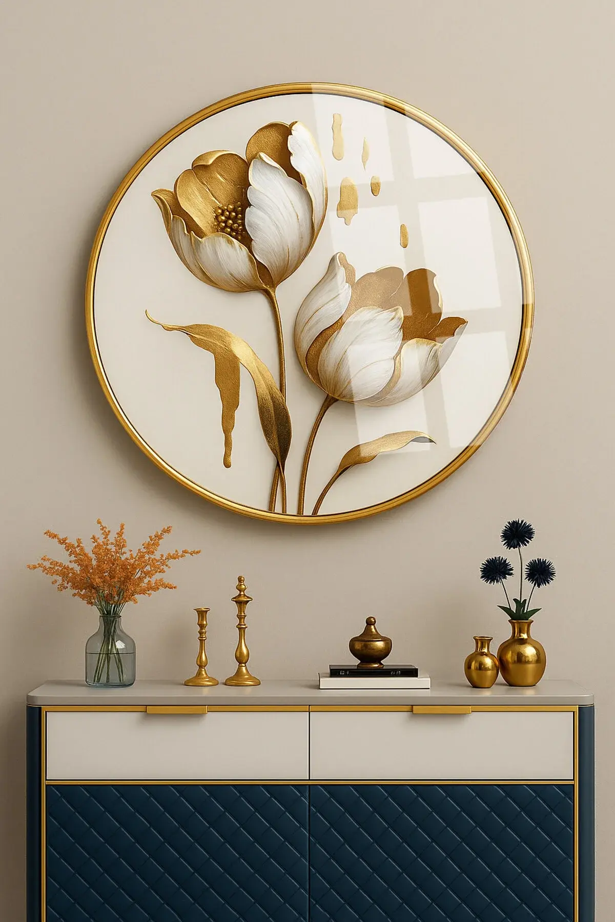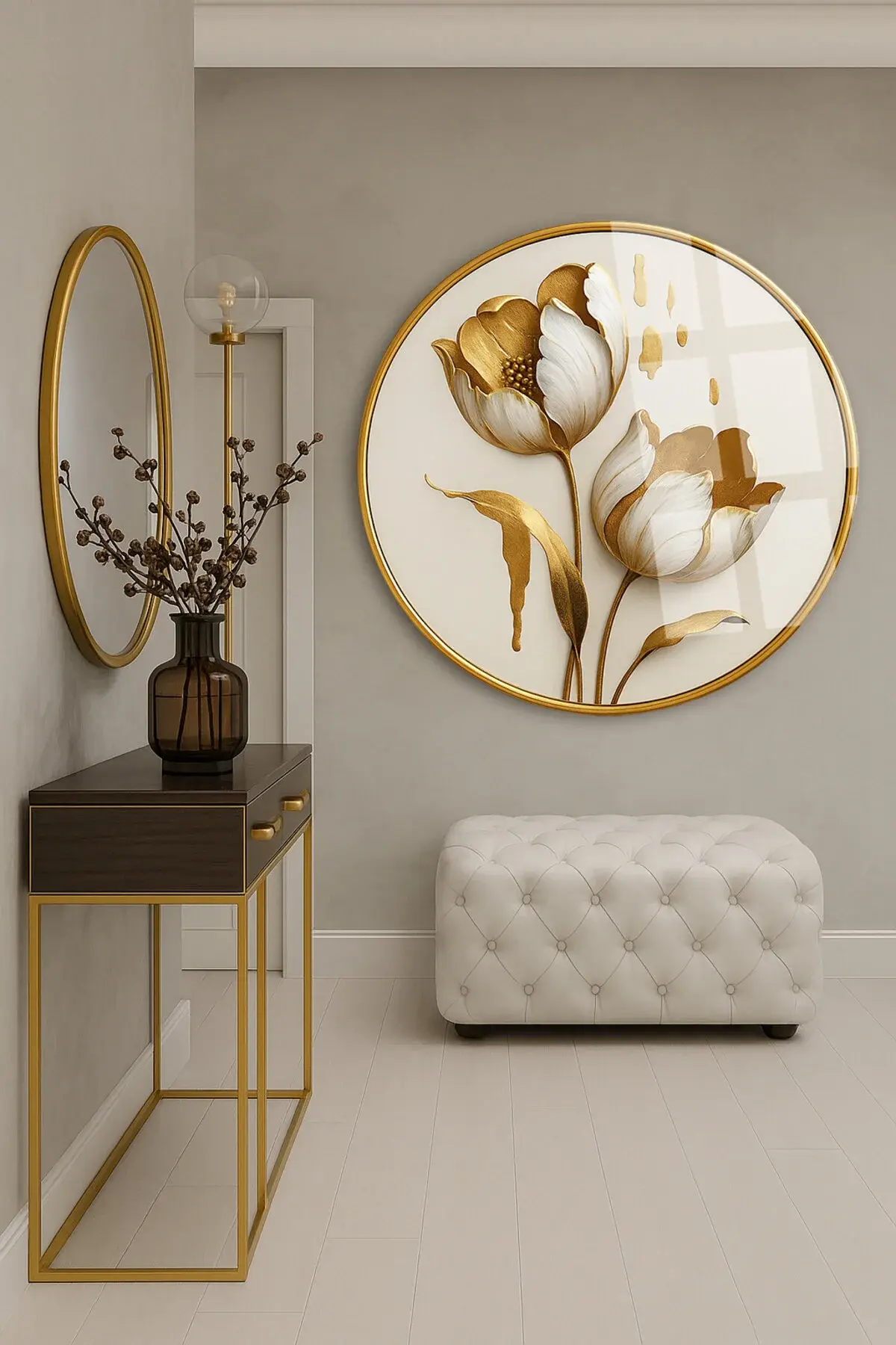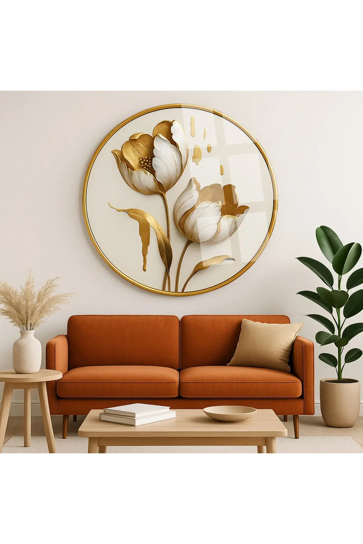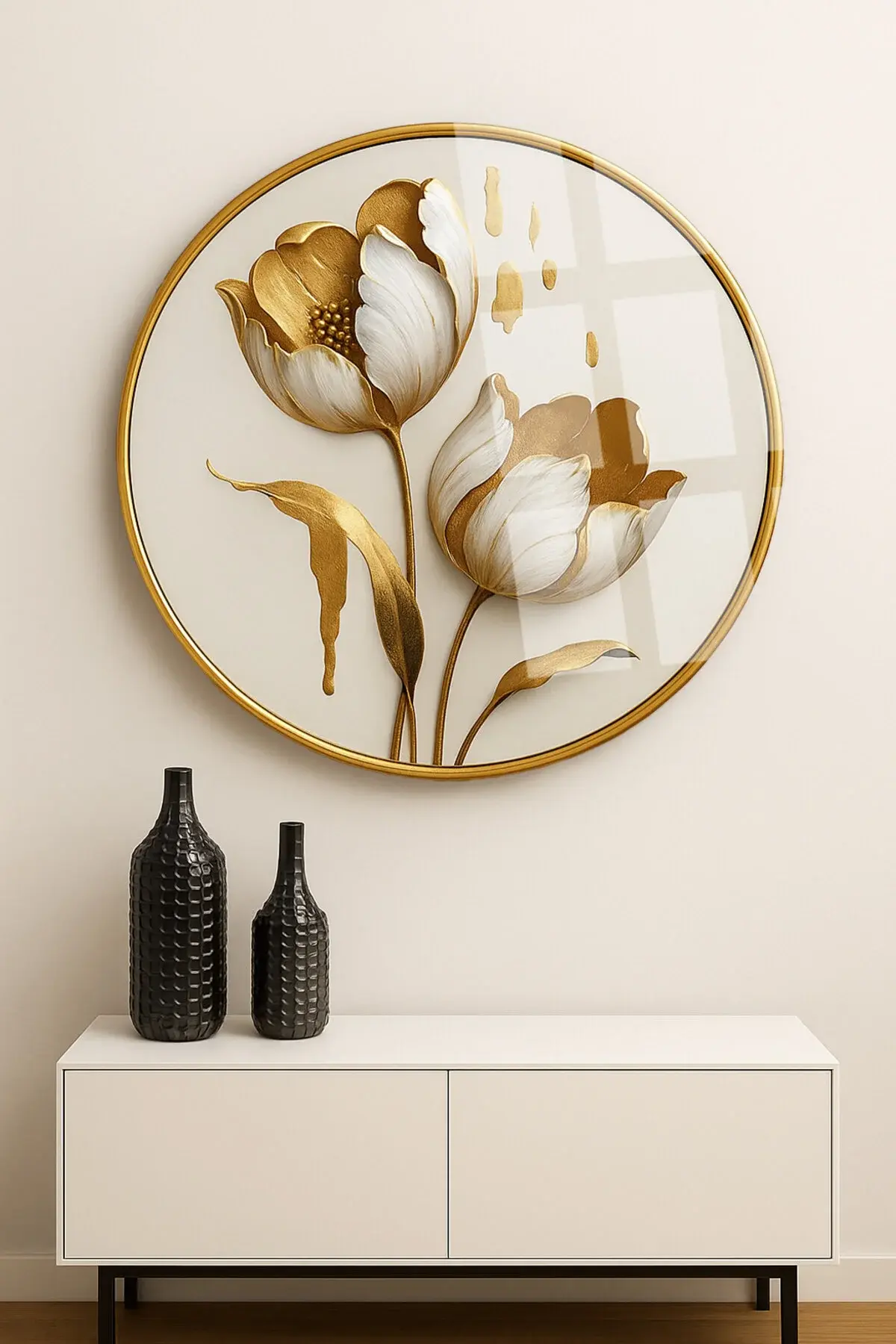 ALTIN DETAYLI BEYAZ LALE TABLOSU KIRILMAZ YUVARLAK CAM TABLO LÜKS EV HEDİYESİ ULTRA CANLI RENKLİ Beyaz