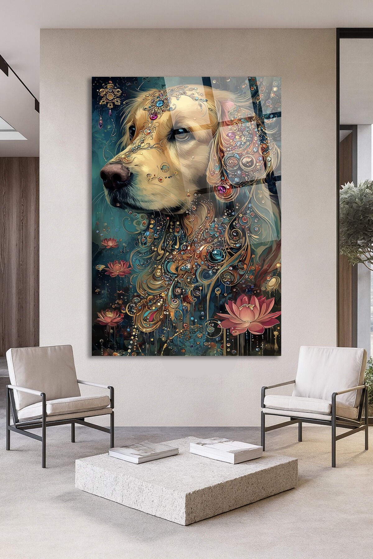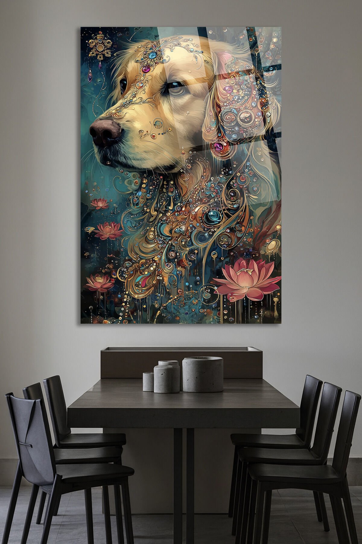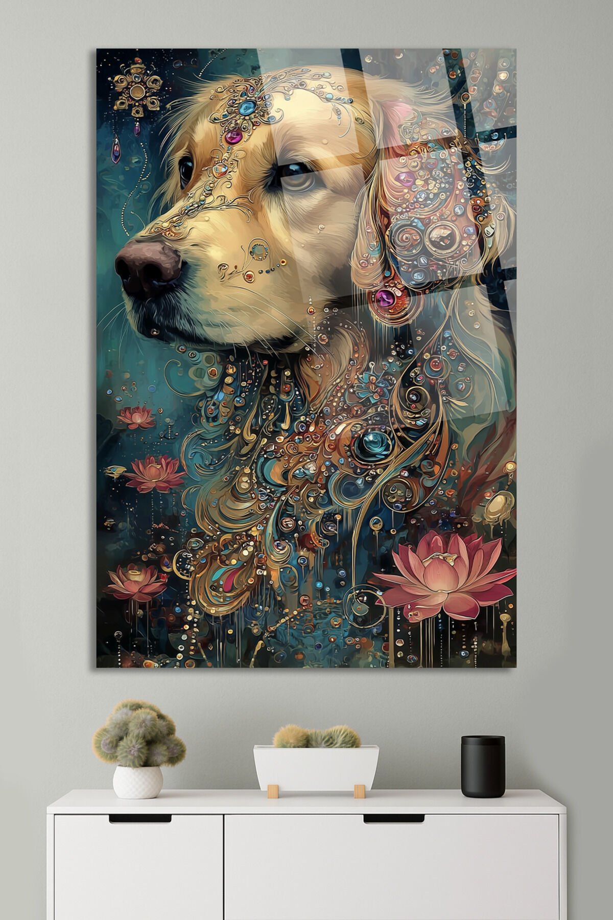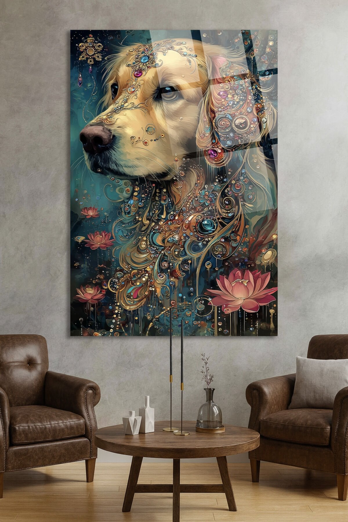 ALTIN DETAYLI GOLDEN RETRIEVER VE LOTUS ÇİÇEĞİ SANATSAL EV HEDİYESİ TABLO Turkuaz