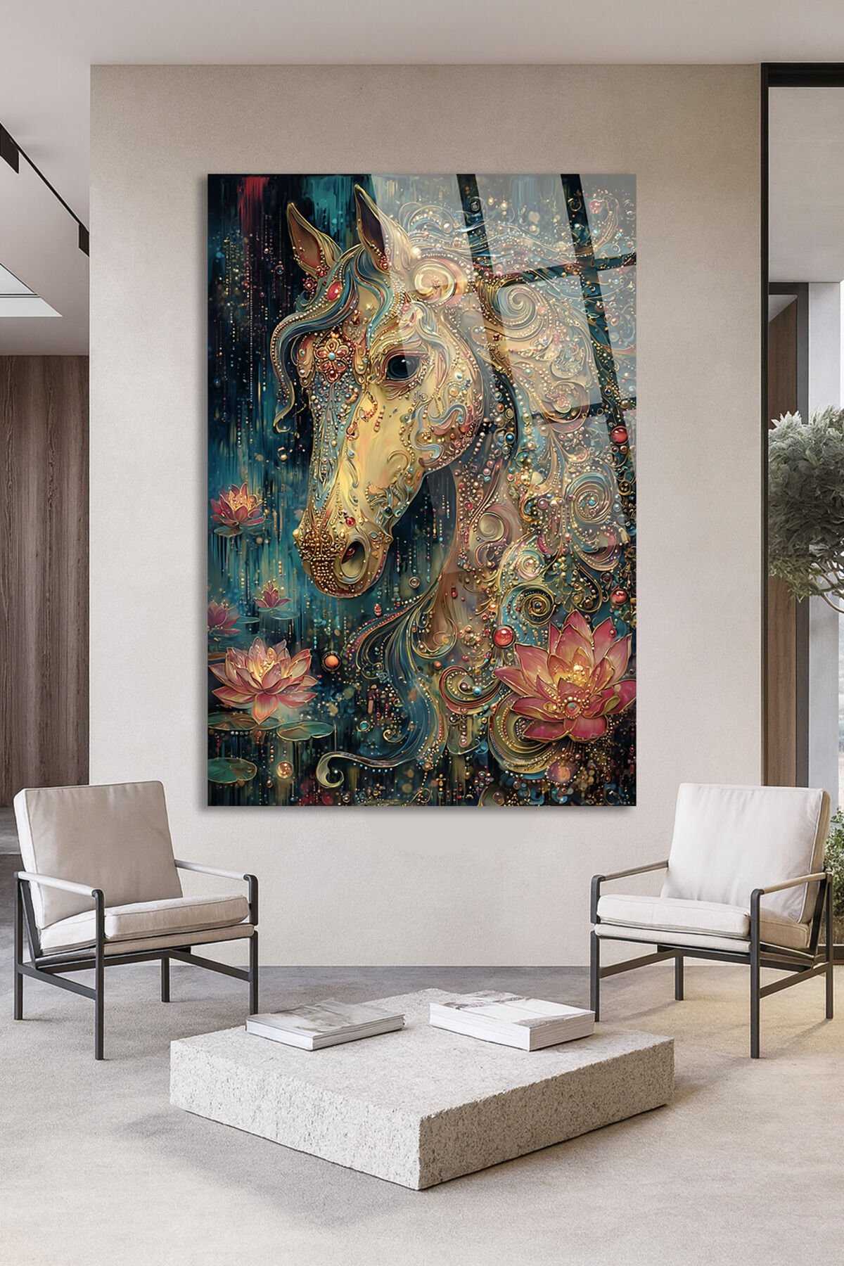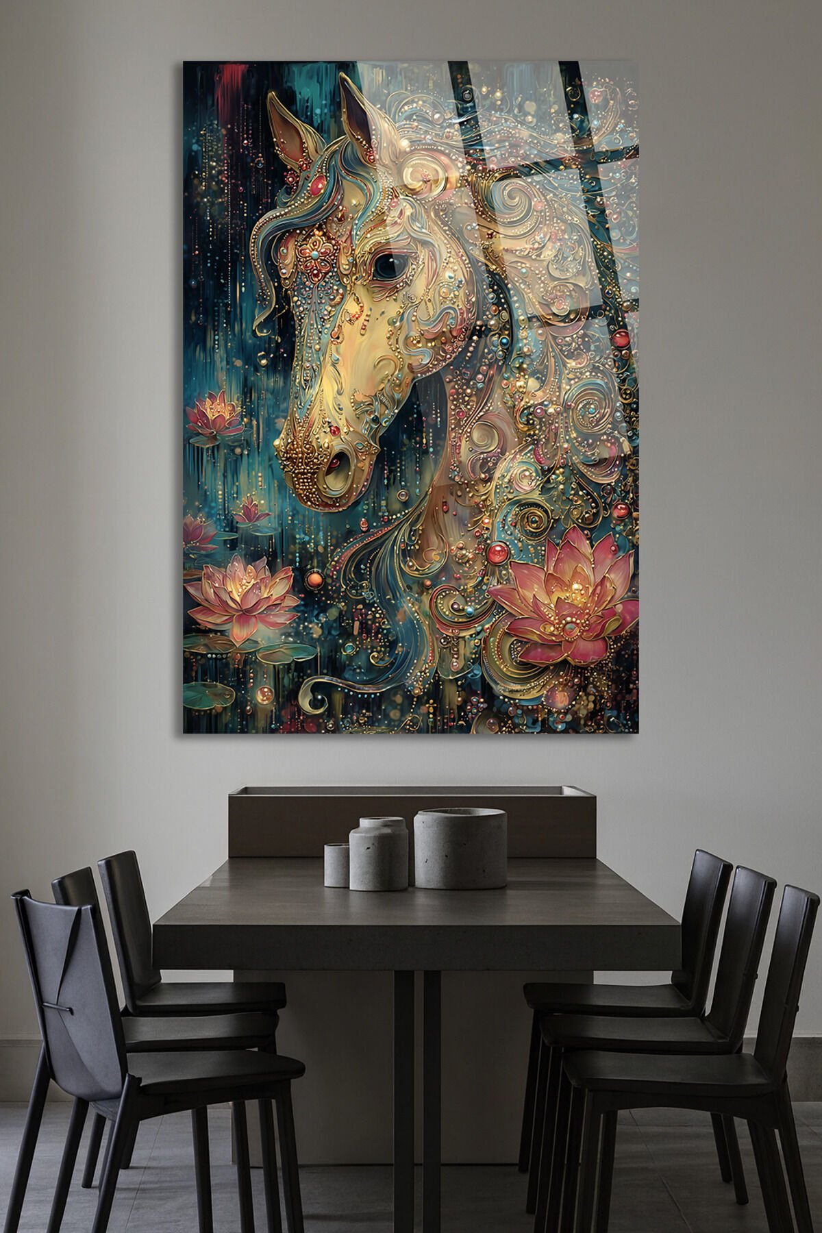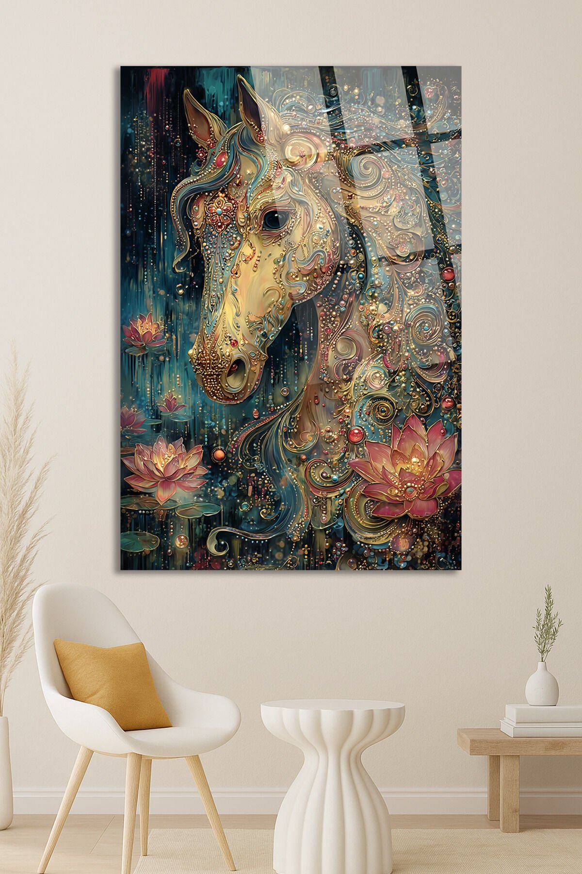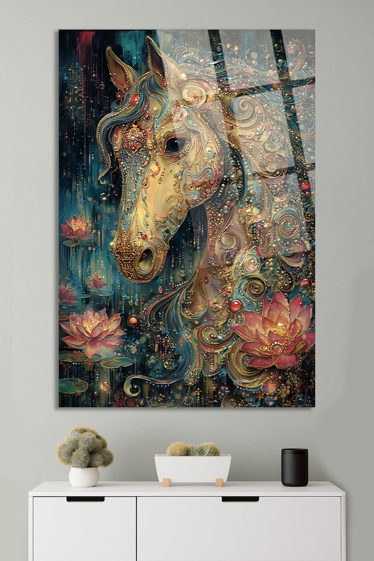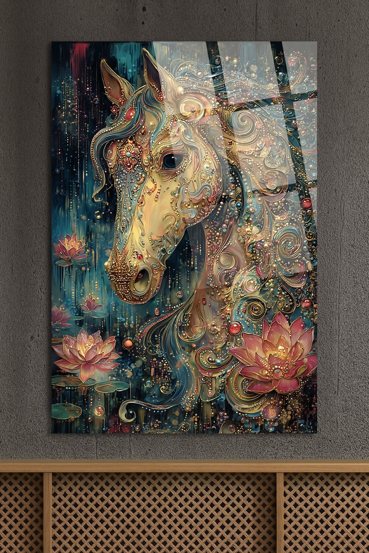 ALTIN DETAYLI MİSTİK AT VE LOTUS ÇİÇEĞİ SANATSAL DEKOR KIRILMAZ CAM TABLO Turkuaz