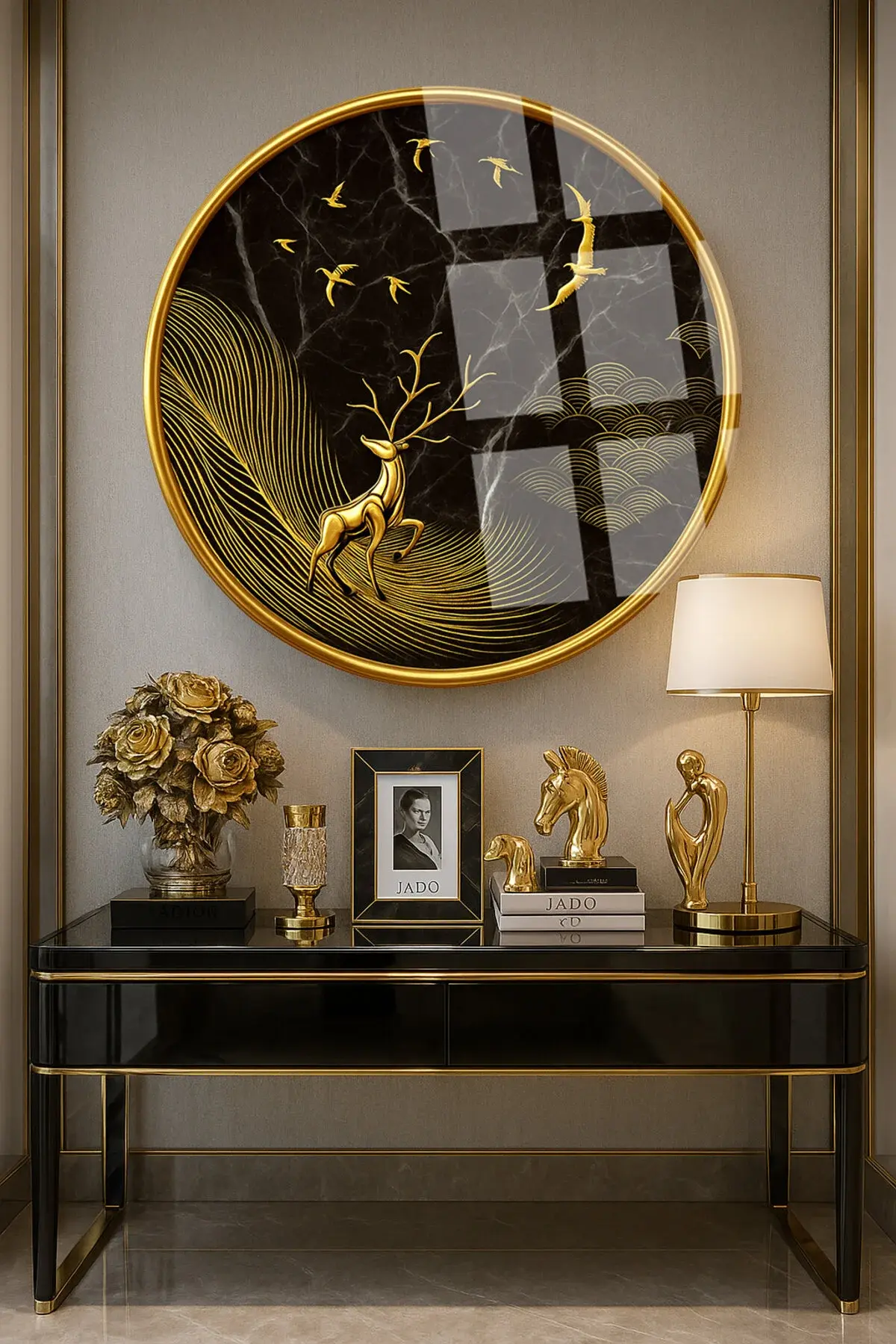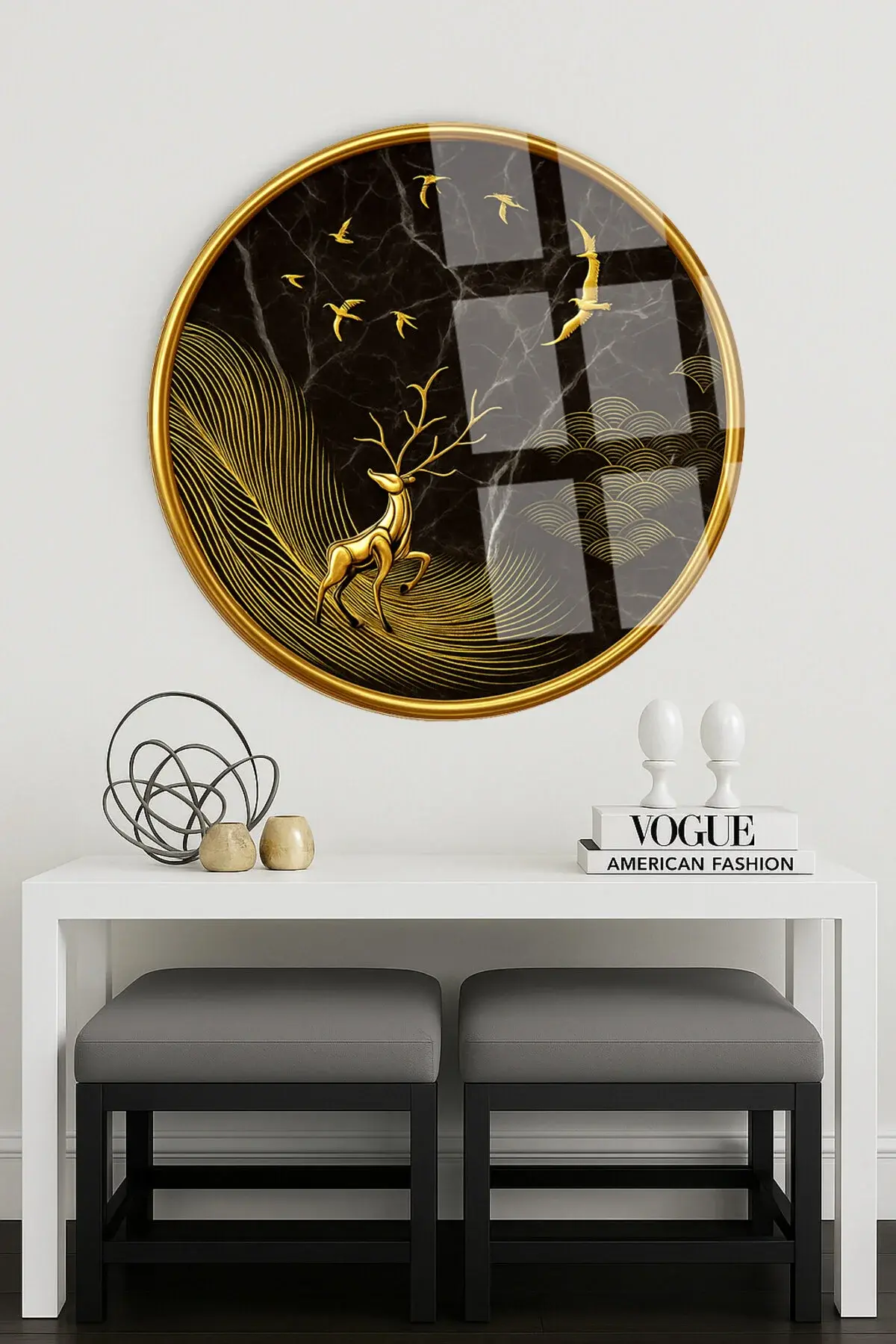 ALTIN GEYİK DAĞ GOLD DETAY YUVARLAK KIRILMAZ MODERN CAM TABLO EV HEDİYESİ LÜKS ODA TABLOSU Kahverengi