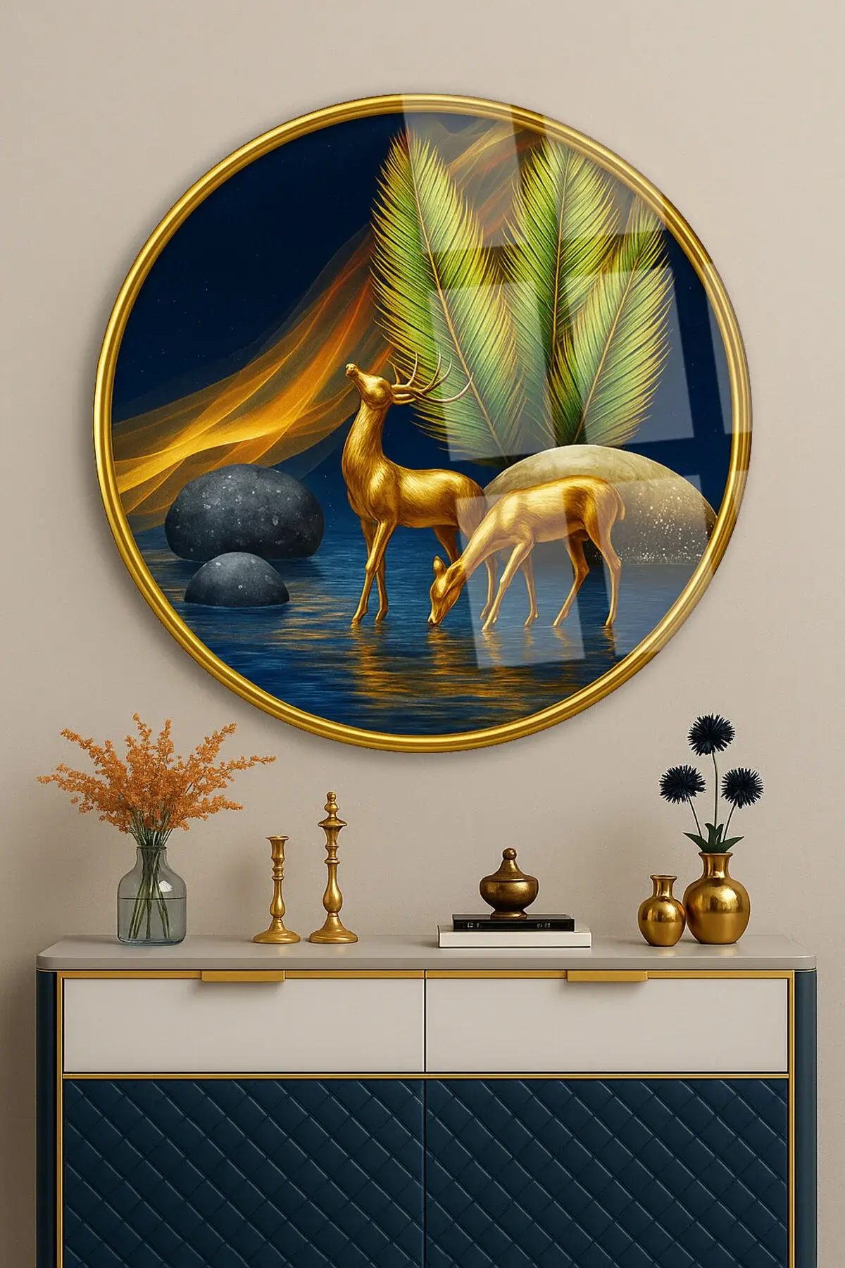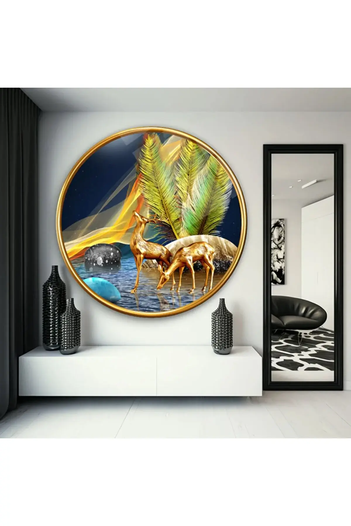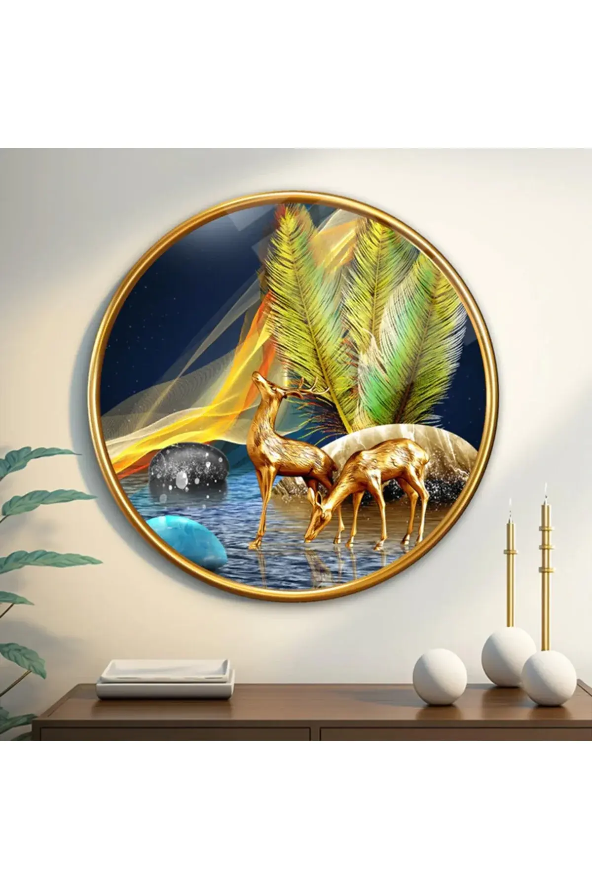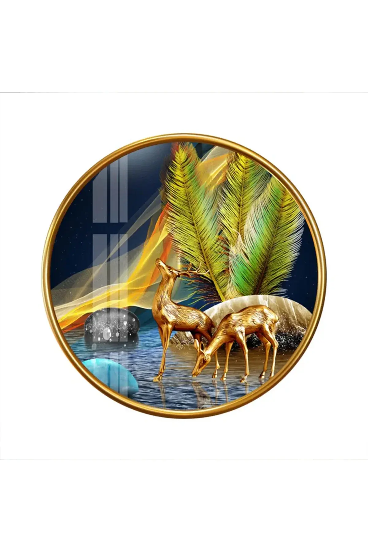 ALTIN GEYİK SANATSAL ÇALIŞMA YUVARLAK KIRILMAZ MODERN CAM TABLO EV HEDİYESİ LÜKS ODA TABLOSU Lacivert