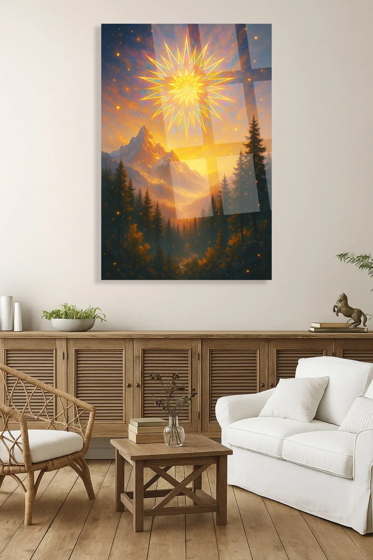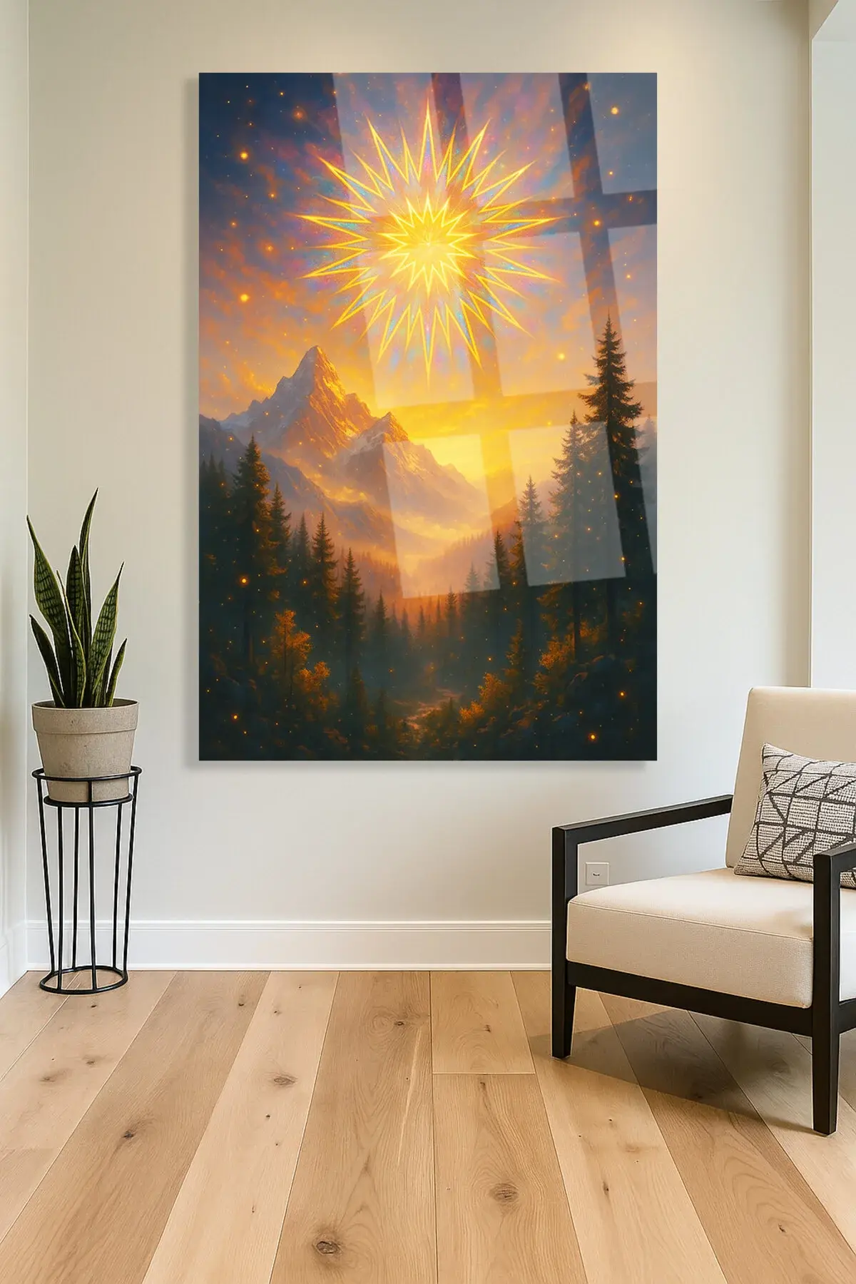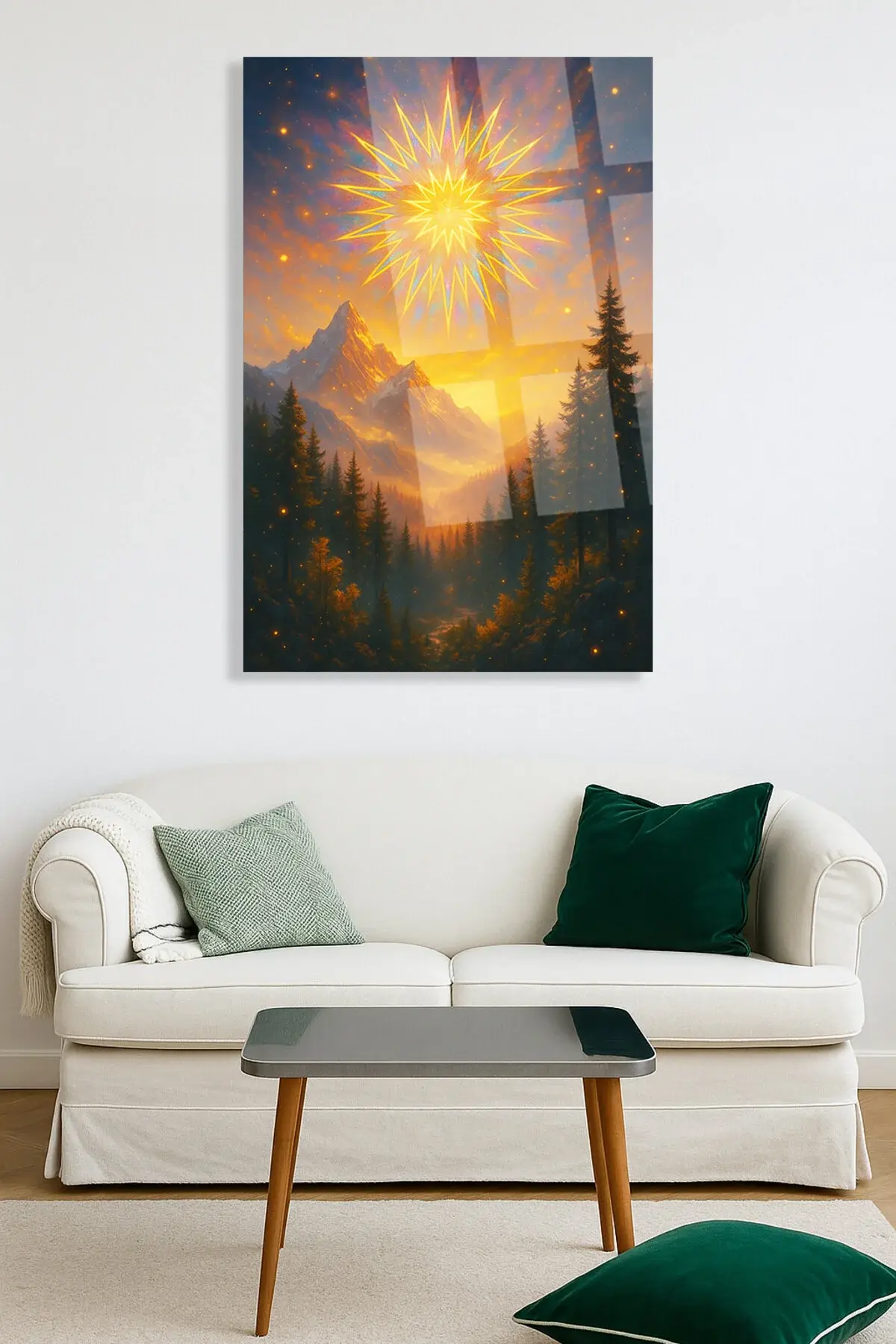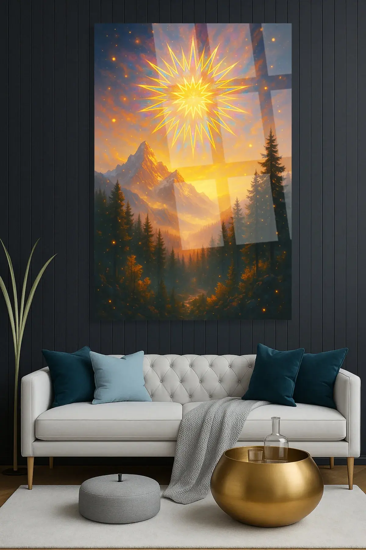Altın Işıklar Altında – Büyülü Dağ ve Kozmik Güneş Manzarası KIRILMAZ CAM TABLO LÜKS HEDİYE Sarı