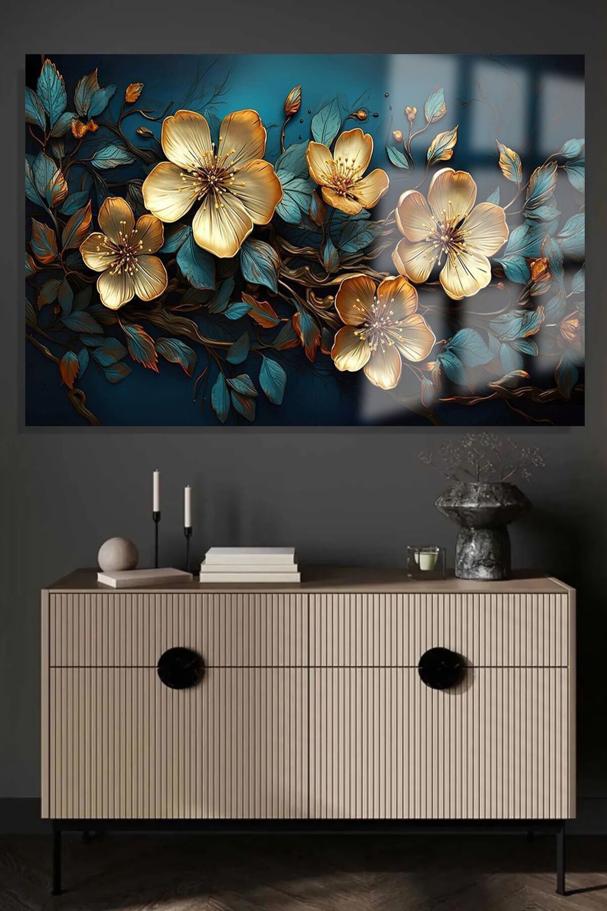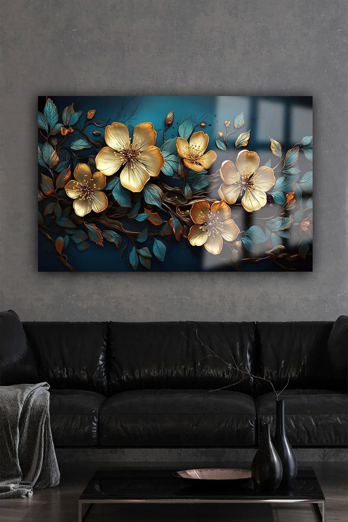 ALTIN LİLYUM ZAMBAK YATAY ÇİÇEK KIRILMAZ LÜKS CAM TABLO OF İŞ YERİ EV HEDİYESİ CAM TABLO