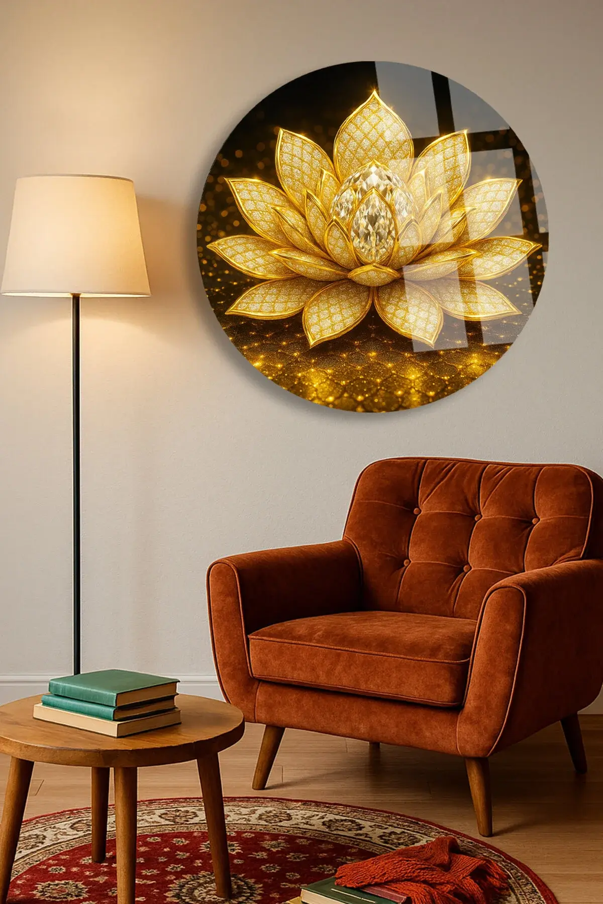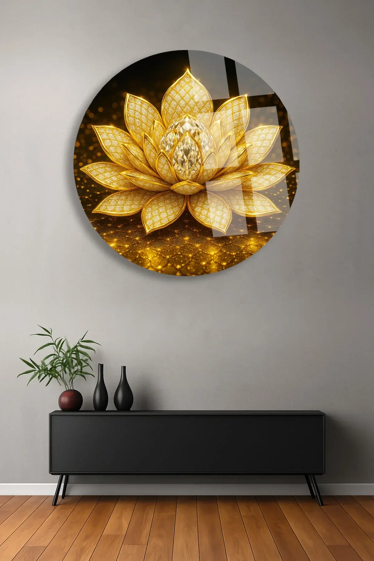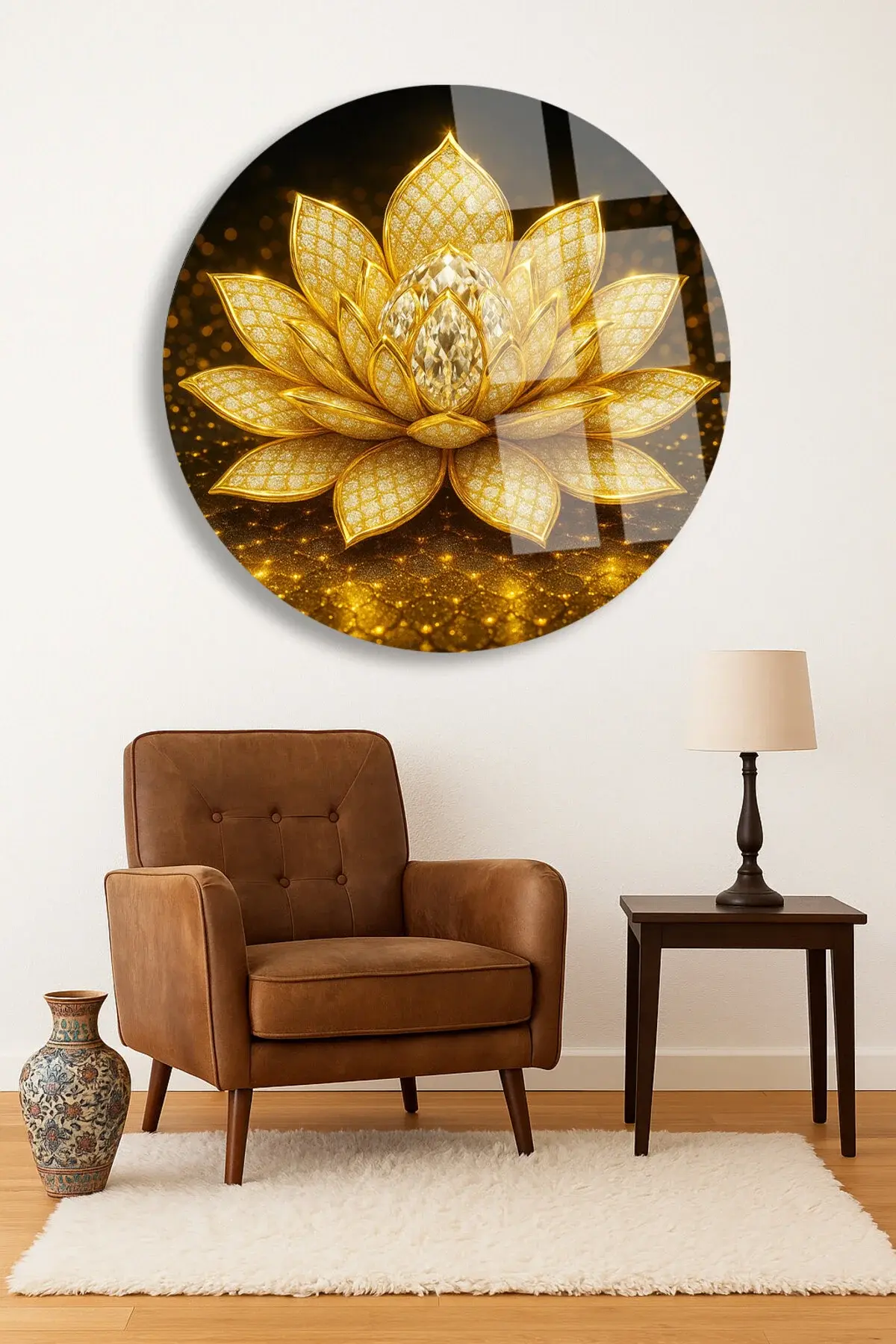 ALTIN LOTUS ÇİÇEĞİ ULRTA CANLI RENKLER KIRILMAZ LÜKS MODERN YUVARLAK CAM TABLO EV HEDİYESİ Sarı