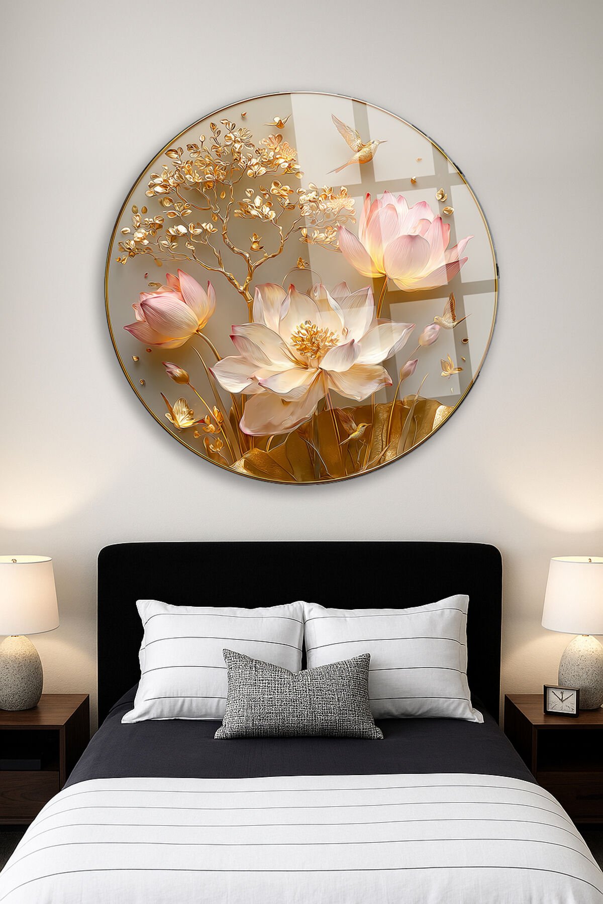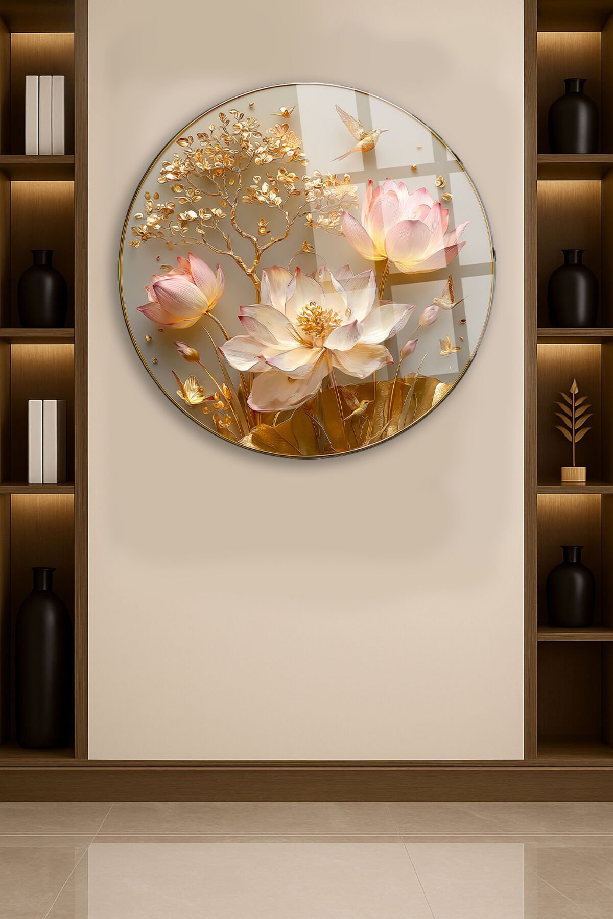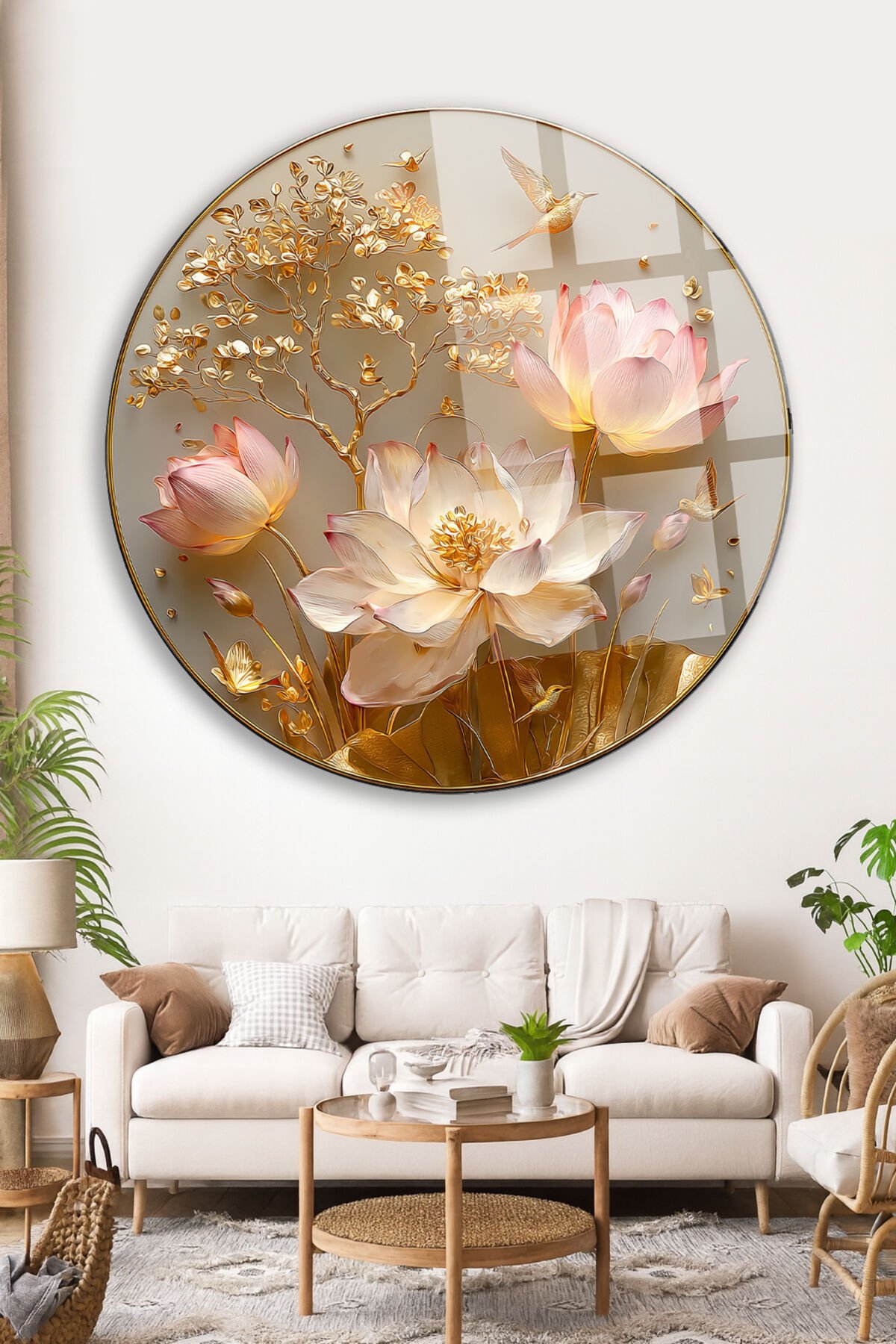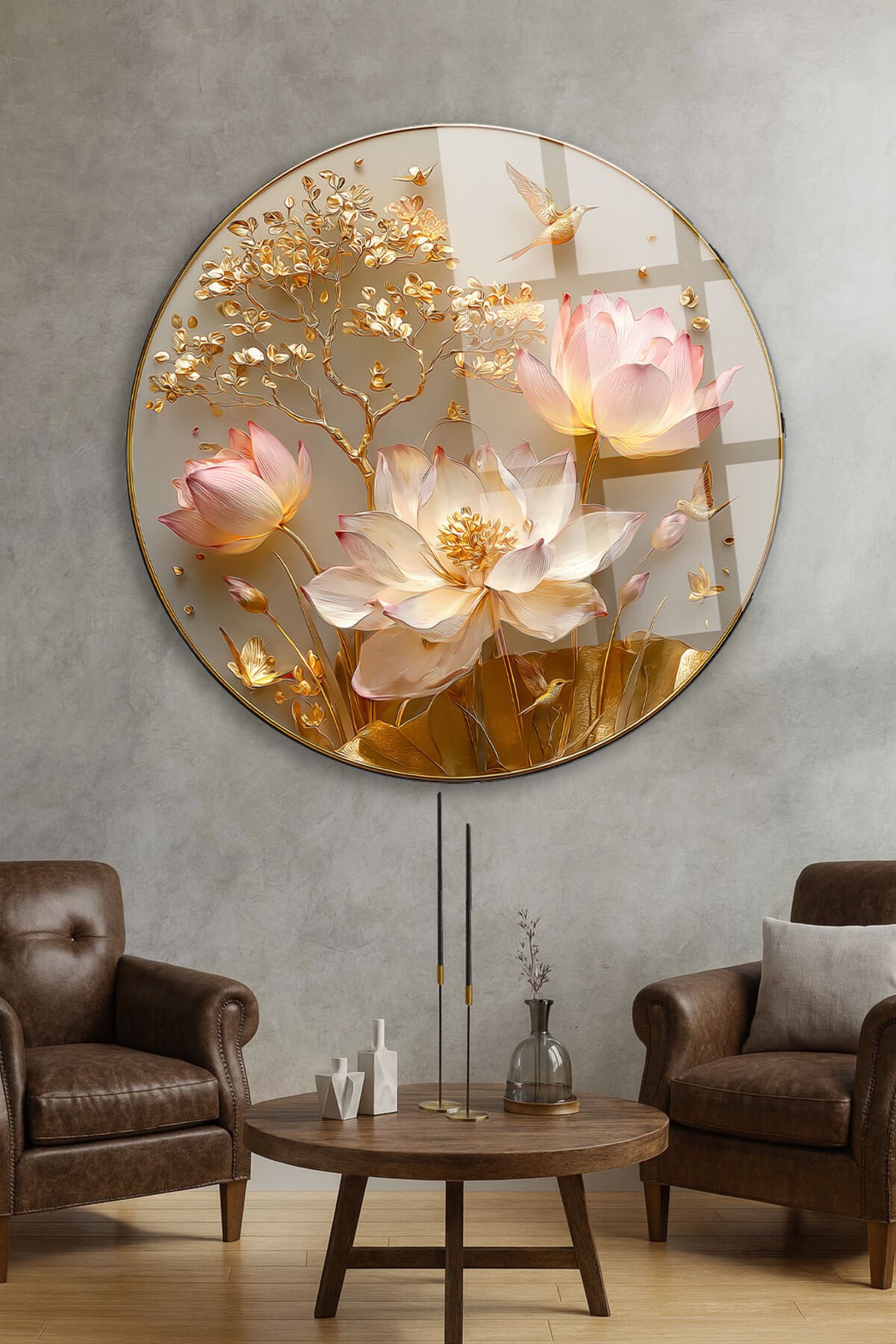 ALTIN LOTUS ÇİÇEĞİ VE KUŞ TEMALI DAİRE SANAT DEKORU KIRILMAZ LÜKS CAM TABLO Altın