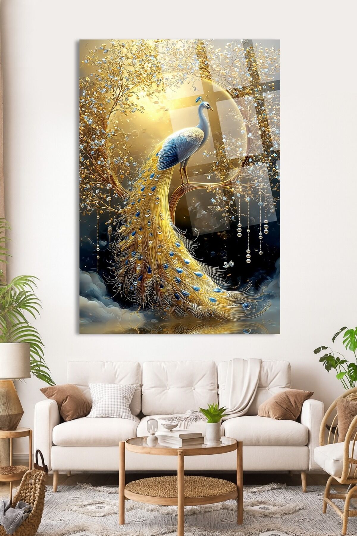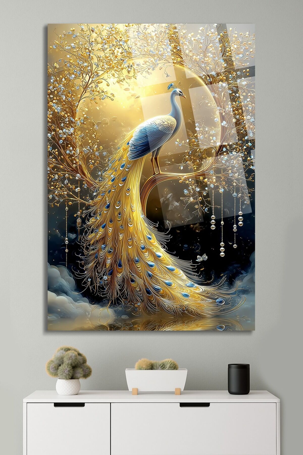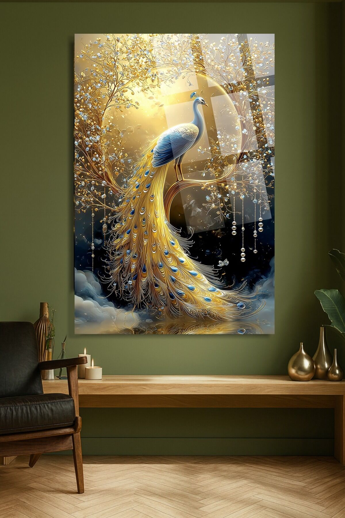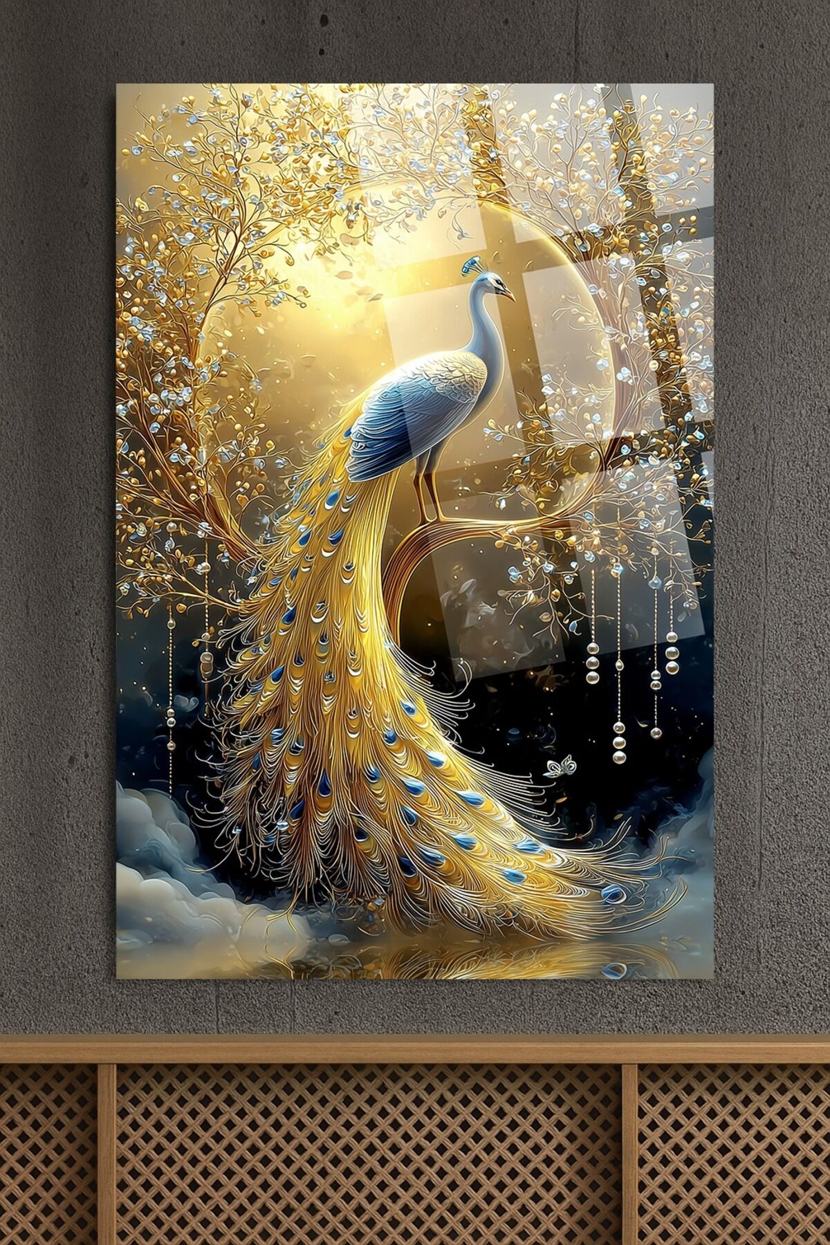ALTIN MAVİ TAVUS KUŞU DESEN LÜKS SANATSAL EV HEDİYESİ TABLO KIRILMAZ CAM TASARIM Altın