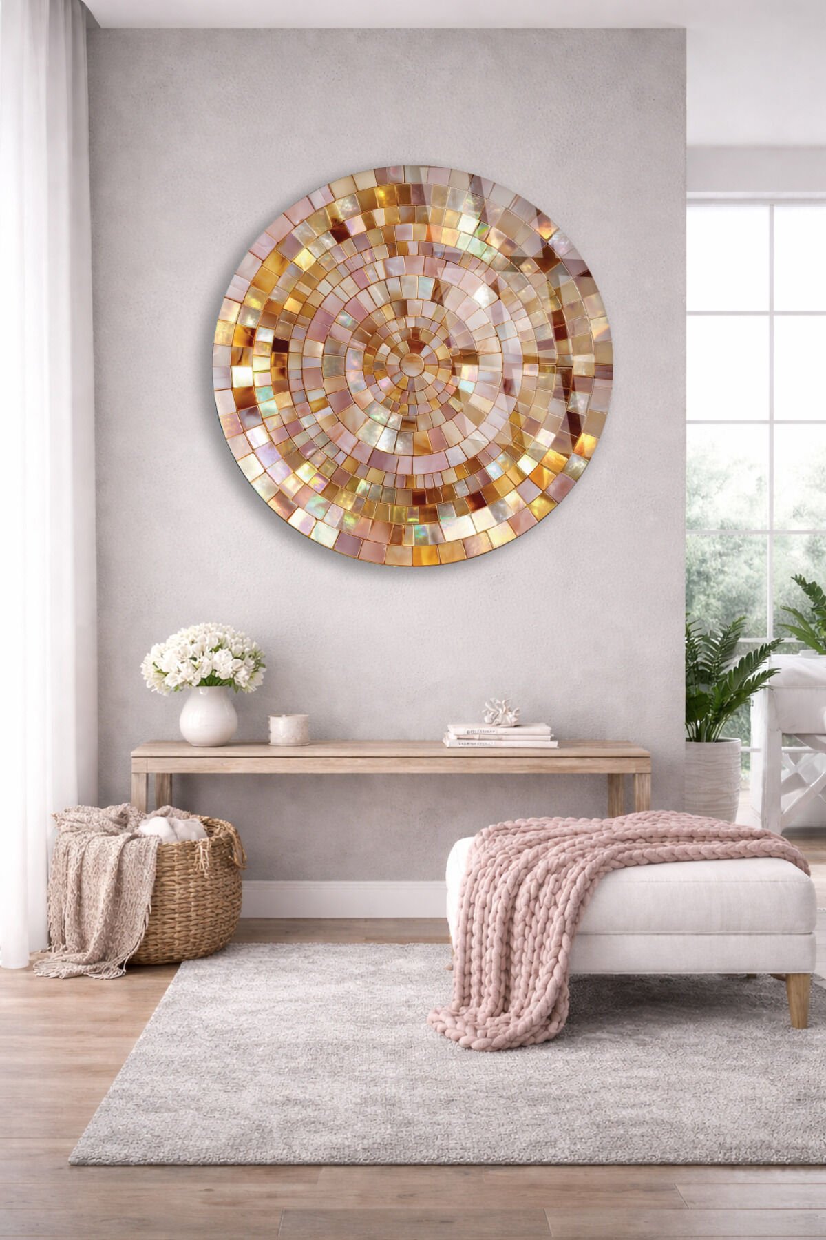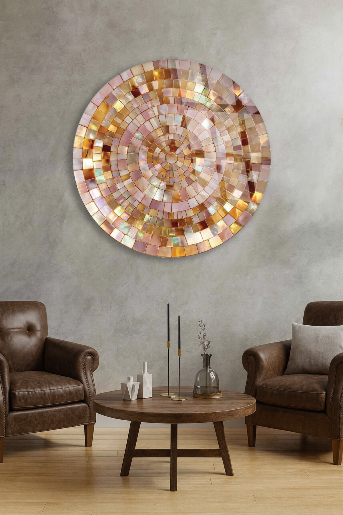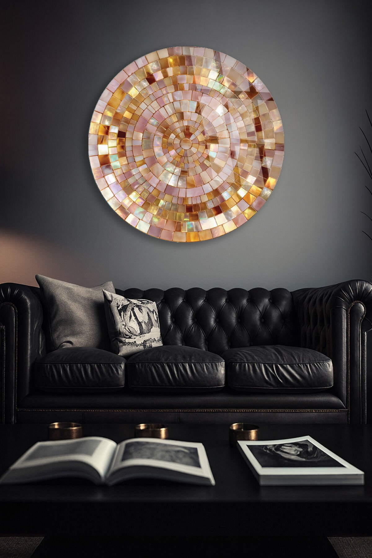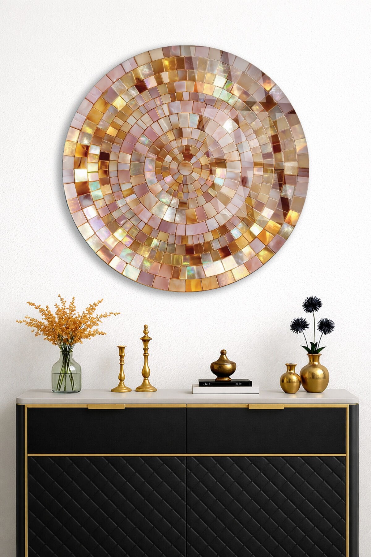 Altın Mozaik Desenli Cam Tablo – Lüks Yuvarlak Duvar Dekoru Gümüş
