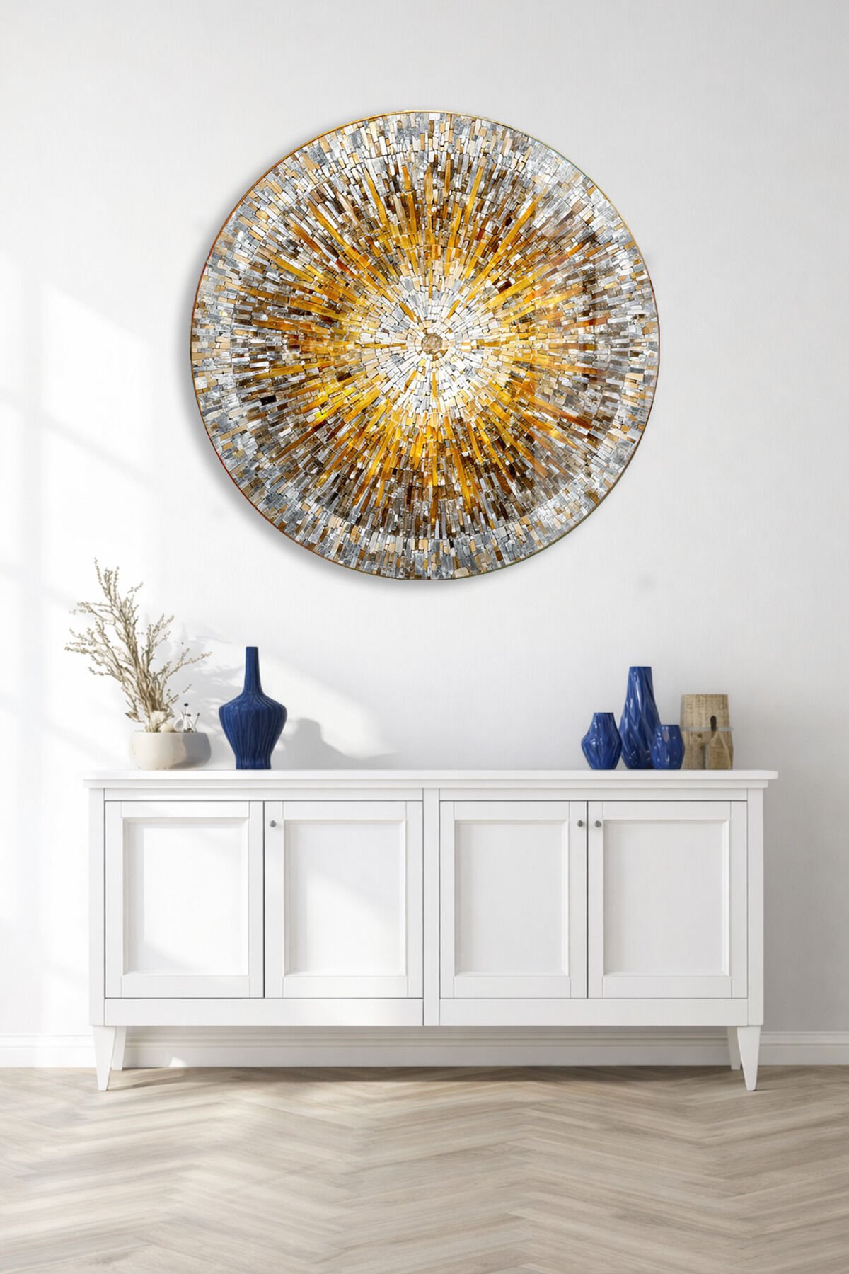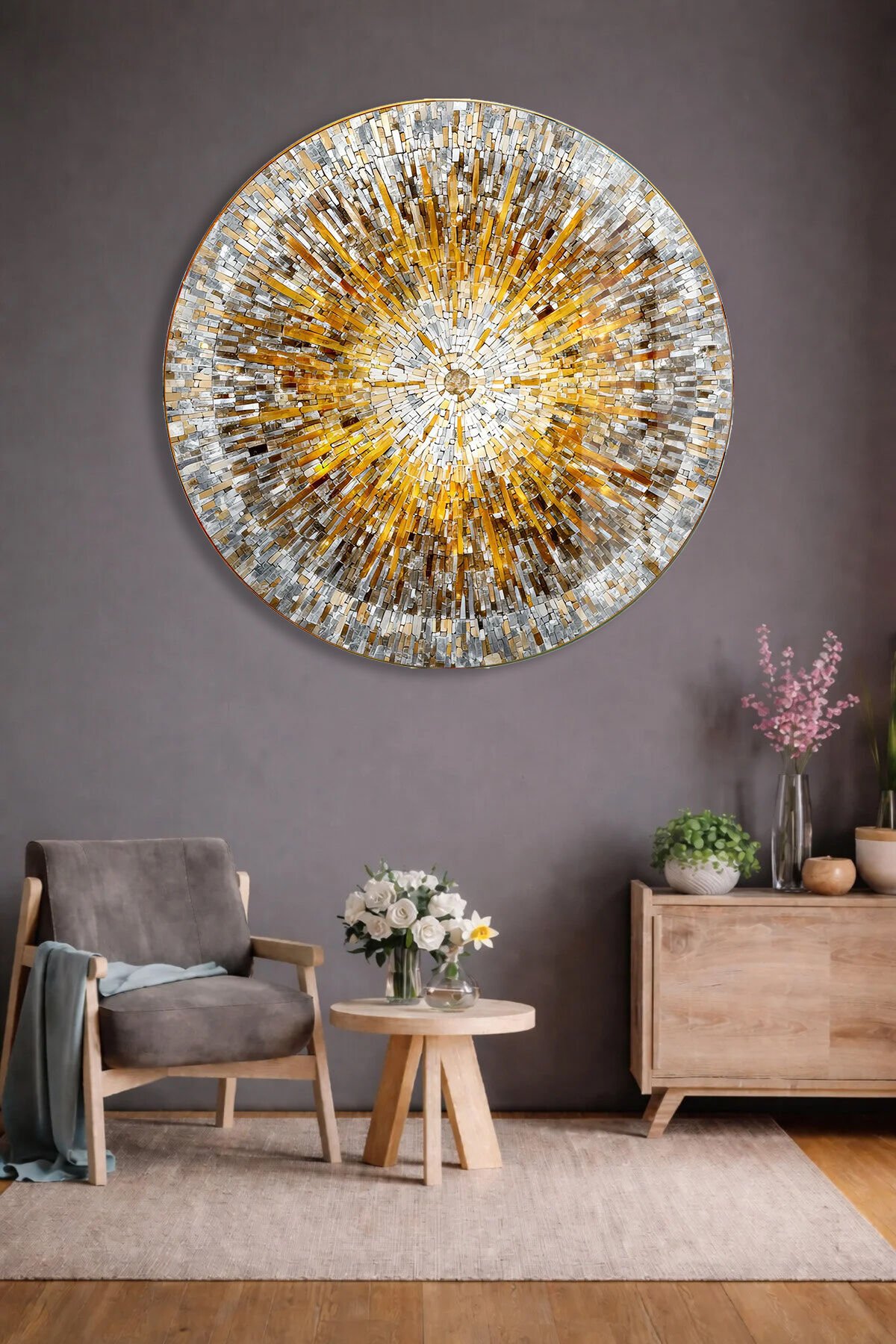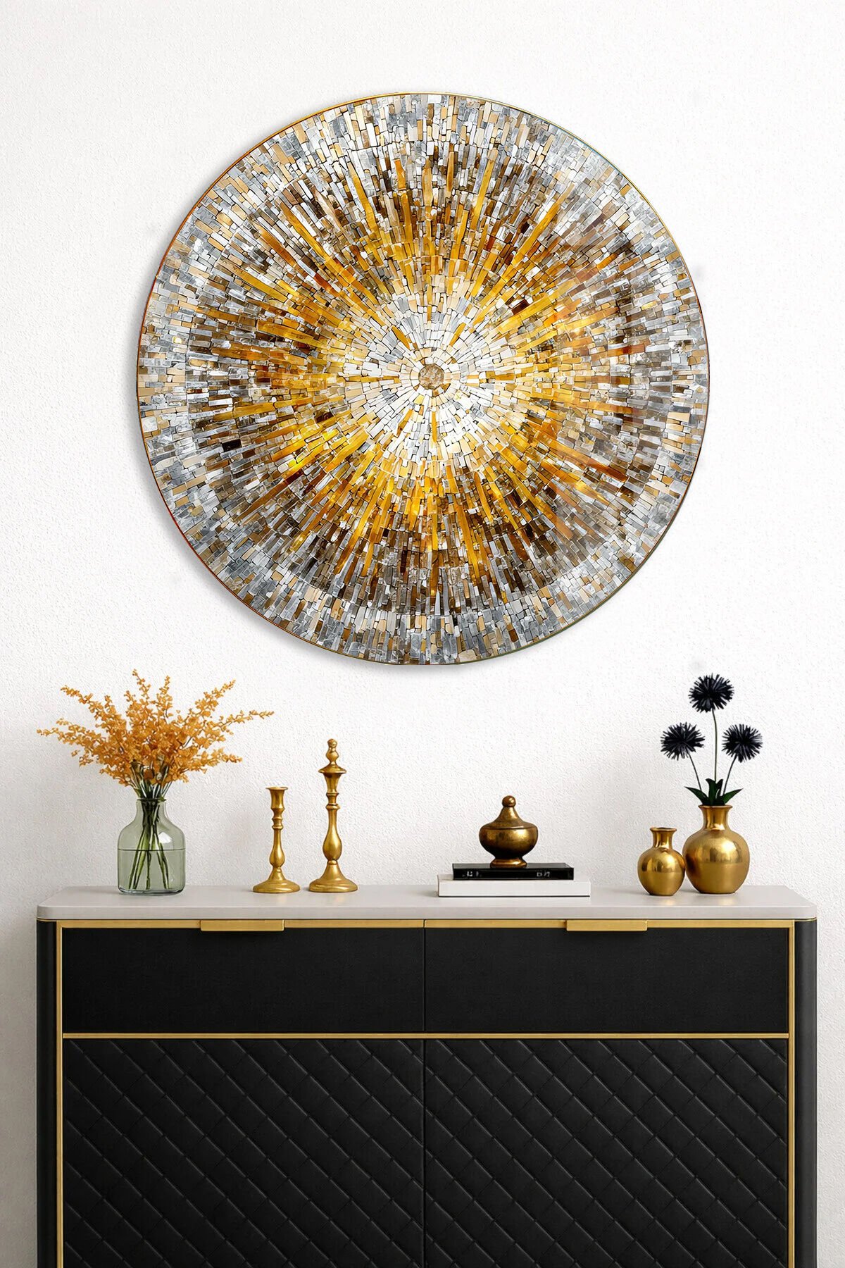 ALTIN MOZAİK DESENLİ YUVARLAK GERÇEK KIRILMAZ CAM TABLO ULTRA CANLI RENKLER EV OFİS HEDİYESİ Altın