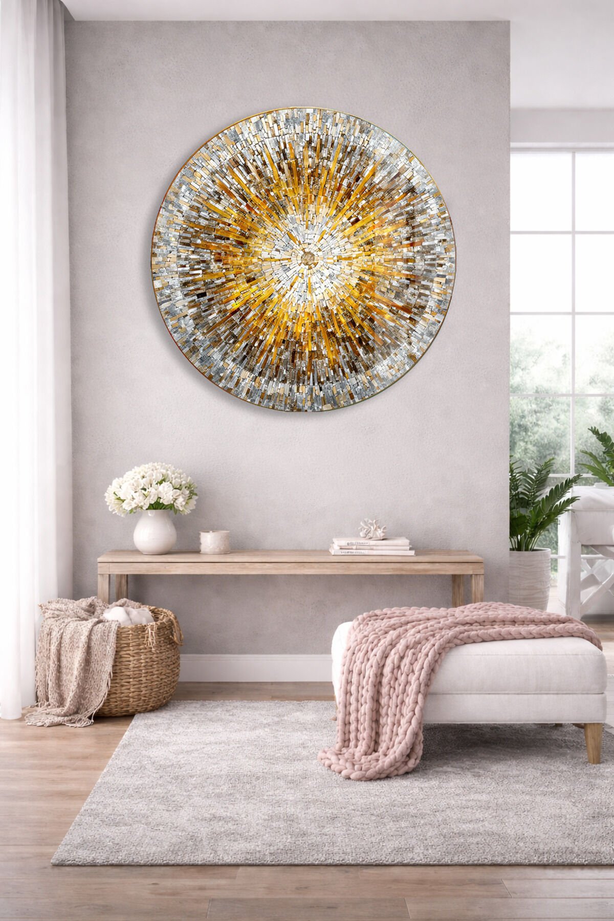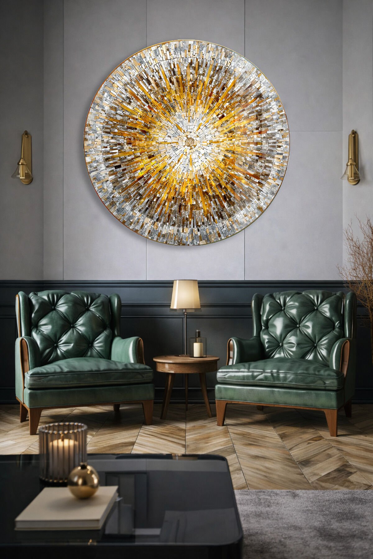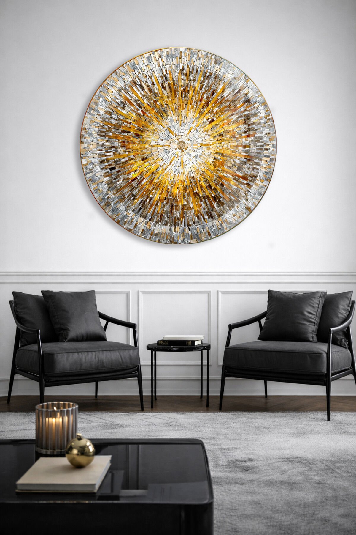 ALTIN MOZAİK DESENLİ YUVARLAK GERÇEK KIRILMAZ CAM TABLO ULTRA CANLI RENKLER EV OFİS HEDİYESİ Altın