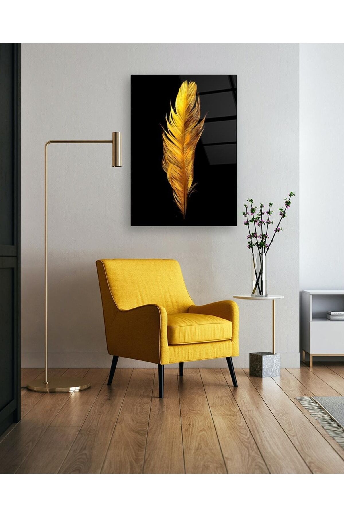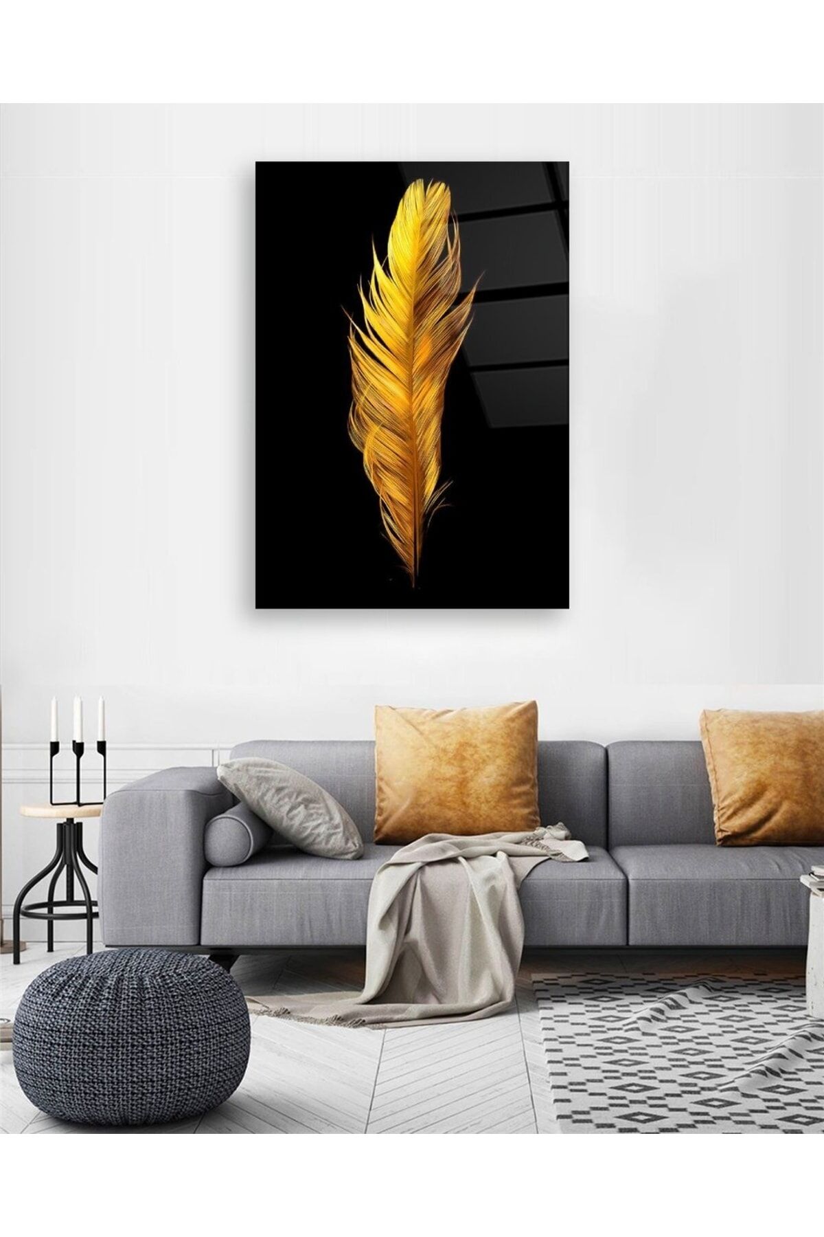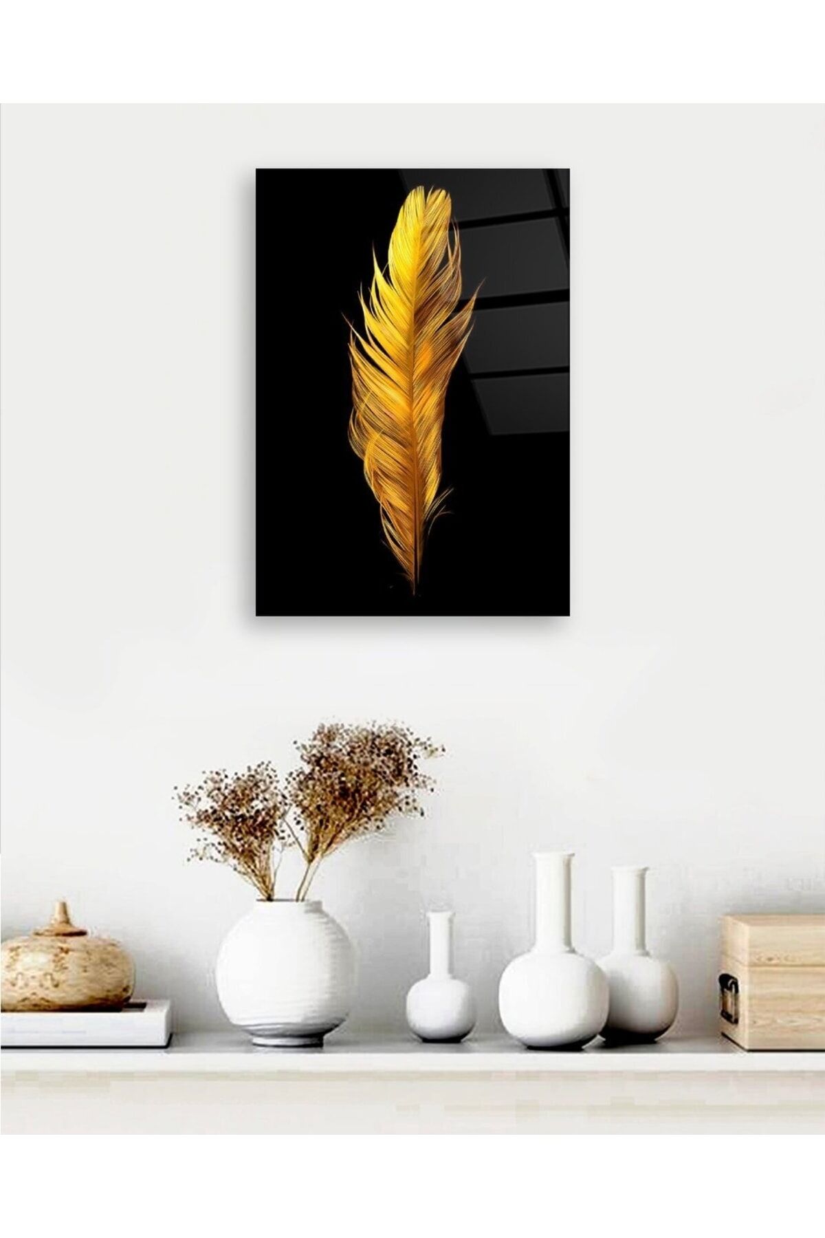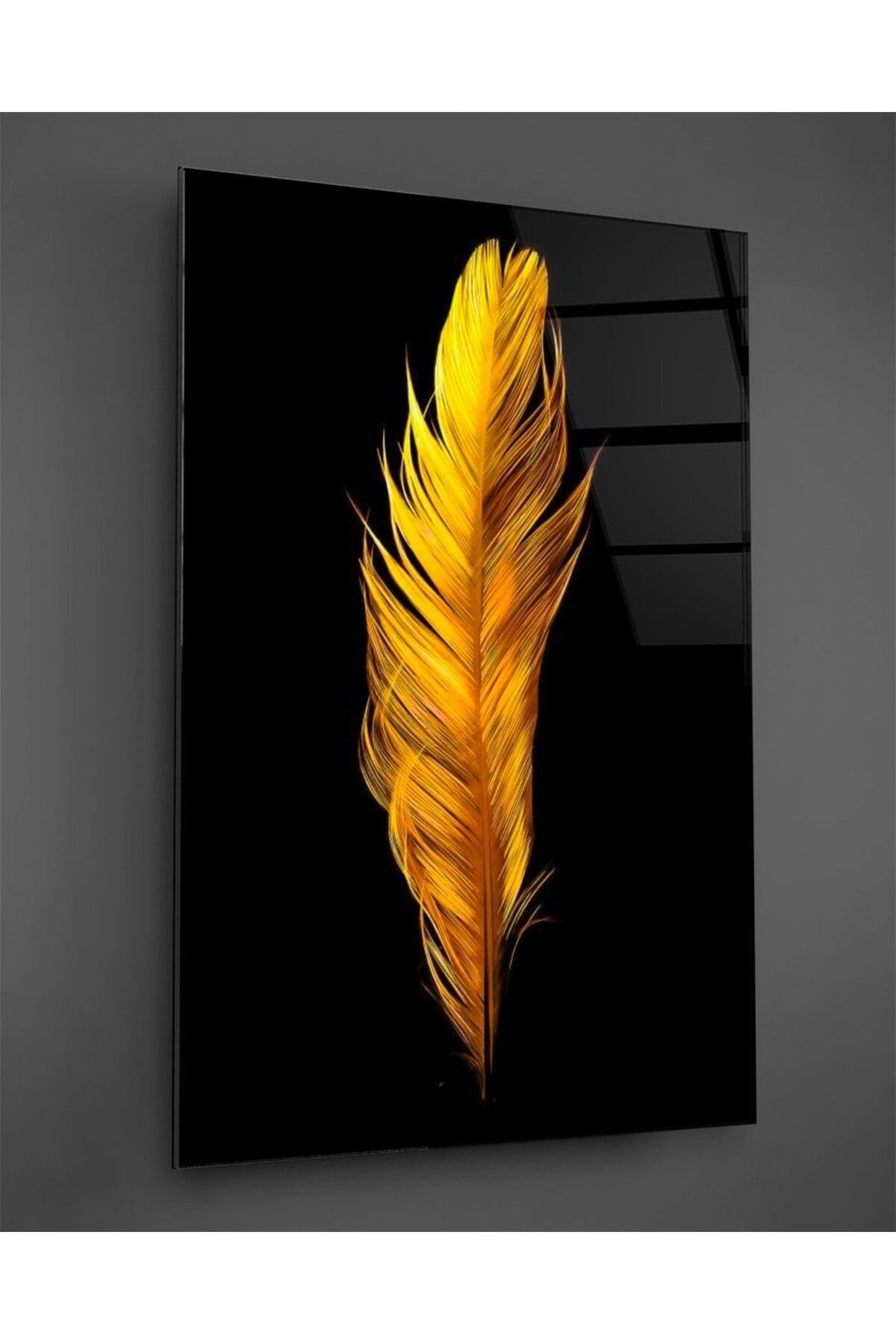 Altın Renkli Kuş Tüyü Cam Tablo Renkli