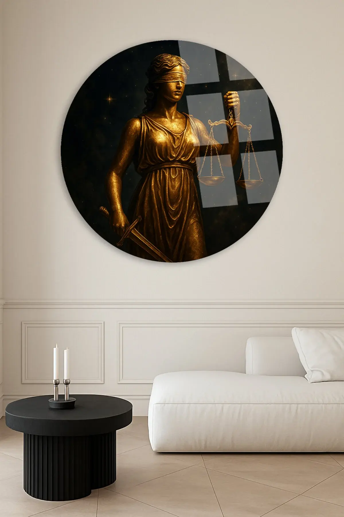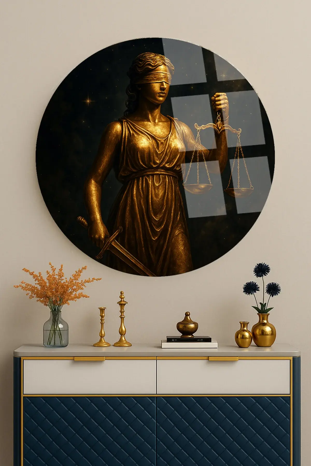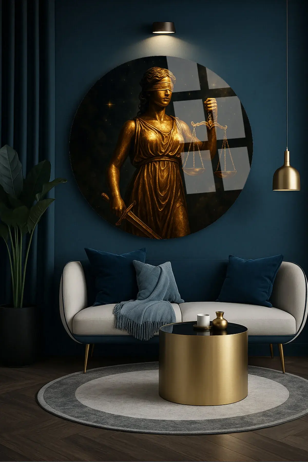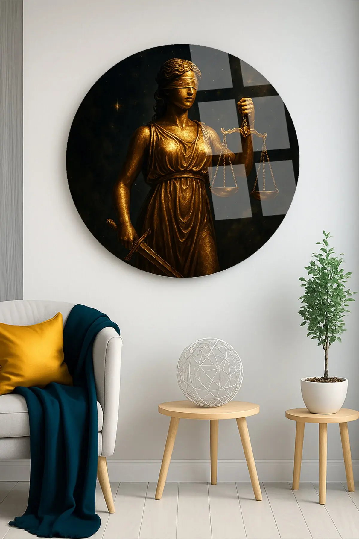 ALTIN THEMİS HEYKELİ TASARIMI AVUKAT TABLOSU MODERN YUVARLAK KIRILMAZ CAM TABLO LÜKS HEDİYE TABLO Sarı