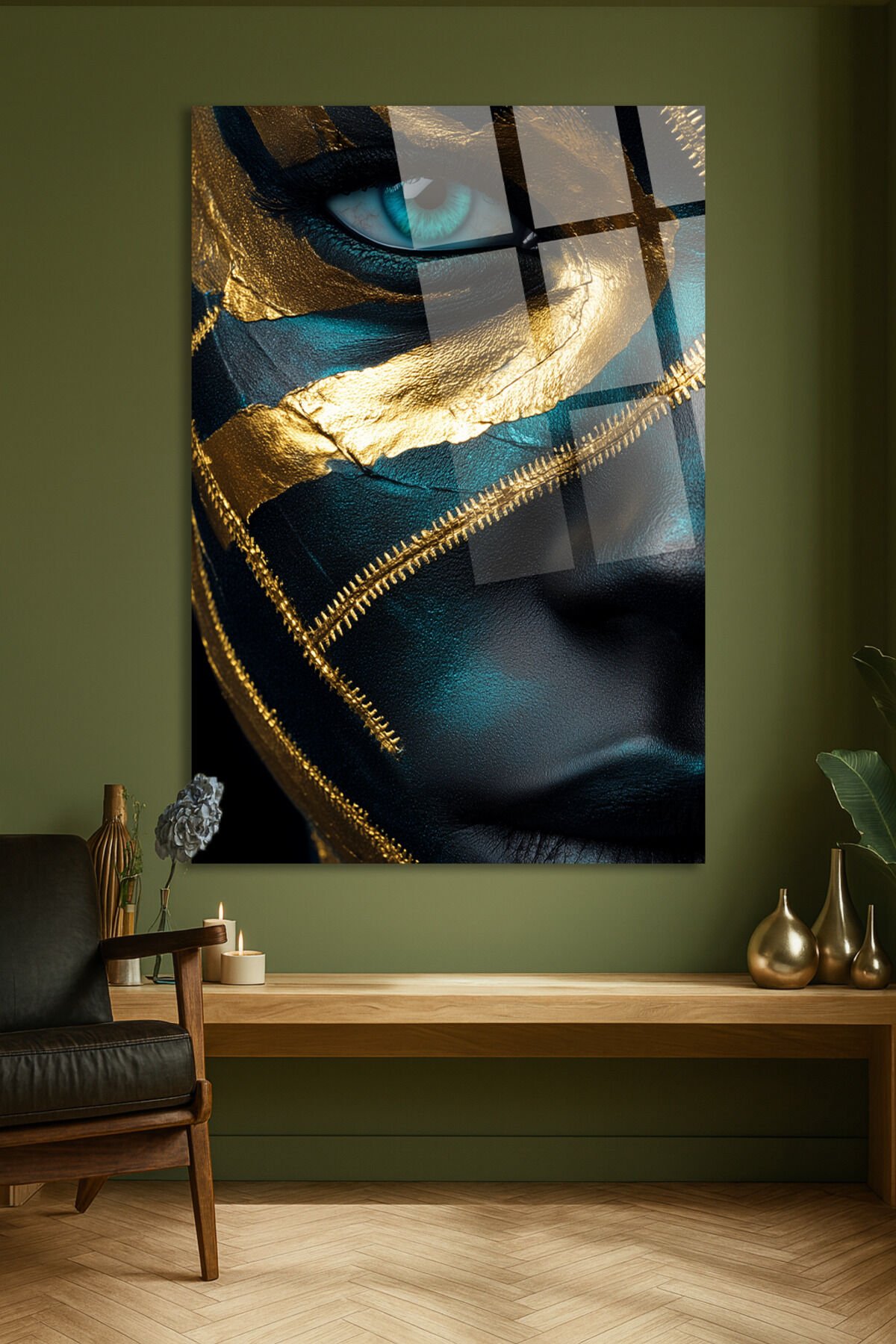 ALTIN VE TURKUAZ YÜZ DETAYLI SANATSAL CAM TABLO Turkuaz