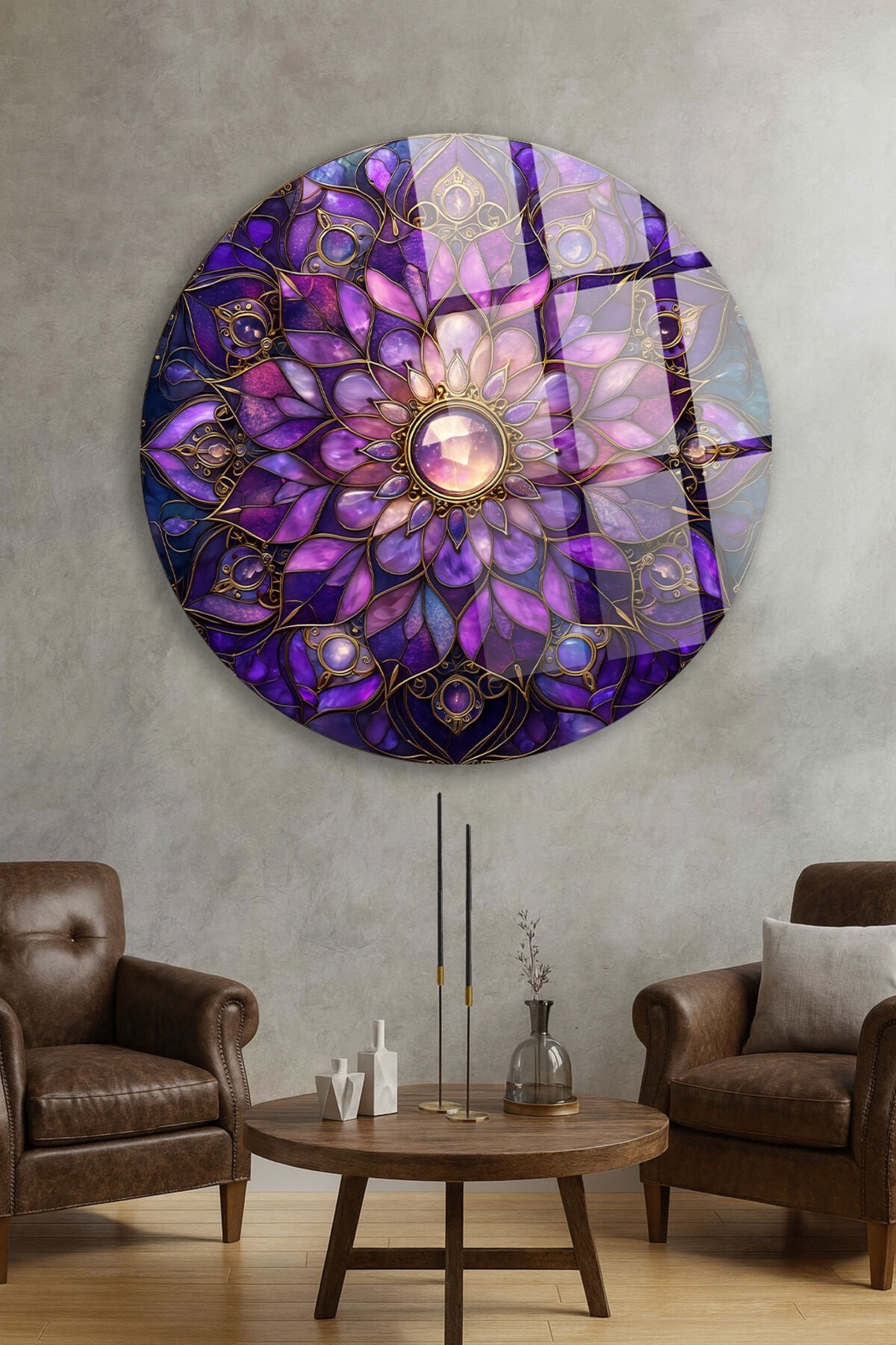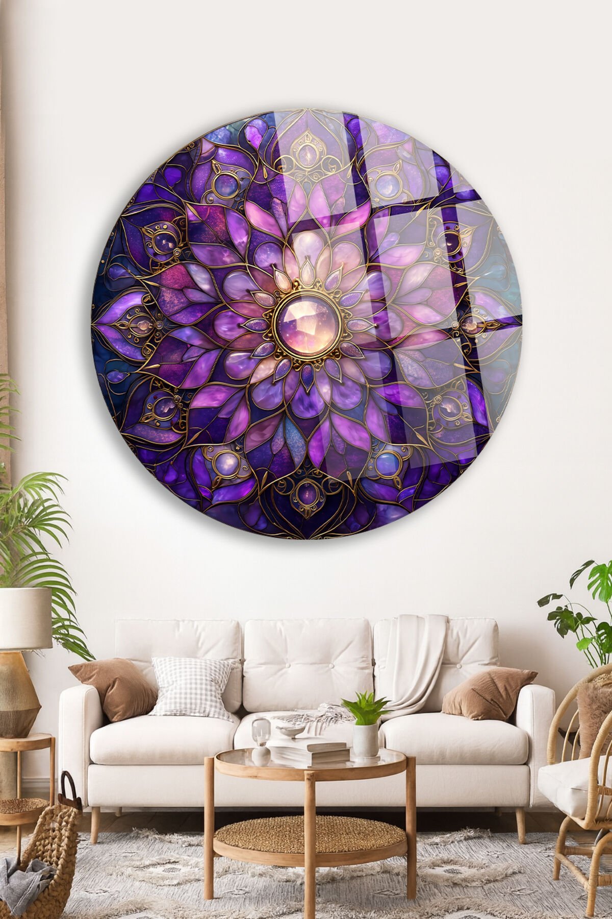 AMETİST MOR MANDALA VİTRAY DESEN DAİRE PARILTILI KIRILMAZ LÜKS CAM TABLO Mor