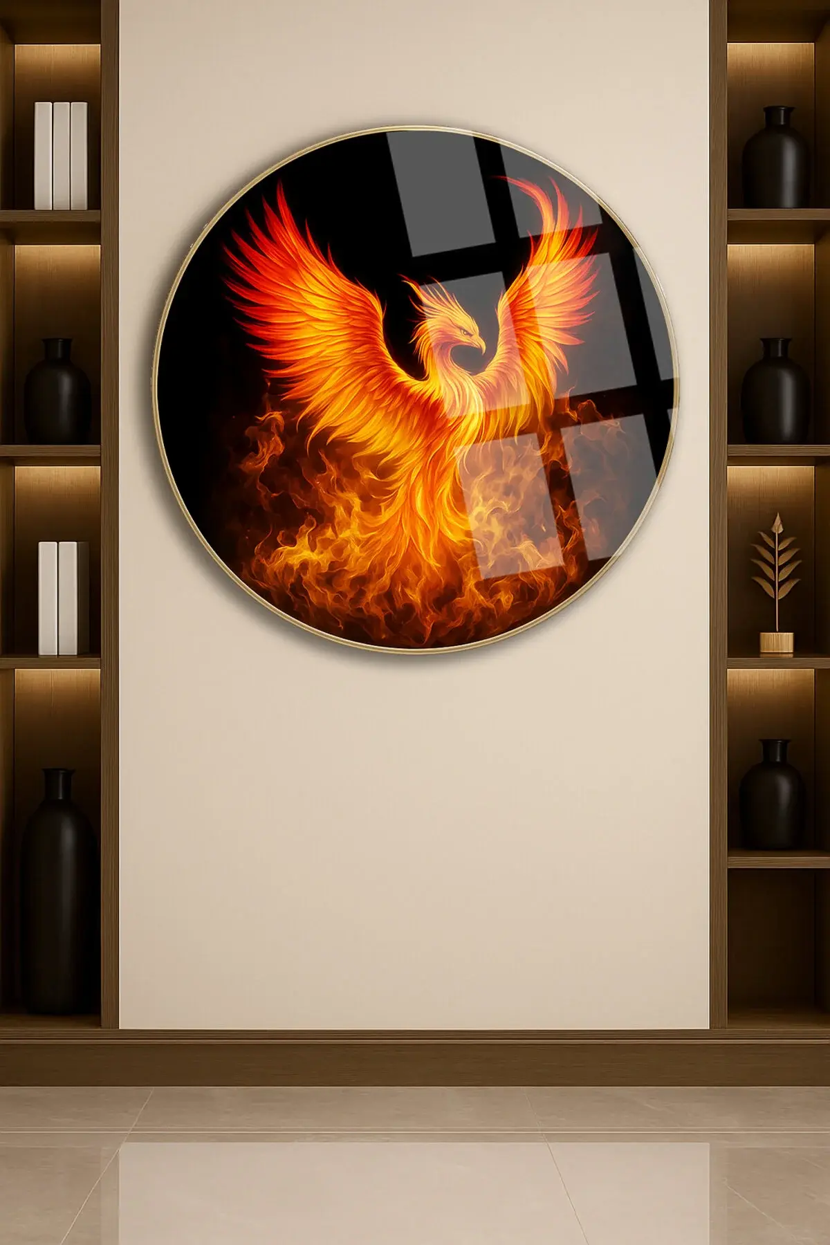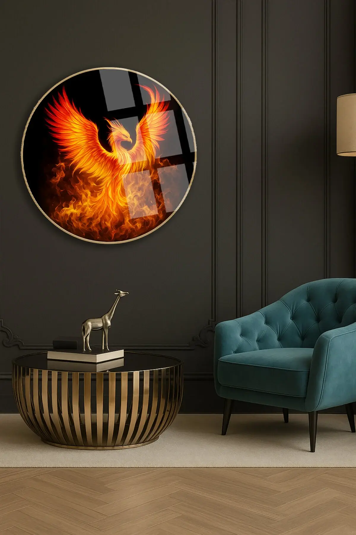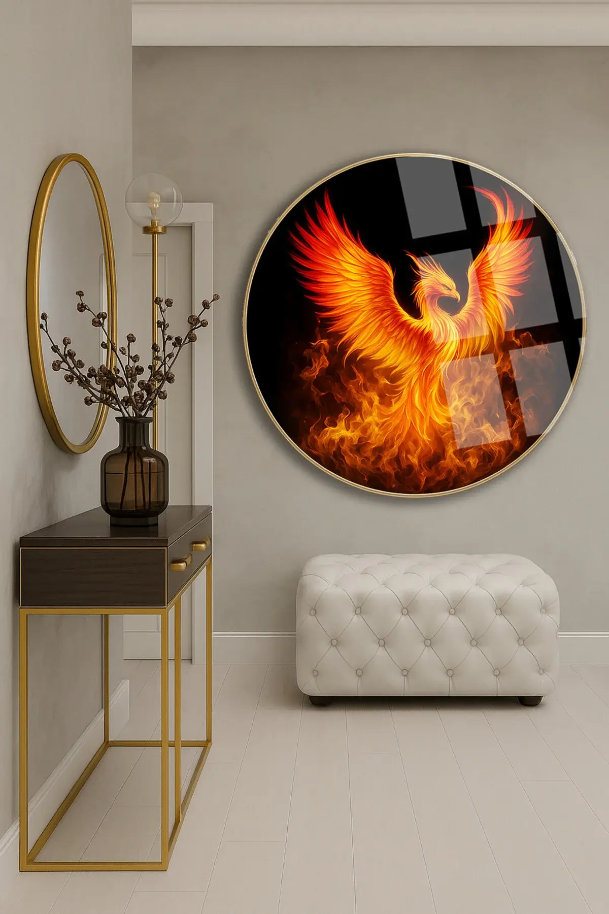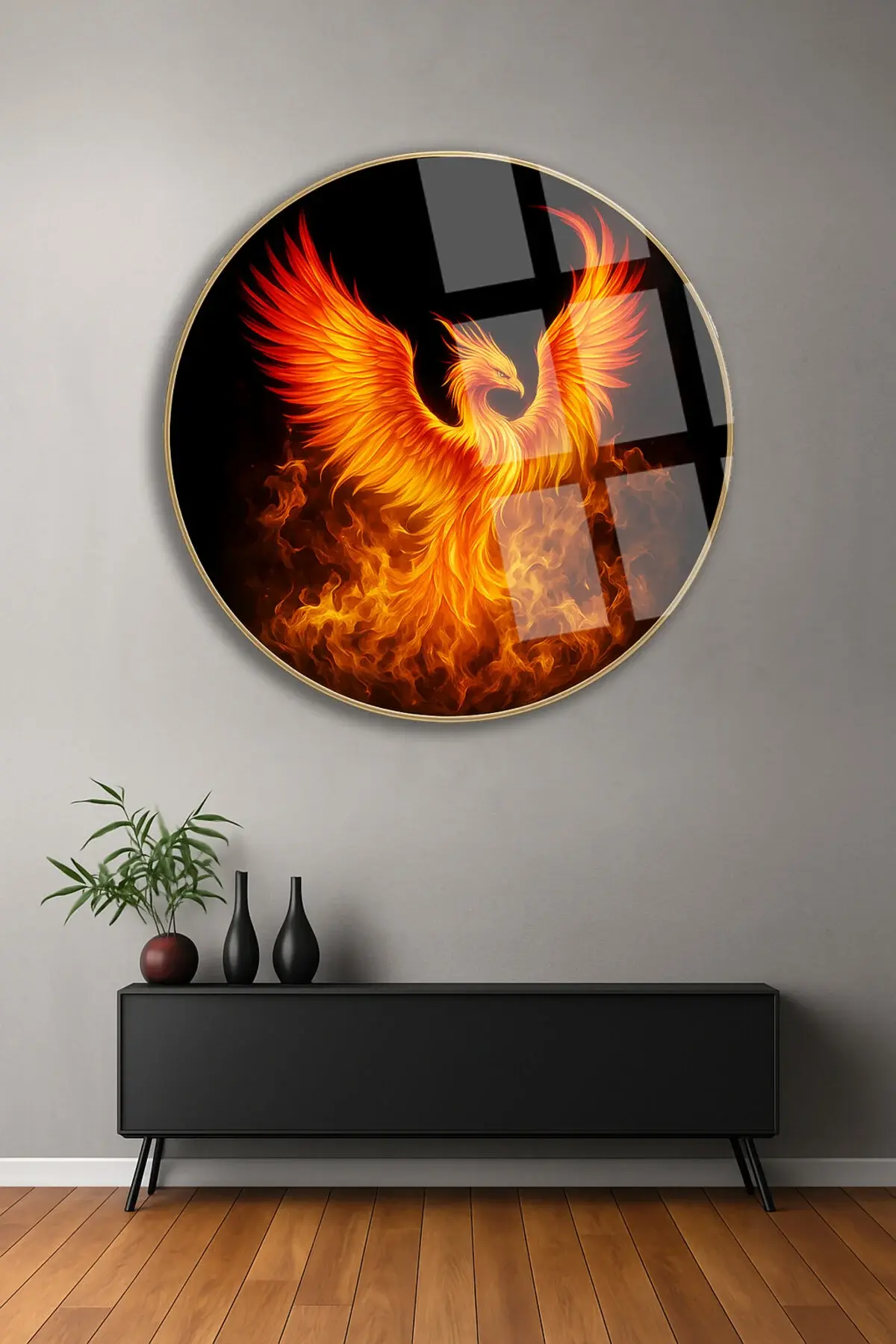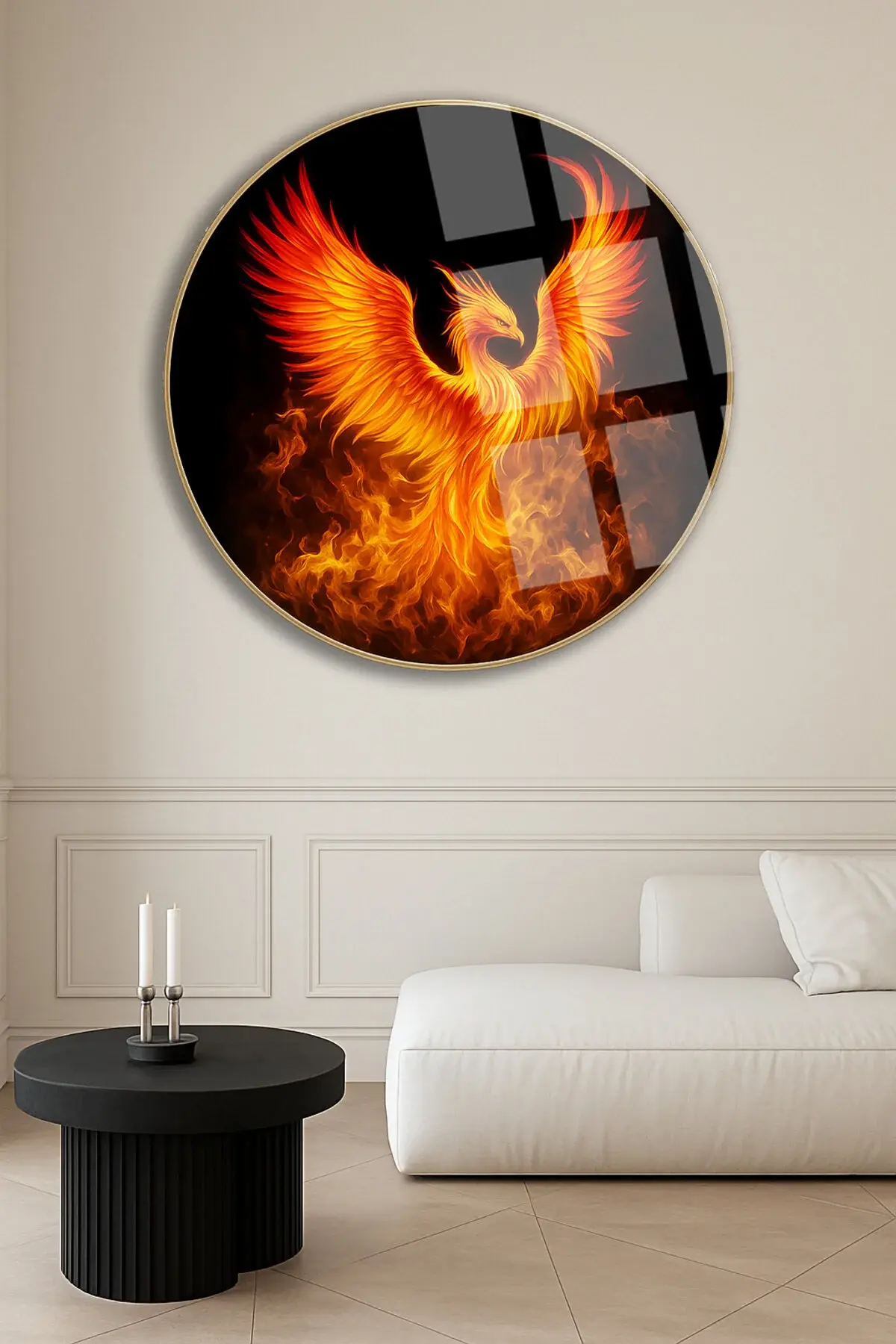 ANKA KUŞU MODERN TABLO KIRILMAZ LÜKS CAM TABLO YUVARLAK CAM TABLO EV HEDİYESİ Turuncu