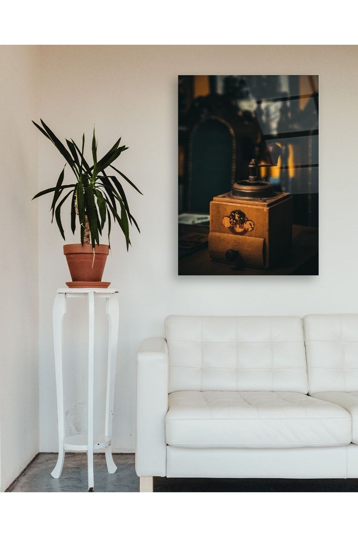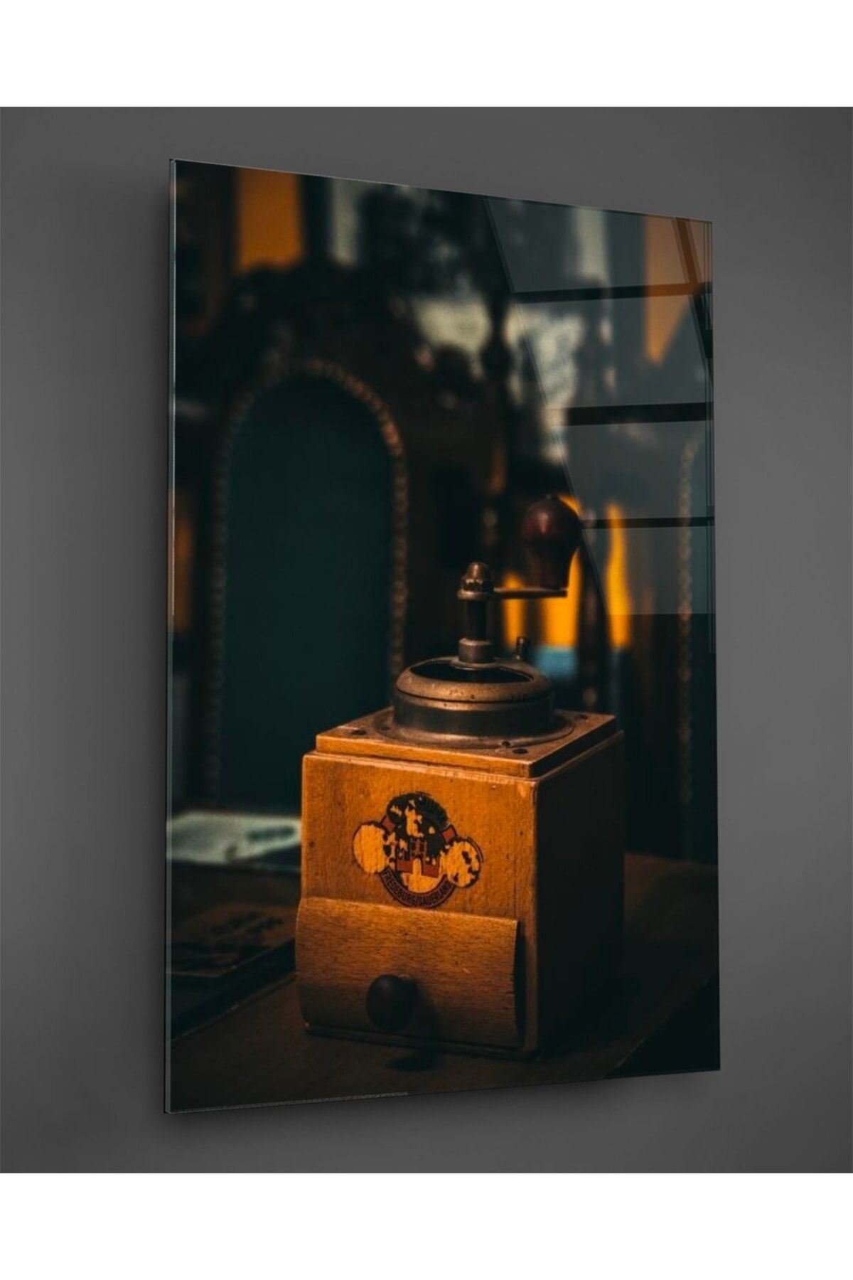 Antika Kahve Değirmeni Dikey Cam Tablo Renkli