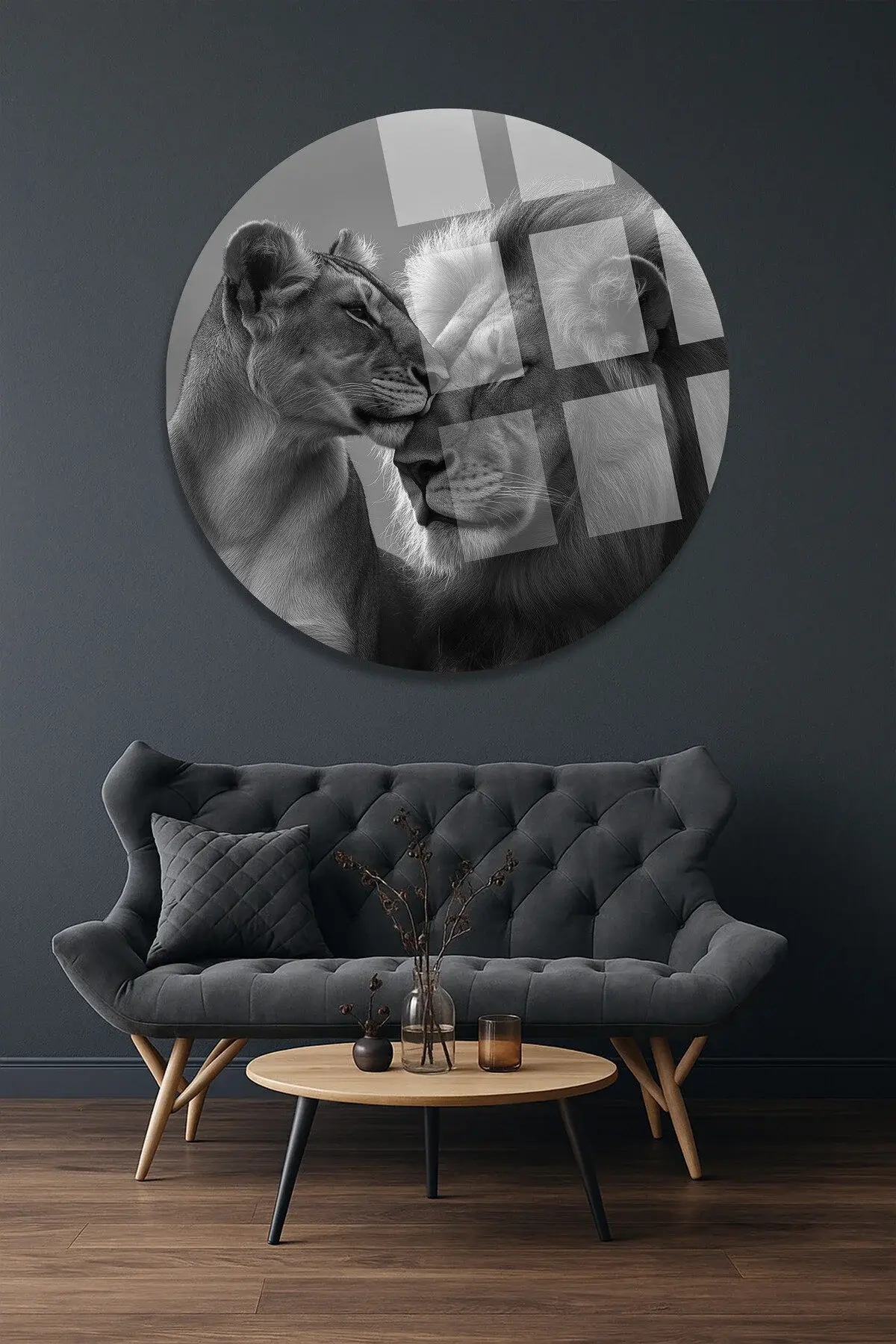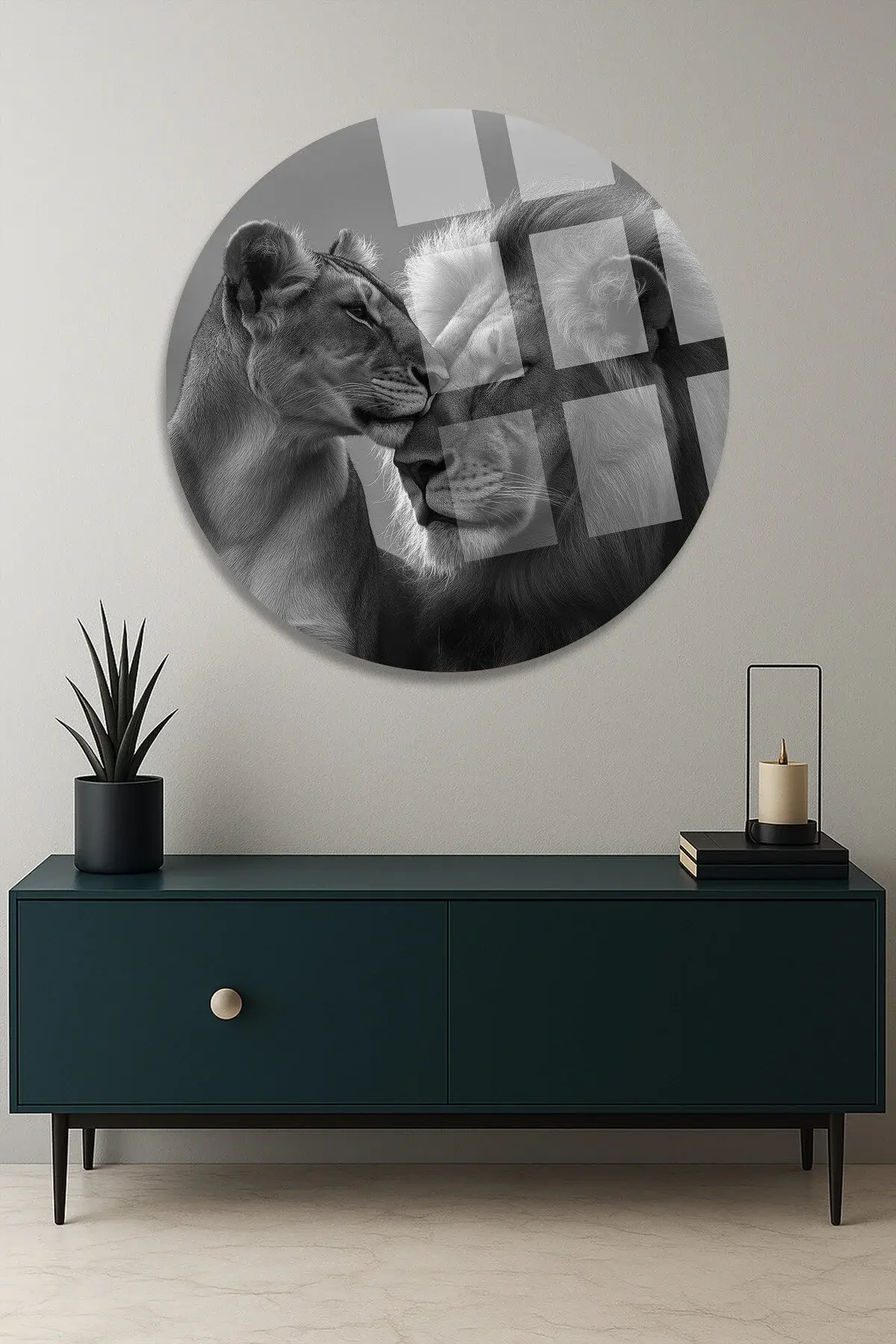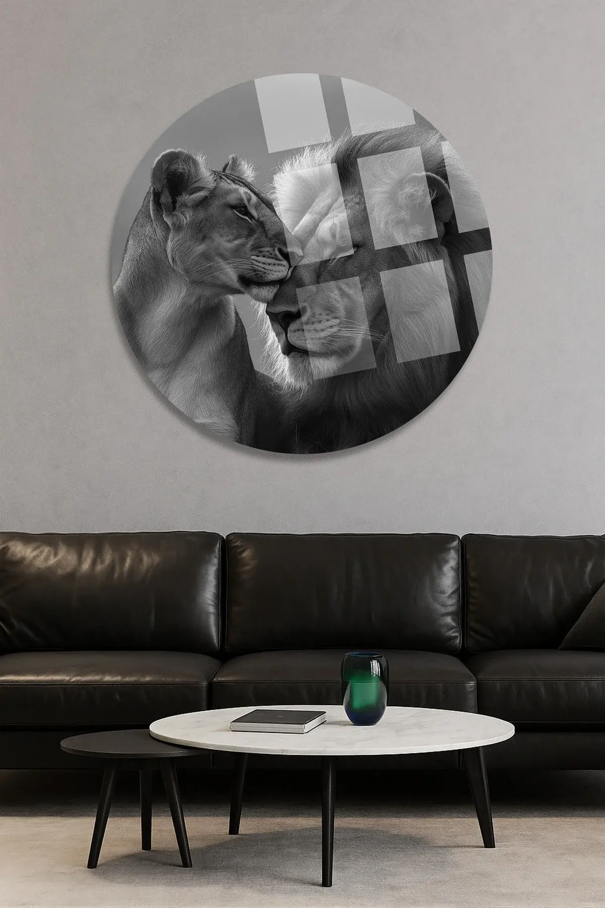 ASLAN AİLESİ SİYAH BEYAZ YUVARLAK CAM TABLO KIRILMAZ ULTRA CANLI RENKLİ CAM TABLO EV HEDİYESİ Siyah