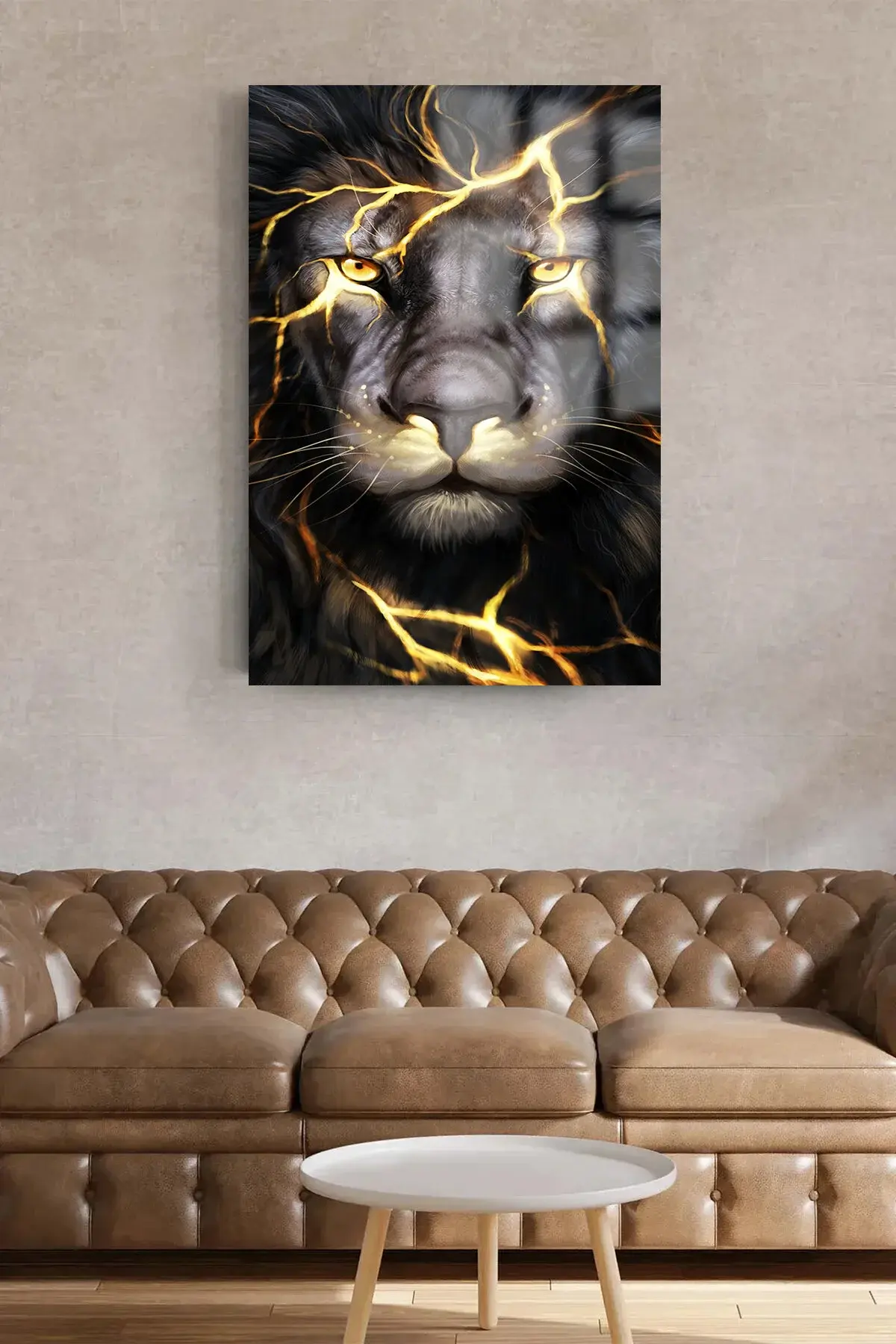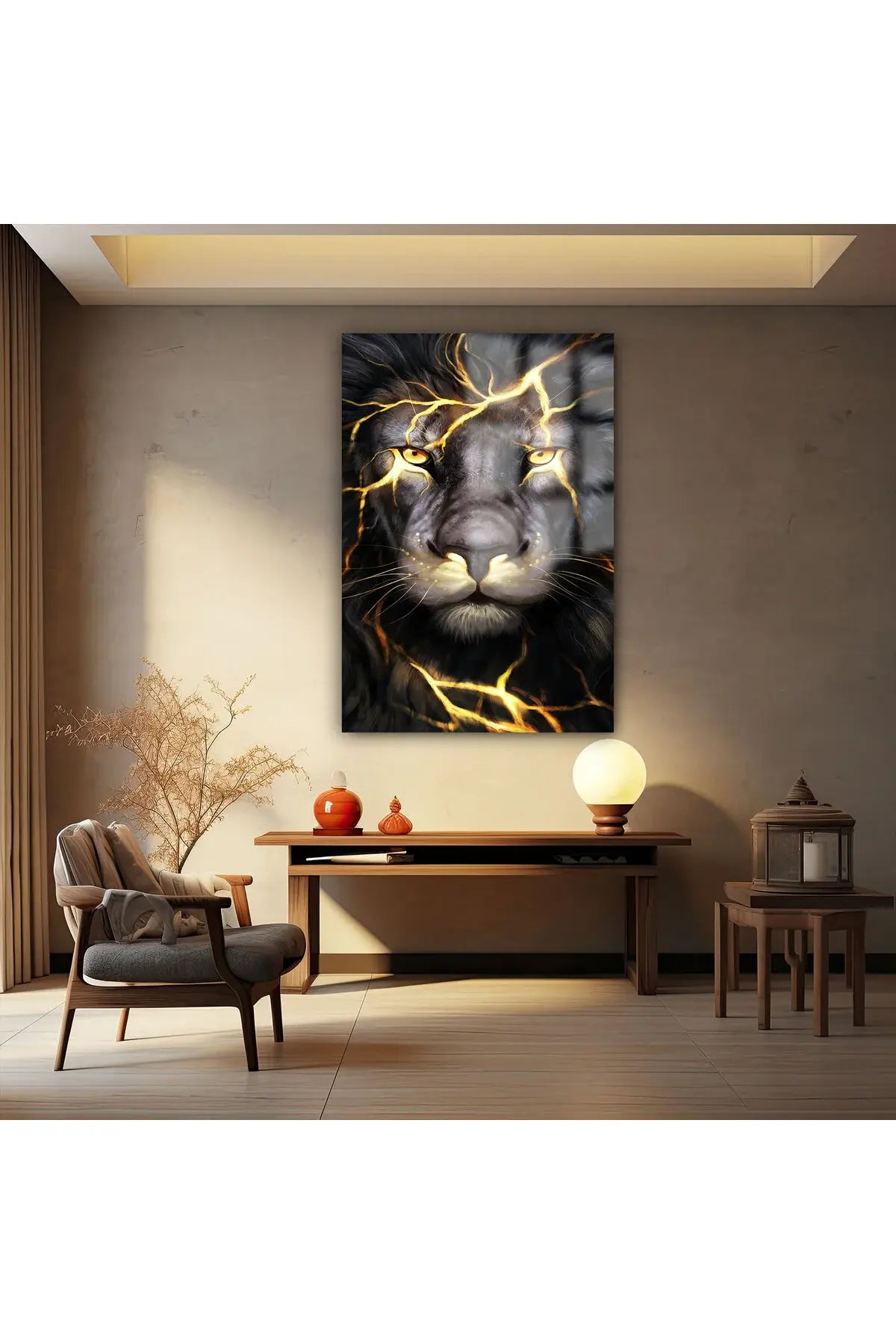 ASLAN CAM TABLO ATEŞ DETAYLI ULTRA CANLI RENKLİ KIRILMAZ CAM TABLO EV ,İŞ YERİ HEDİYESİ Sarı