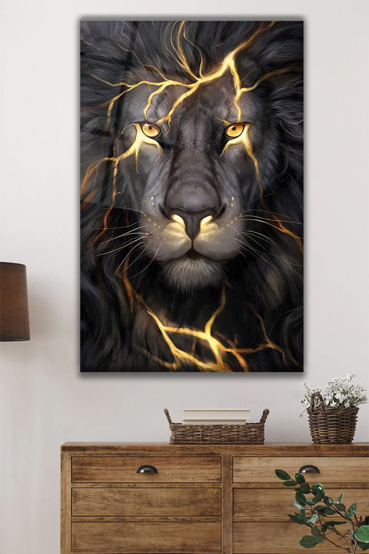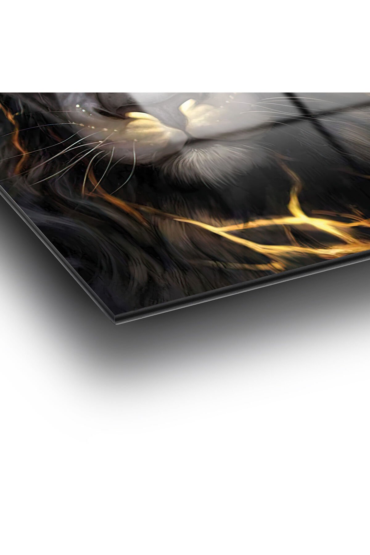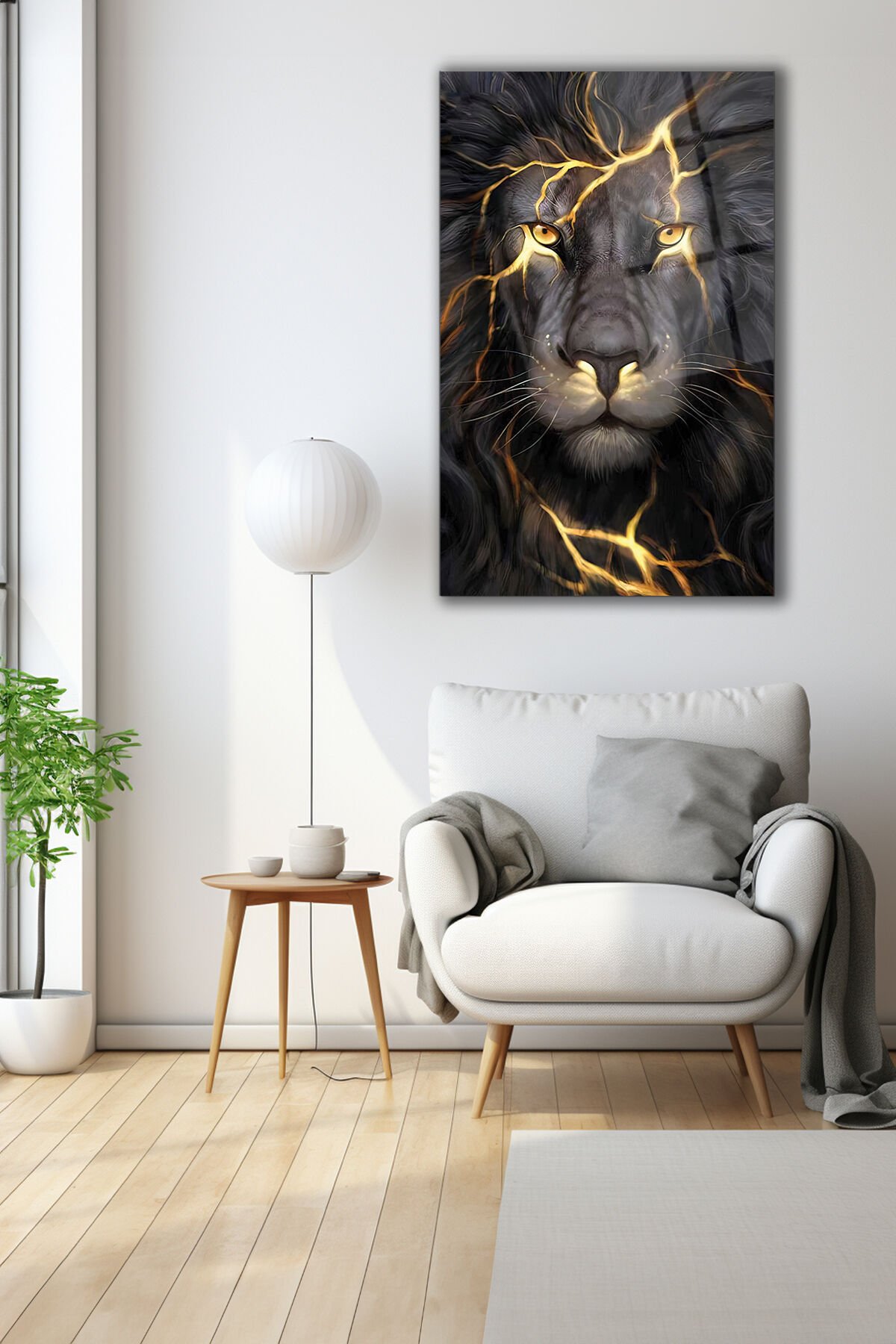 Aslan Dikey Cam Tablo Ev Ofis Salon Duvar Dekoru, Hediyelik Büyük Tablo Gri Sarı
