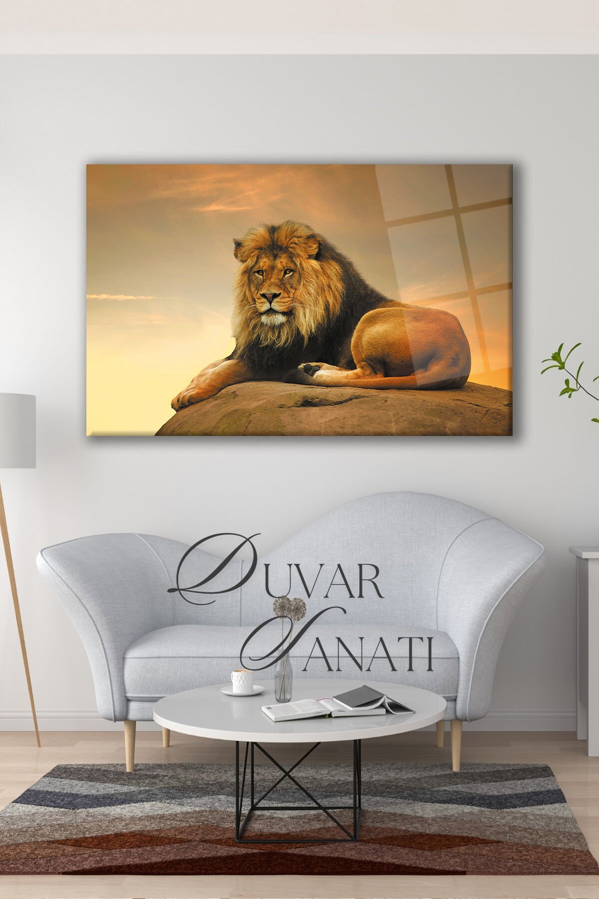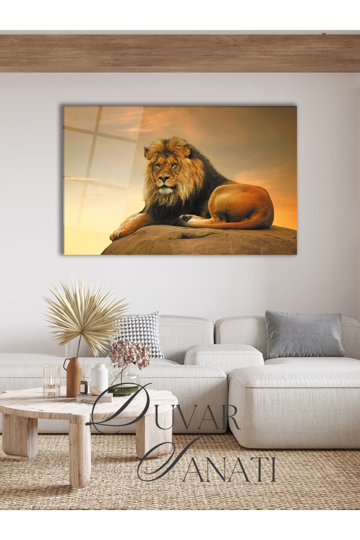 Aslan Kral Cam Tablo, Modern Ev Salon Ofis Dekorasyonu Hediyelik Büyük Duvar Dekoru Sarı