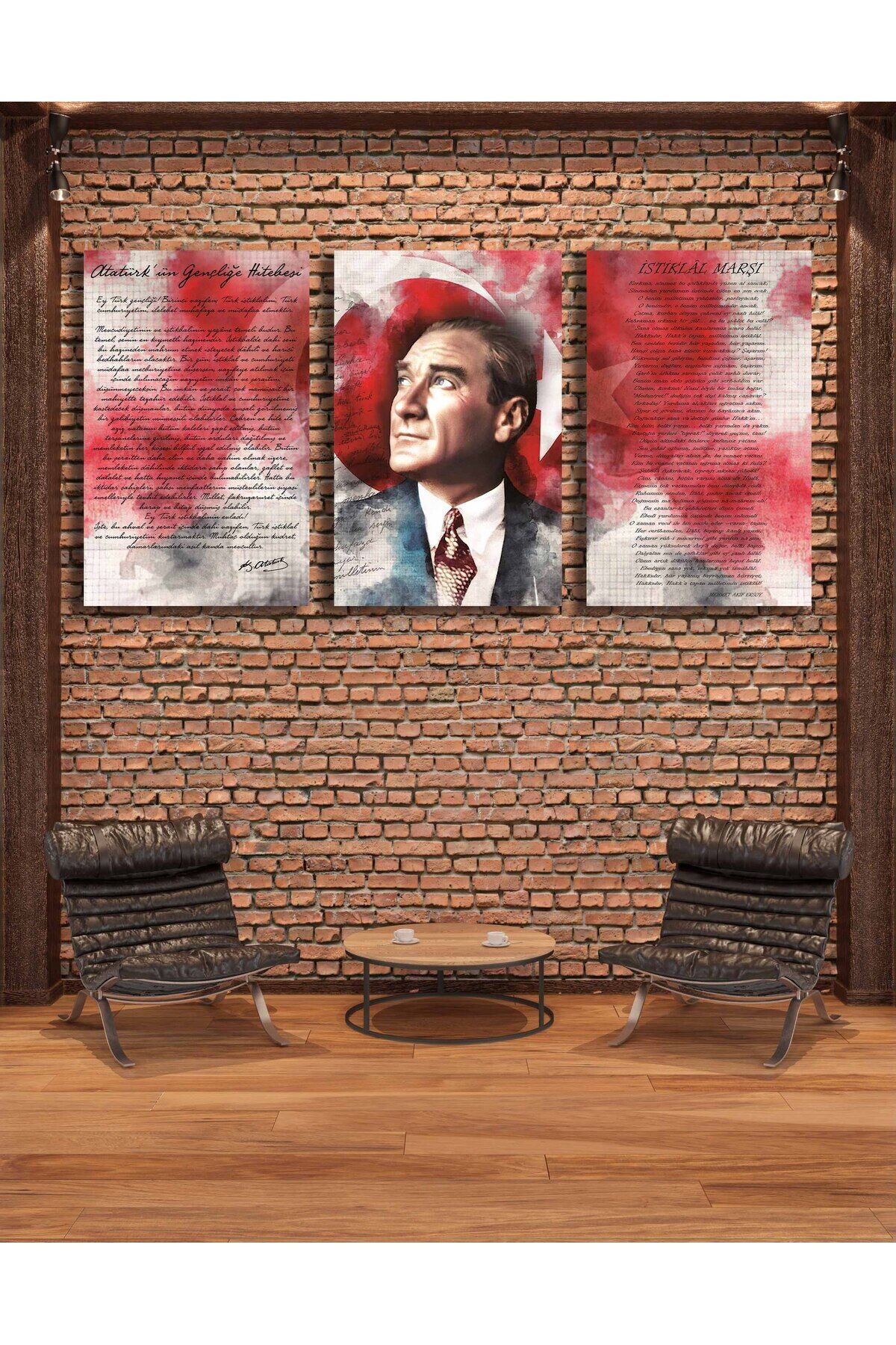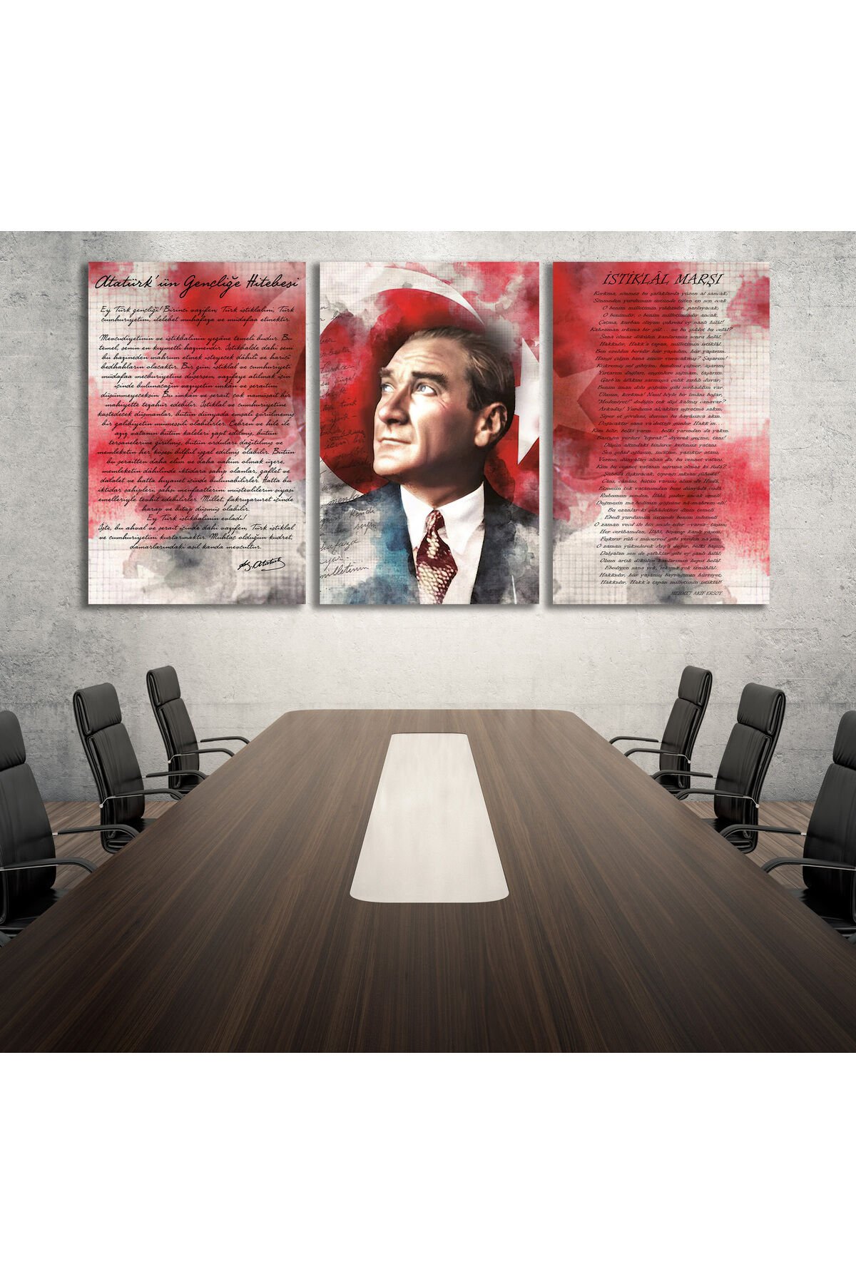 Setimiz aynı ölçüden 3 parçadır. ; Duvar Sanatı "Atatürk İstiklal Marşı ve Gençliğe Hitabe Üçlü Set Cam Tablo" 4 mm kalınlığında temper işlemi (ısıl işlem) görmüştür. Kenarları rodajlanmış (kesiciliği giderilmiş) yüksek kaliteli düz camlardan oluşmaktadır. -Normal camlara göre kırılmaya 10 kat daha dayanıklıdır. Gönderilirken özel korumalı ambalaj, tabloya yapıştırılmış olarak çelik aparat ve duvara asmak için vida-dübel ile gönderilmektedir.; Duvar Sanatı tarafından hazırlanan özel tasarımlar doğrudan cam yüzeyine uv baskı tekniğiyle yüksek çözünürlüklü makinalarımız tarafından uygulanır. Bu nedenle yüksek kaliteli, mükemmel bir görüntü derinliği sağlar. ; -Görsellerimiz camın arka yüzeyine doğrudan uv cam boyası kullanılarak basılır ve özel koruma beyaz uv boya ile arka yüzey kapatılır. Baskı cam ile arka koruma boyası arasında kalır.-Cam tablolar zamanla solmazlar ve renkler canlılığını hiç kaybetmez. ; -Özellikle ev ve ofis dekorasyonunda büyük tablolar duvarlarda çok şık bir görünüm sağlarlar. ; -Dekoratif ve zarif tablolar ev ve ofis duvarlarınıza estetik bir hava katar. ; -Temizliği son derece kolay olan cam tablolarımızı nemli bez ile gönül rahatlığıyla silebilirsiniz. Özel çelik askı aparatı sayesinde ürünlerimizin duvardan kazara düşme olasılığı çok düşüktür. ; -Ürünle birlikte gönderdiğimiz vida ve dübel ile kolayca duvara monte edebilirsiniz. Ürün asıldığında duvardan 2 cm önde durmaktadır. ; -Kargo esnasında yaşanacak kırılma durumunda ücretsiz yeni ürün gönderimi yapmaktayız. ;