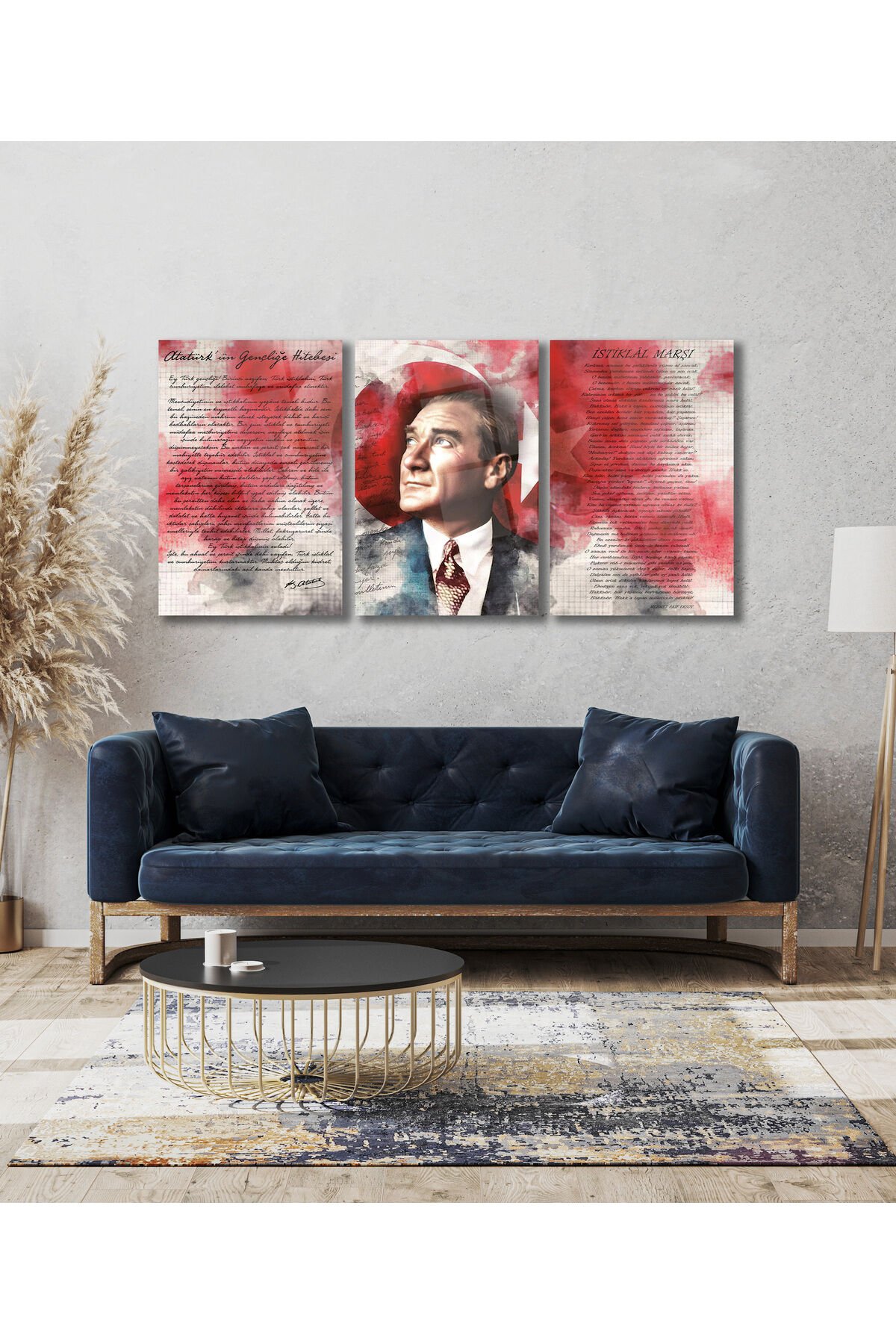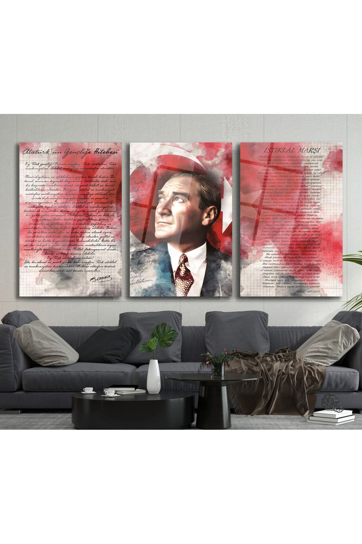Atatürk İstiklal Marşı ve Gençliğe Hitabe Üçlü Set Cam Tablo, Modern Ofis Hediyelik Büyük Tablo Kırmızı Beyaz