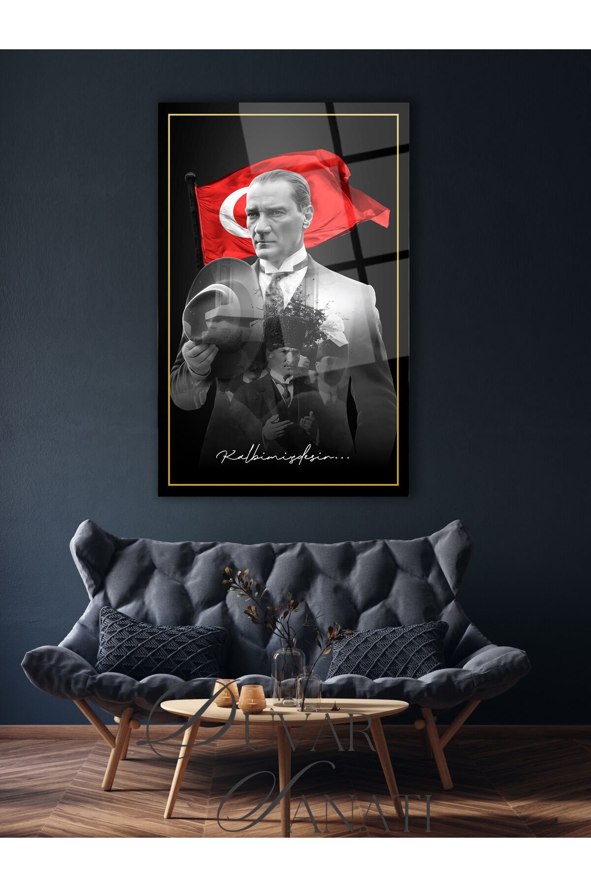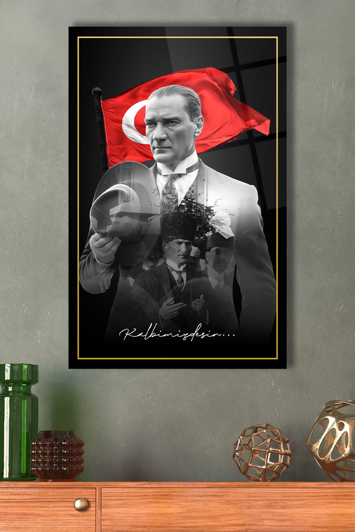 Atatürk Portre Dikey Cam Tablo, Modern Kurum Ev Ofis Salon Duvar Dekoru , Hediyelik Büyük Tablo Çok Renkli