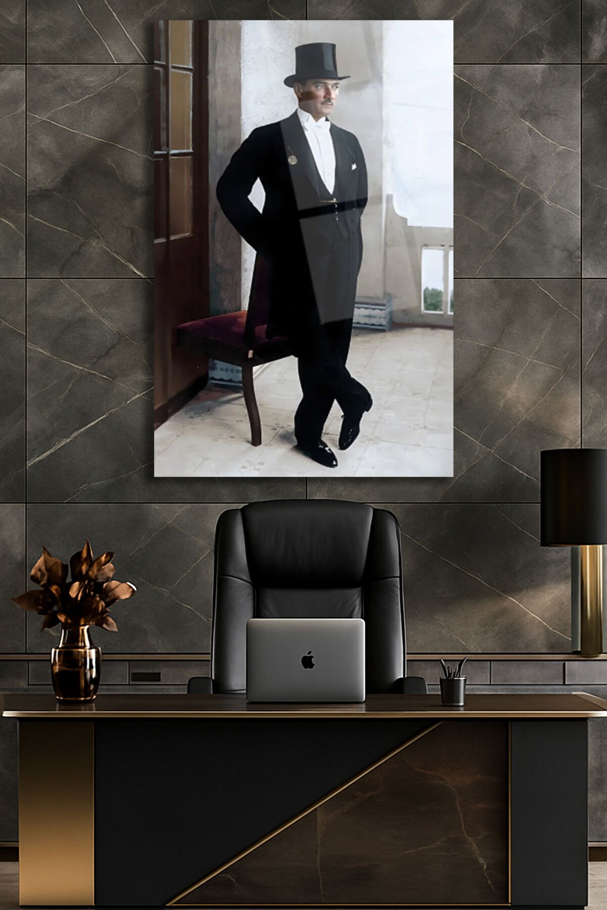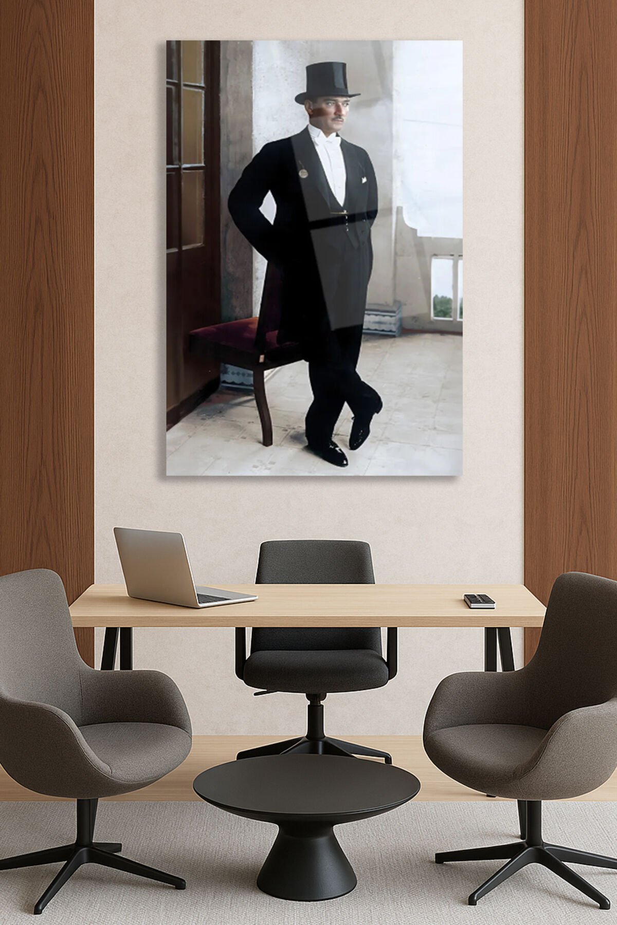 Atatürk Portre Smokin Kıyafetli Ayakta Cam Tablo, Modern Ev Ofis Salon Duvar Dekoru , Hediyelik Siyah