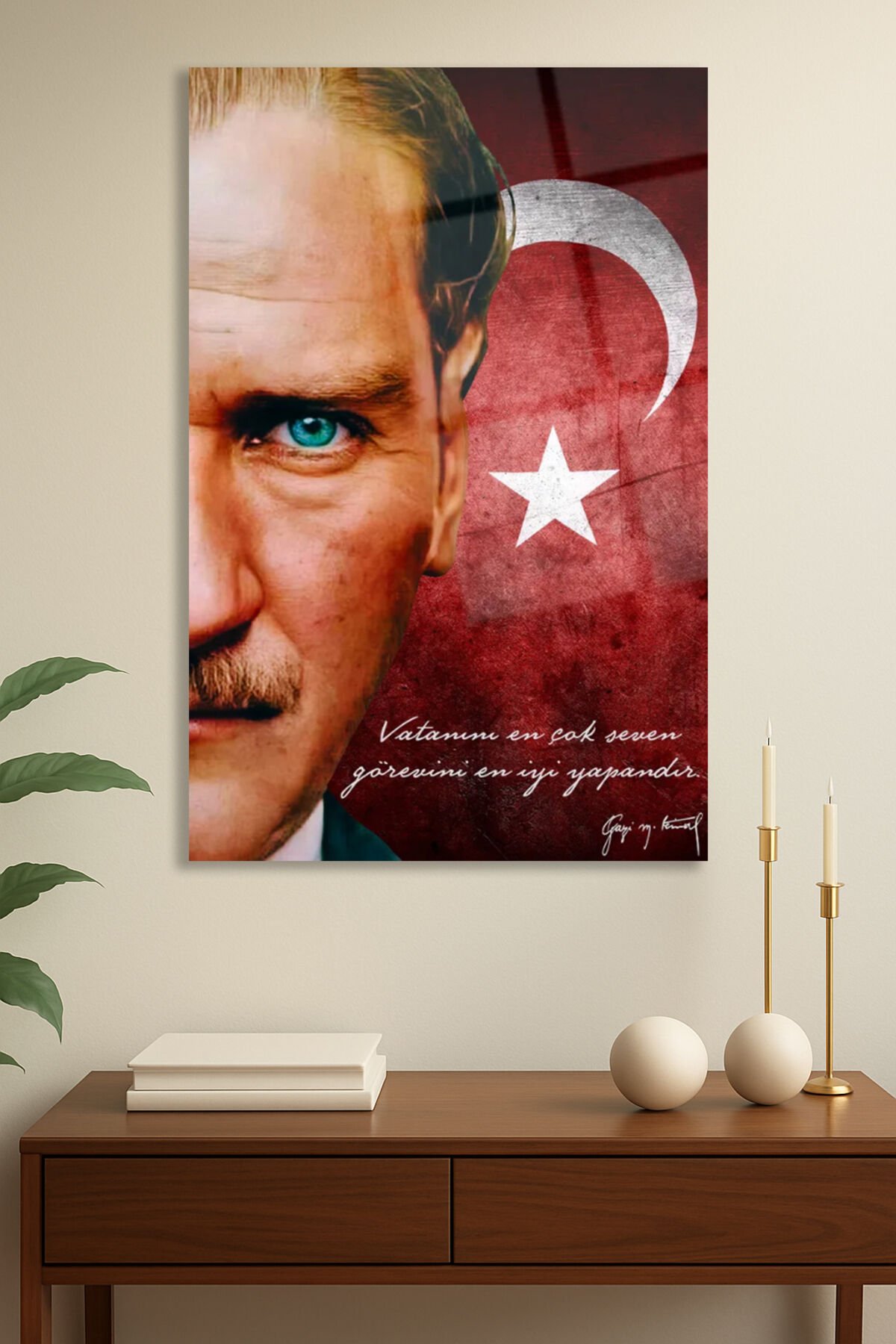 Atatürk Portre Türk Bayrağı Cam Tablo, '' Vatanını en çok seven '' Kurum Ofis Duvar Dekoru ,Hediyelik Kırmızı Mavi