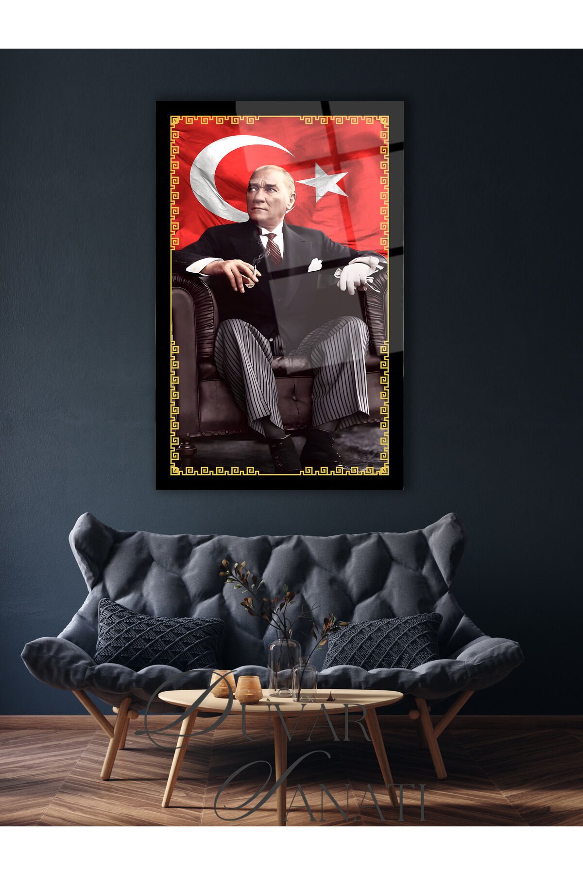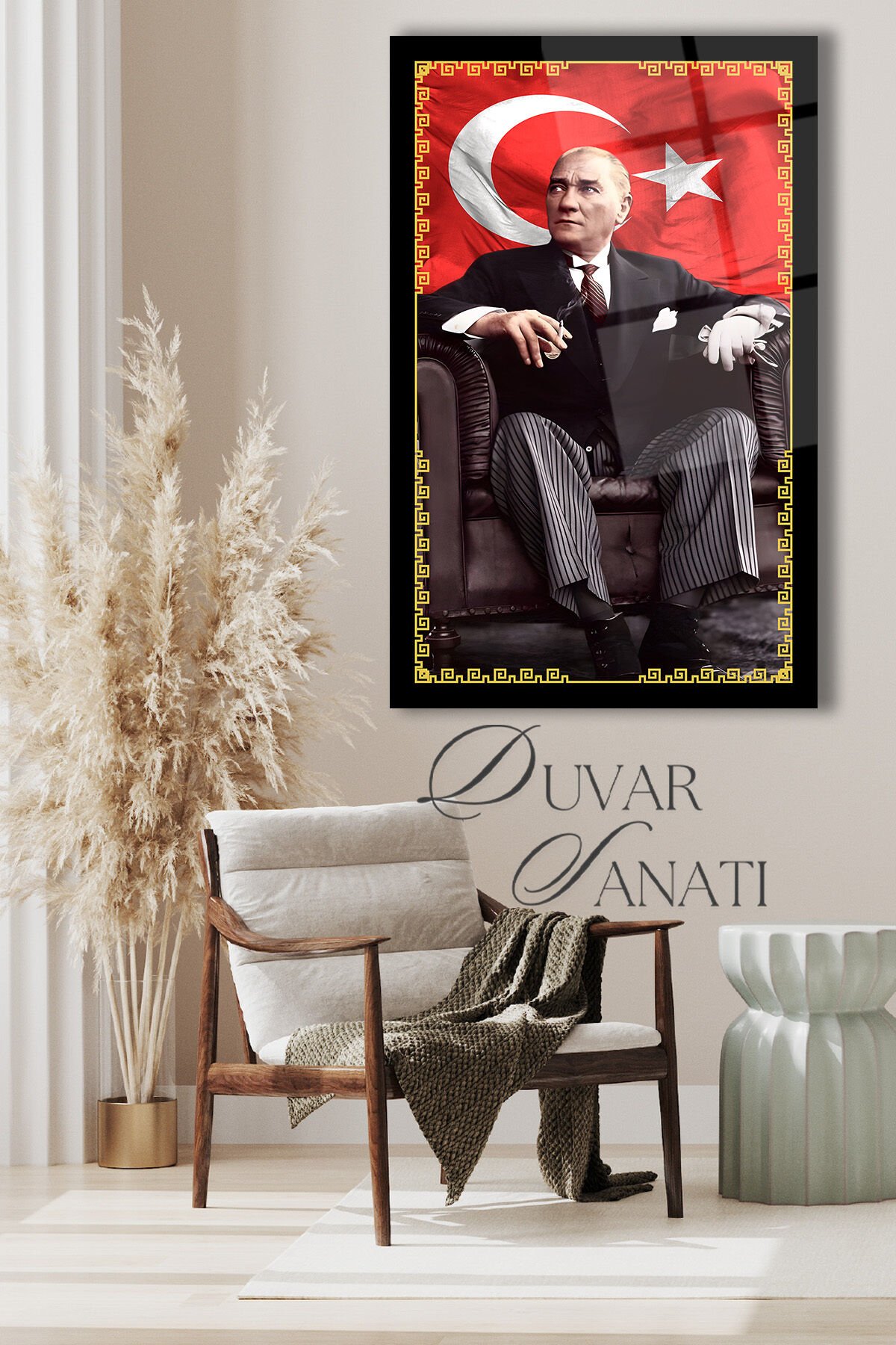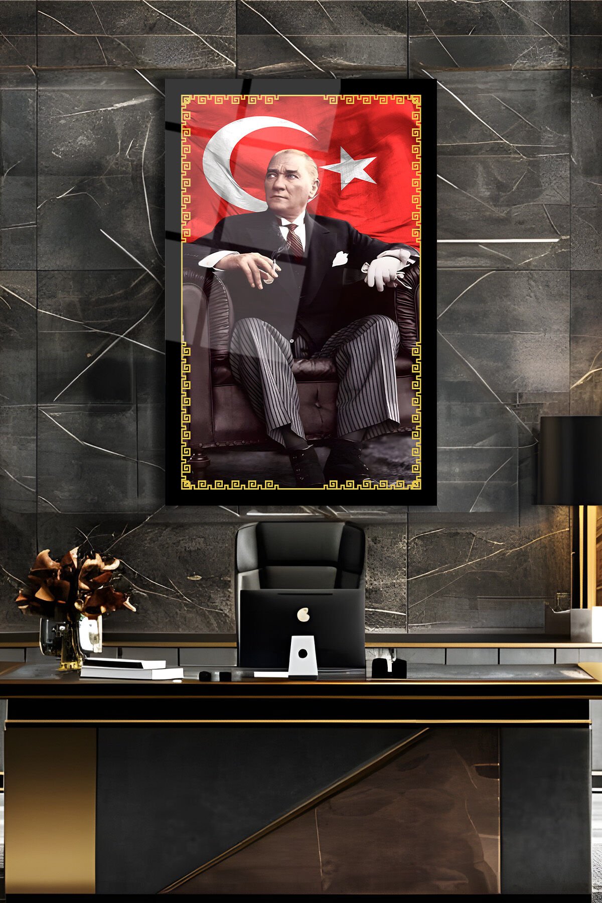 Atatürk Portre ve Türk Bayrağı Dikey Cam Tablo, Modern Duvar Dekoru , Kurum Ofis Hediyelik Tablo Çok Renkli