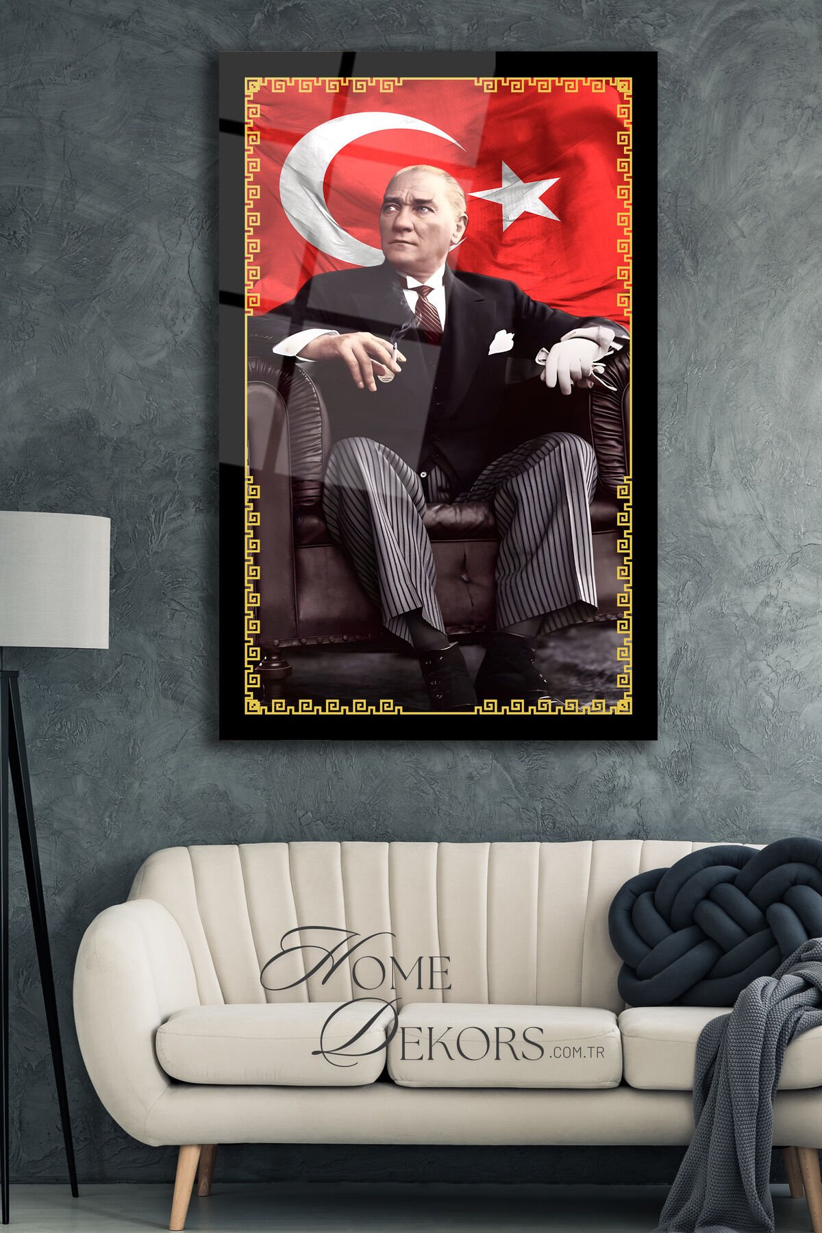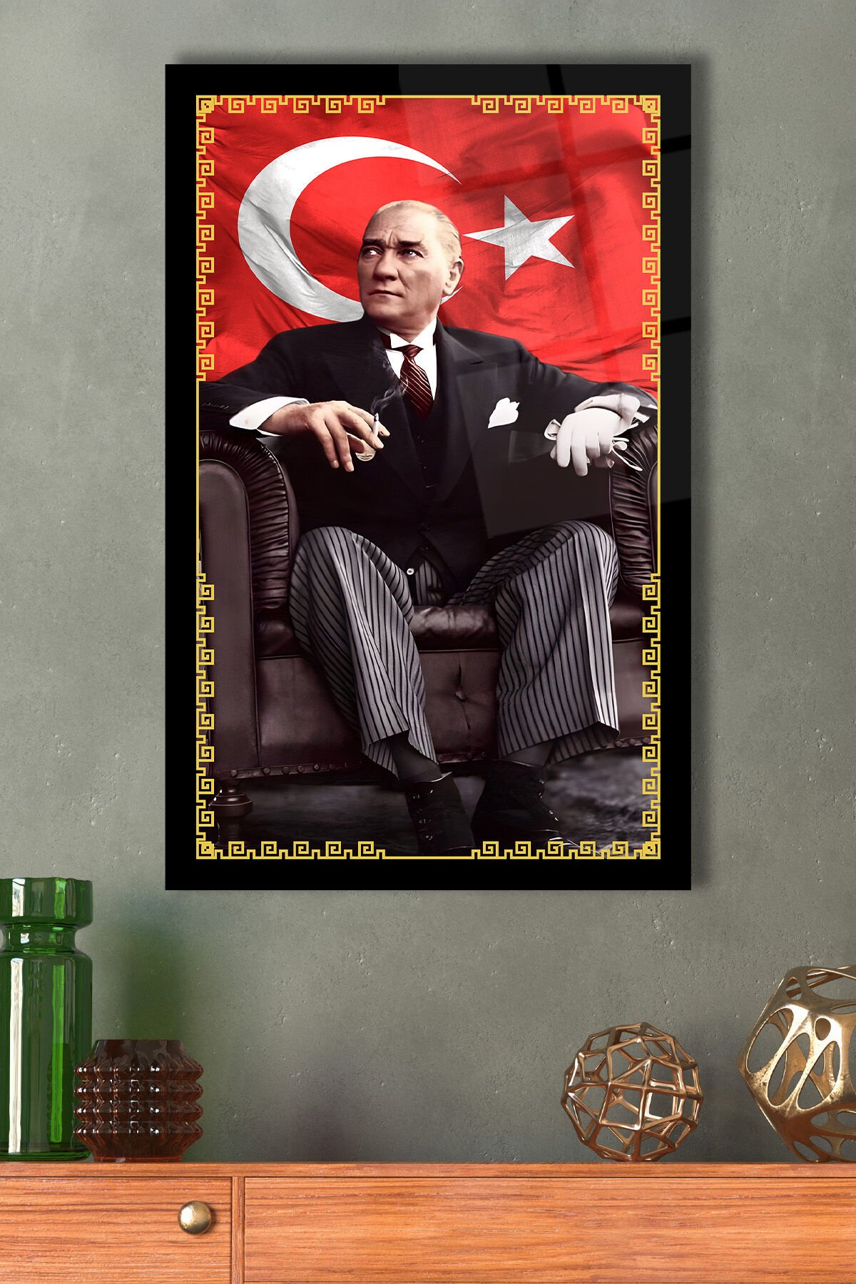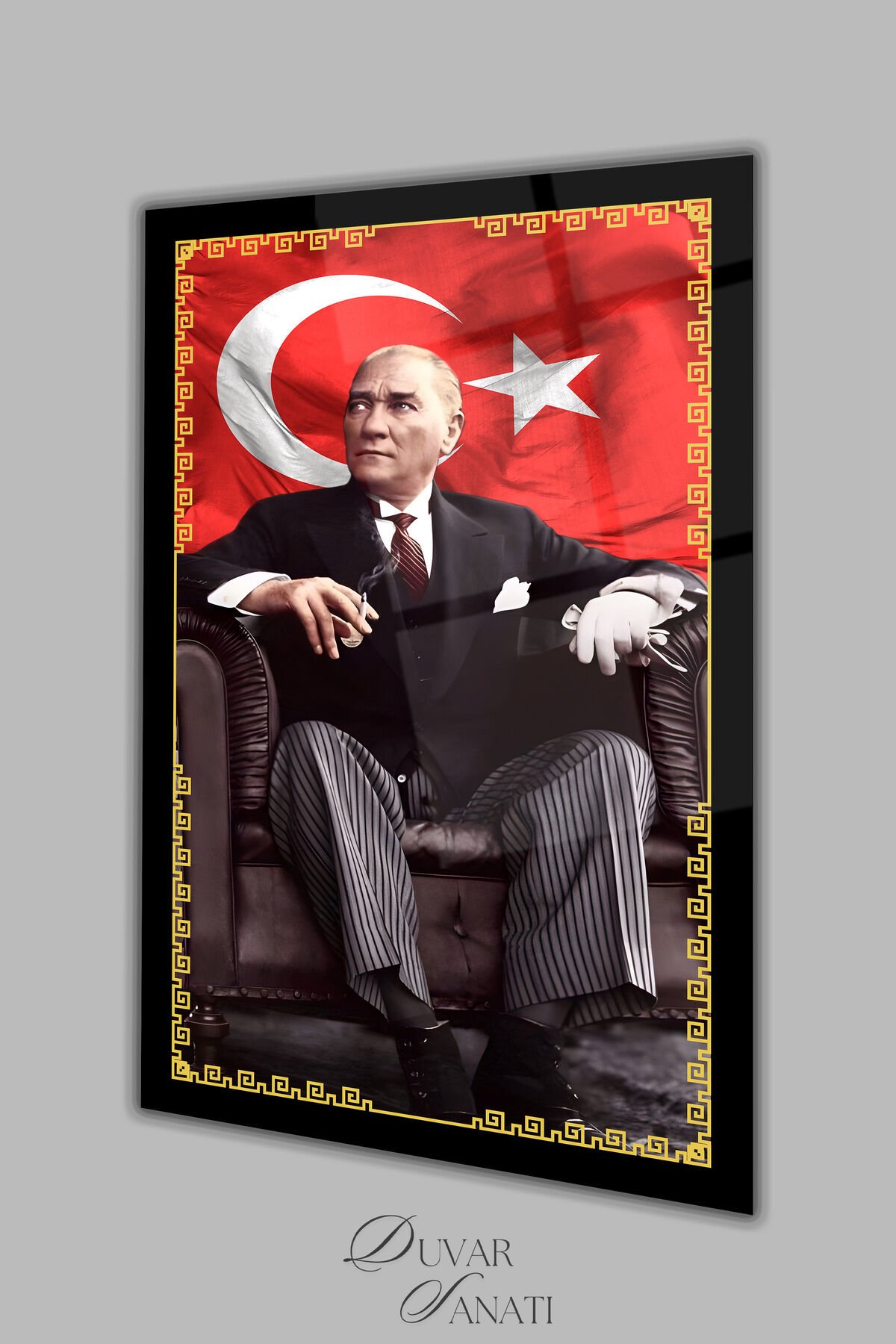 Atatürk Portre ve Türk Bayrağı Dikey Cam Tablo, Modern Duvar Dekoru , Kurum Ofis Hediyelik Tablo Çok Renkli