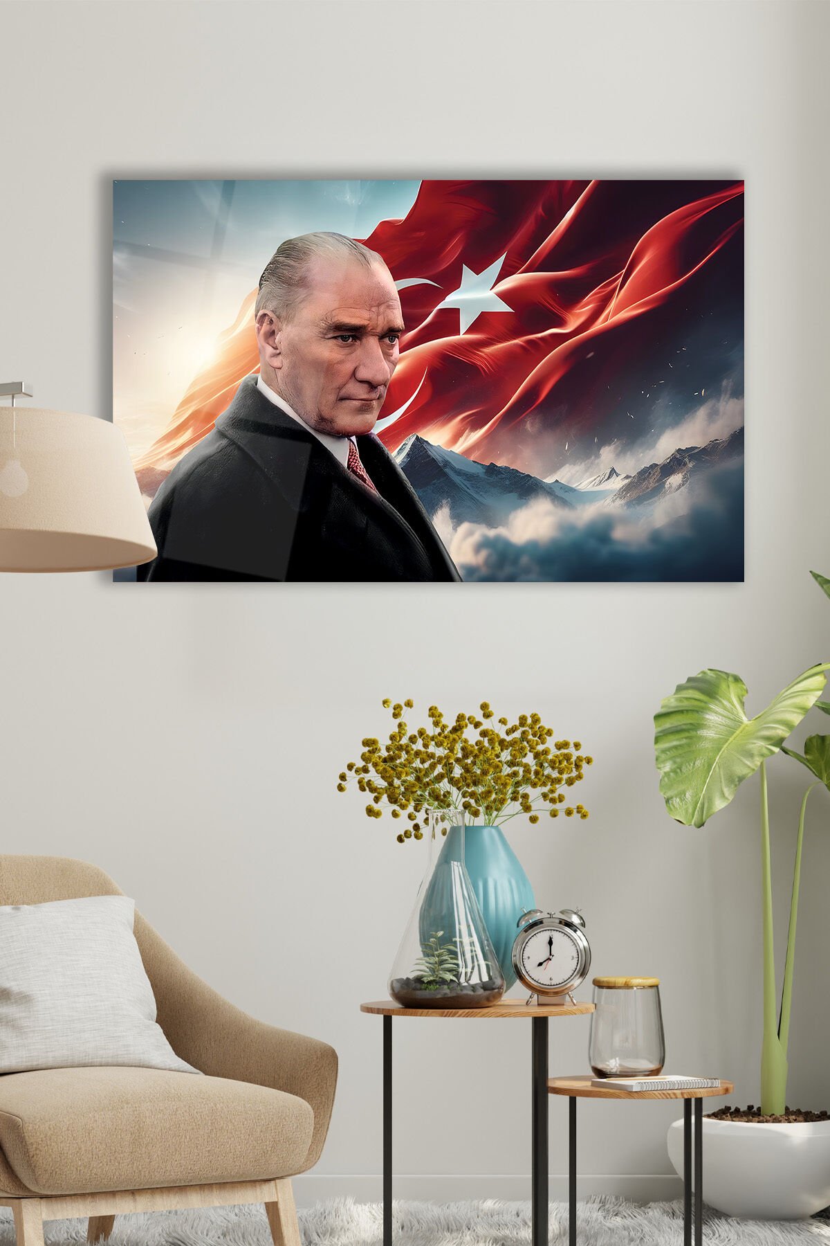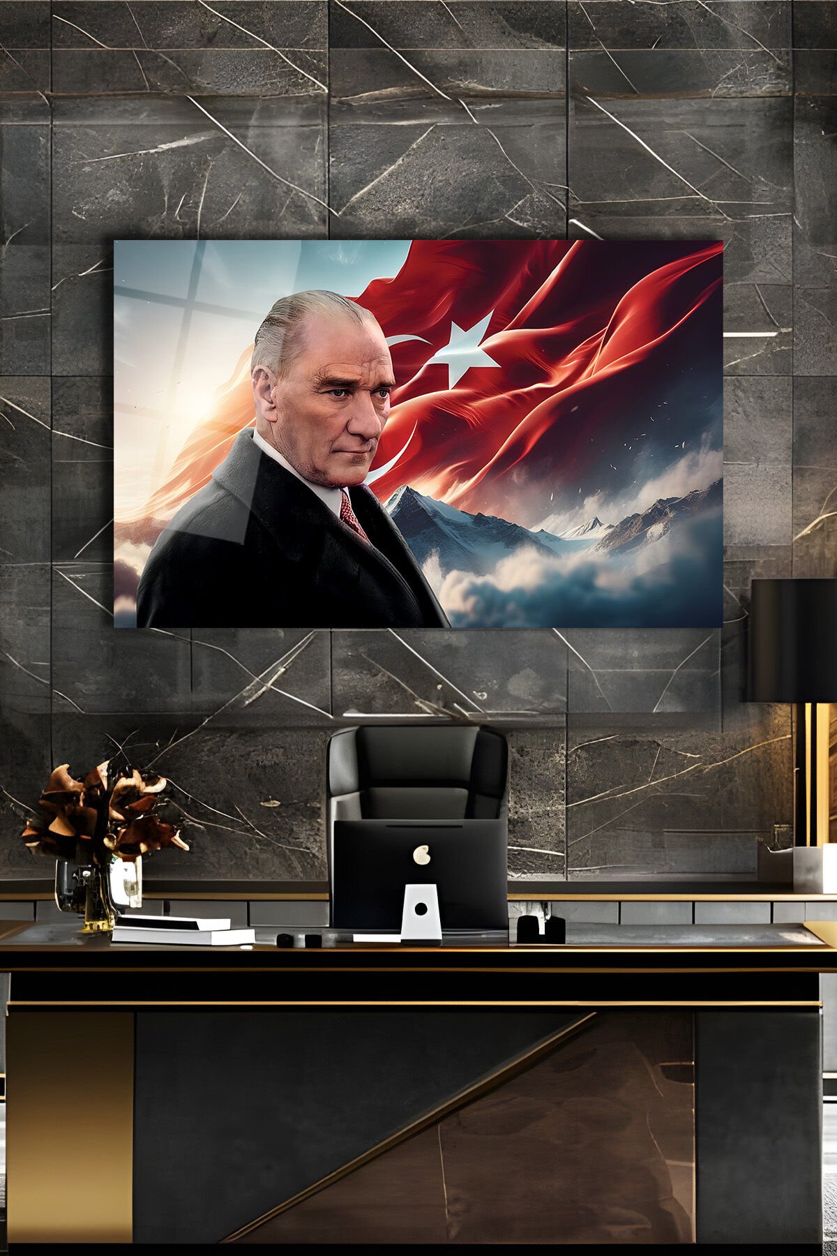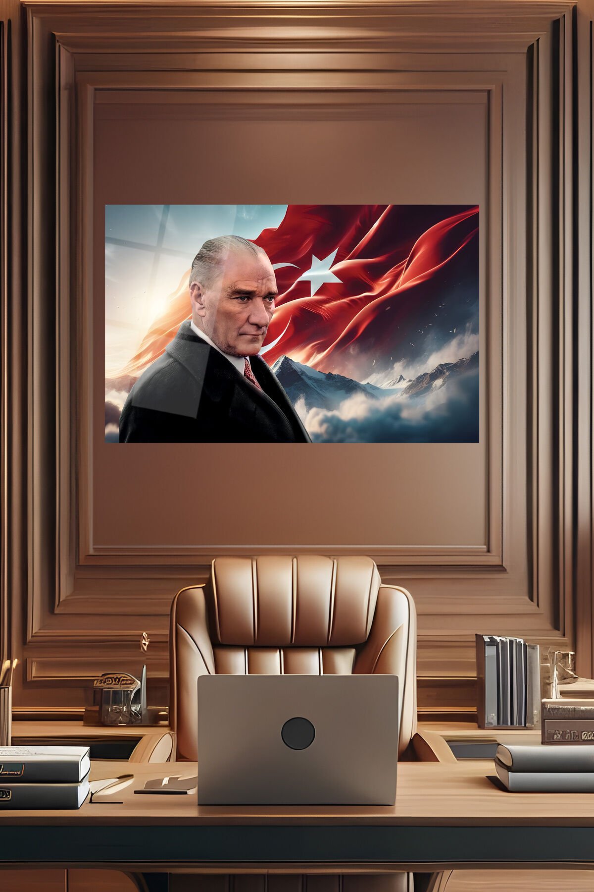 Atatürk Portre ve Türk Bayrağı Yatay Cam Tablo, Modern Duvar Dekoru , Kurum Ofis İş Hediyelik Tablo Çok Renkli