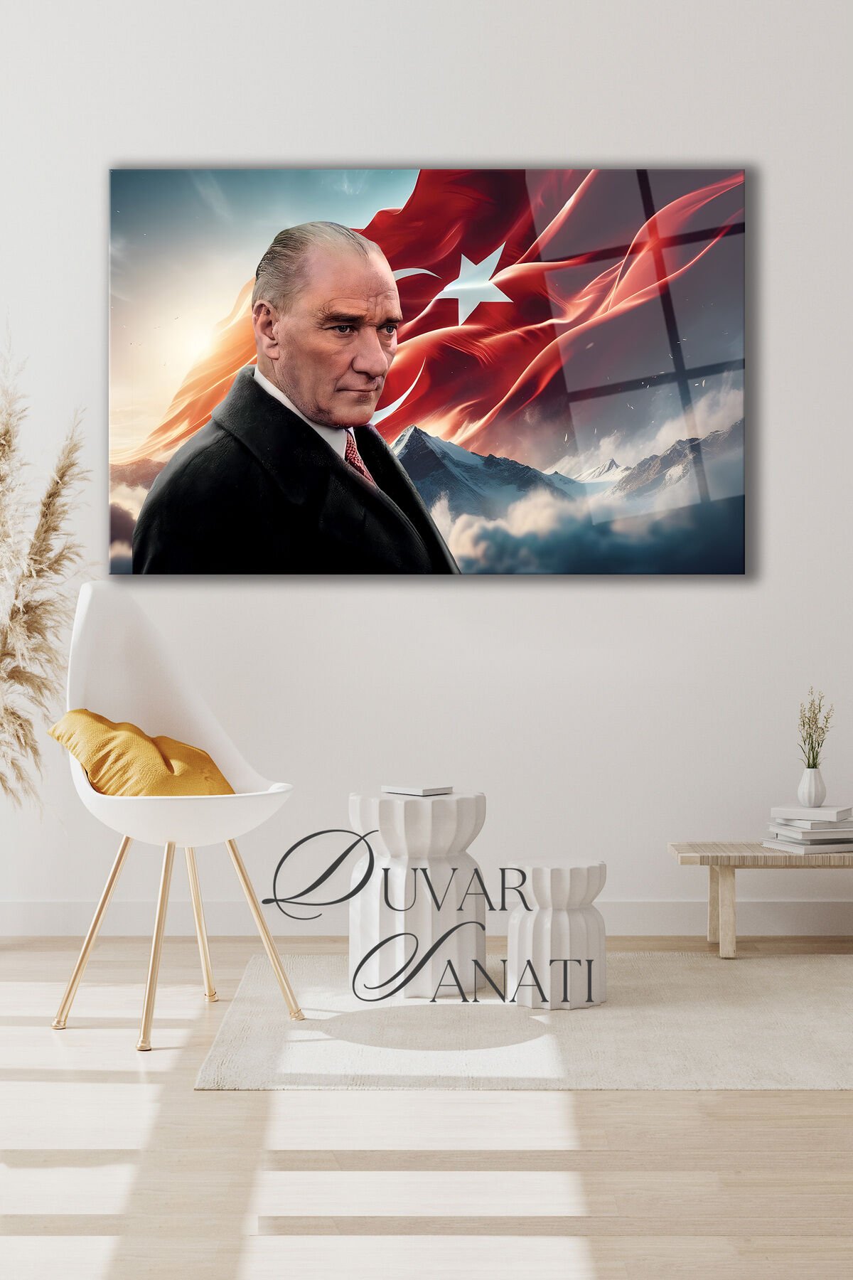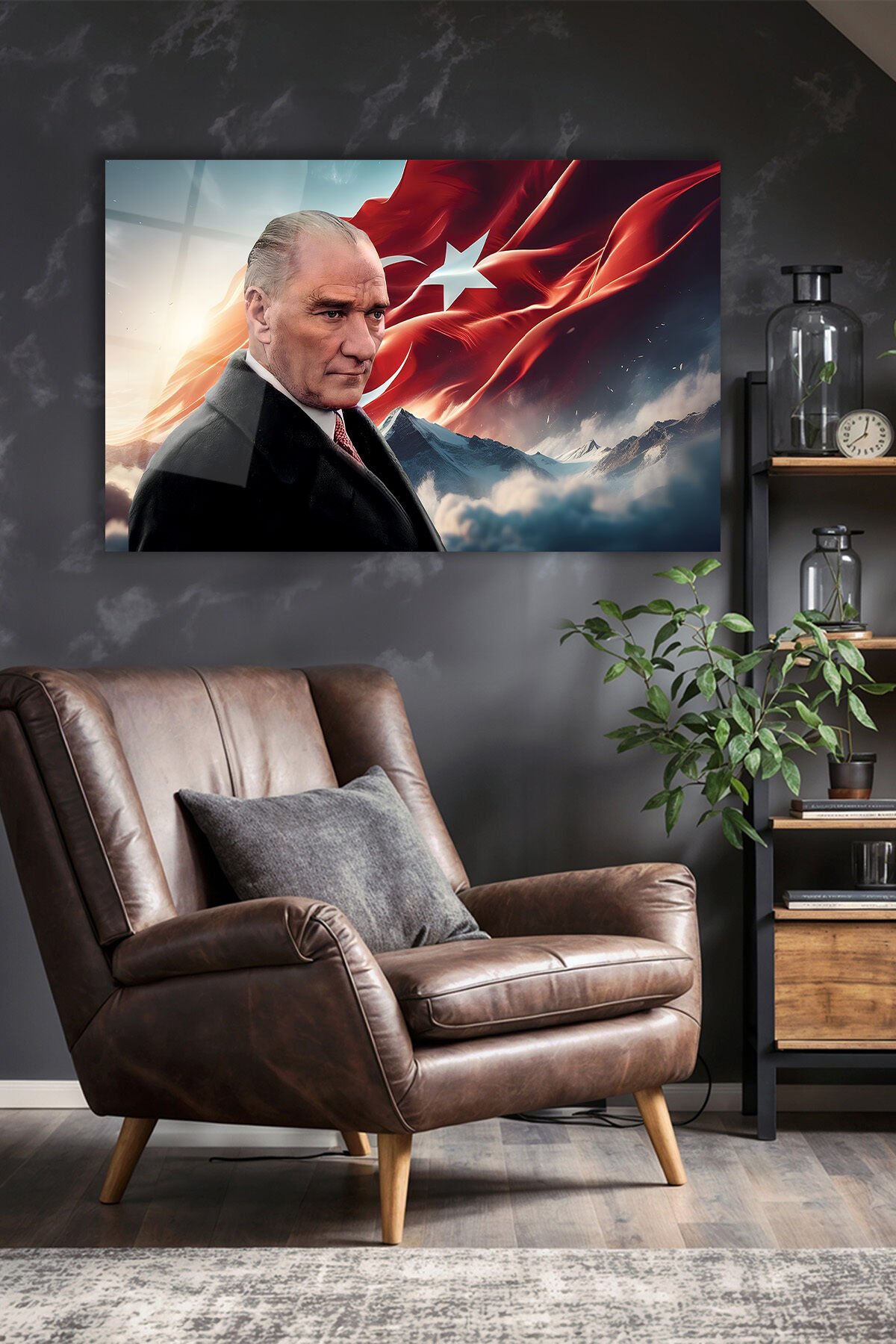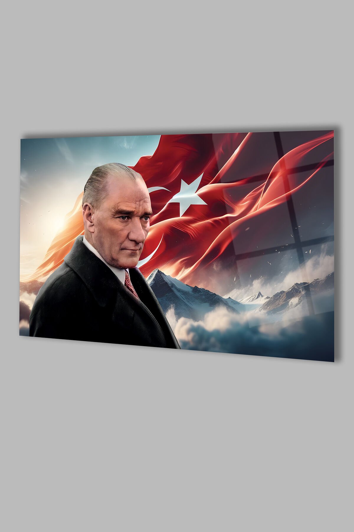 Atatürk Portre ve Türk Bayrağı Yatay Cam Tablo, Modern Duvar Dekoru , Kurum Ofis İş Hediyelik Tablo Çok Renkli