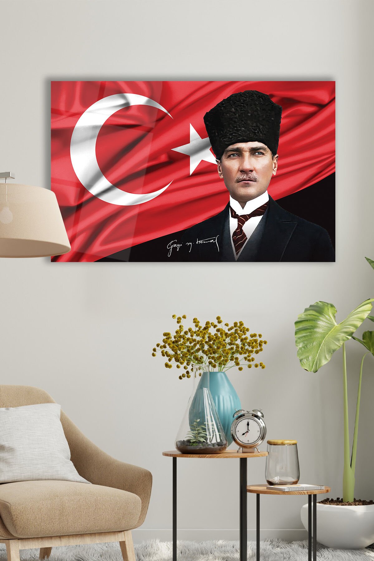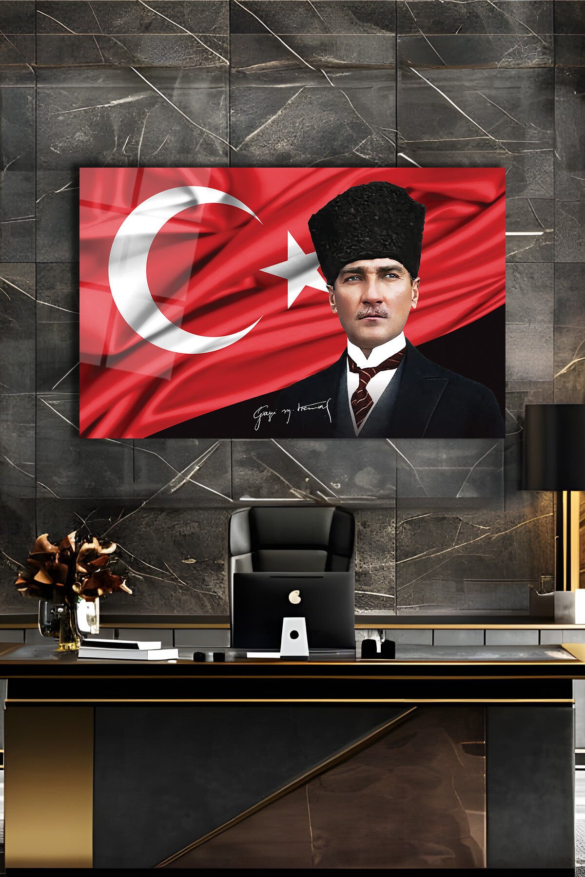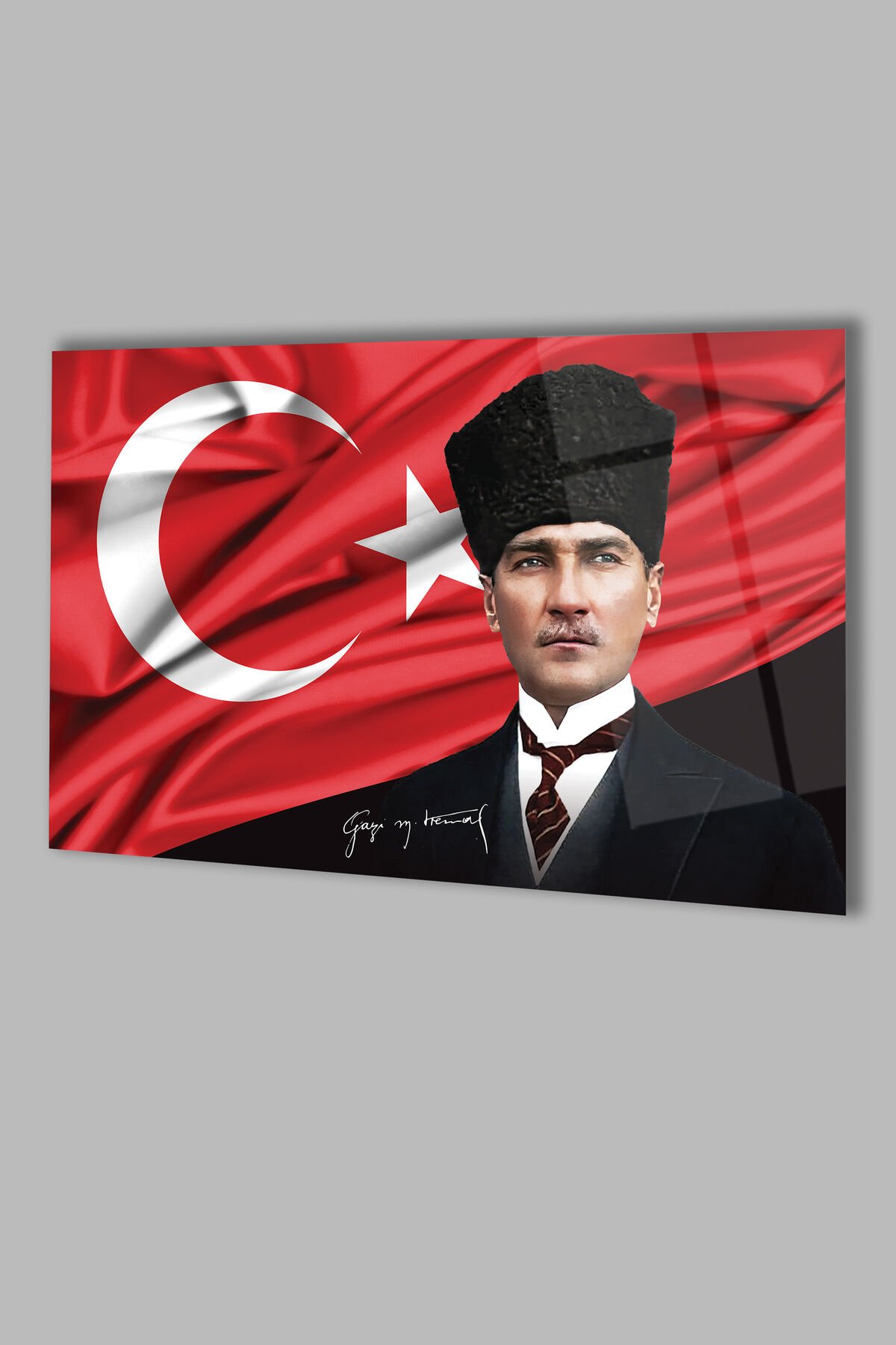 Atatürk Portre ve Türk Bayrağı Yatay Cam Tablo, Modern Duvar Dekoru , Kurum Ofis İş Hediyelik Tablo Çok Renkli