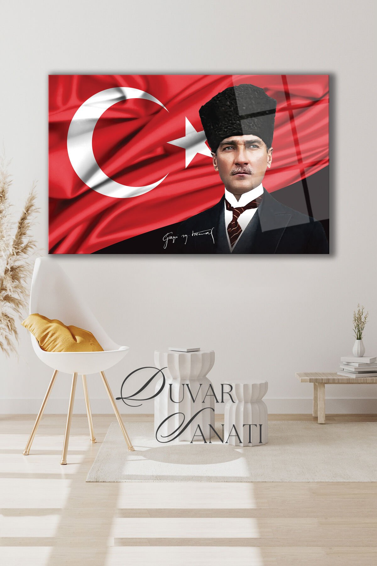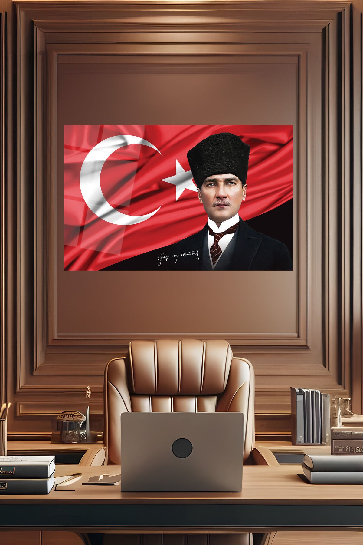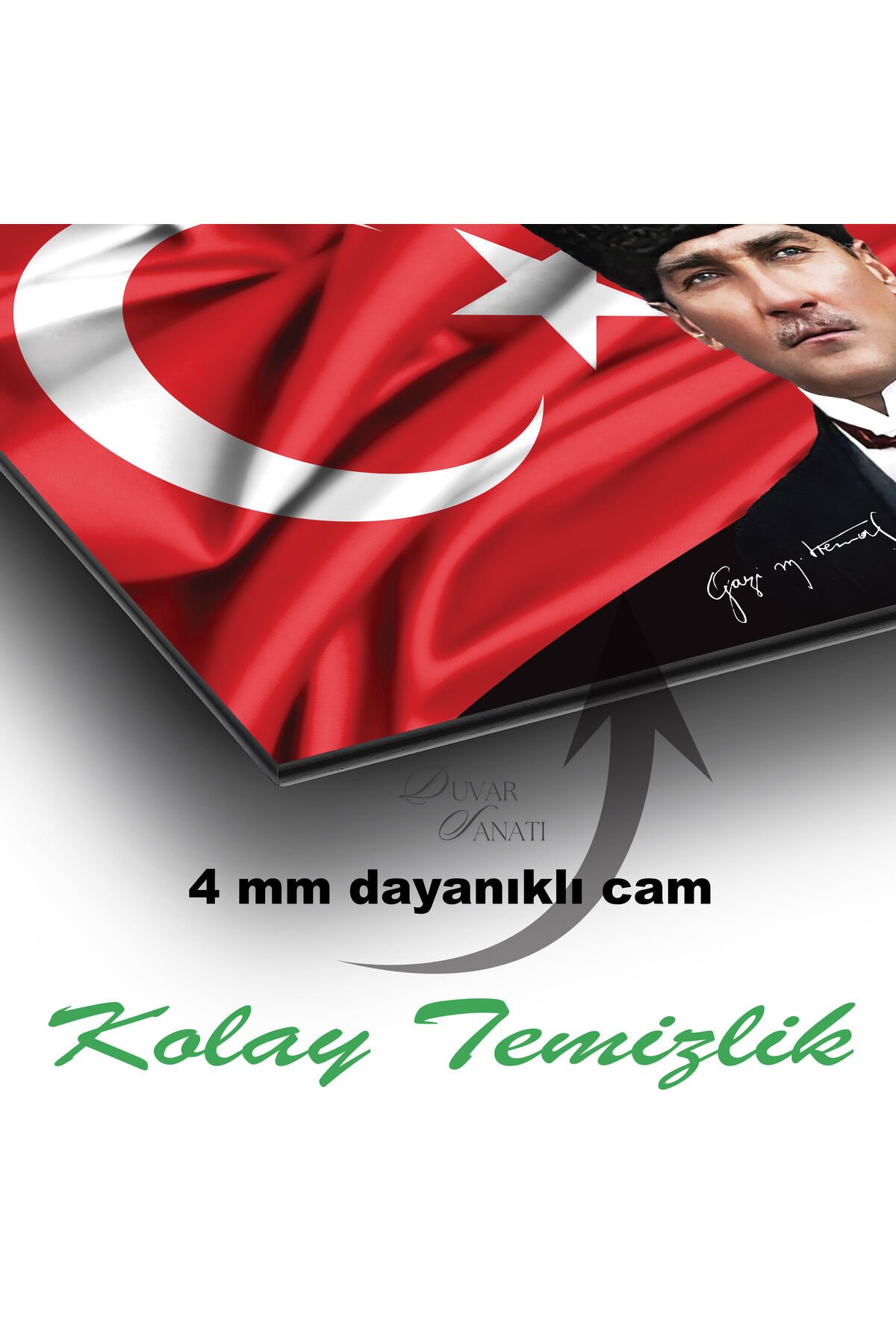 Atatürk Portre ve Türk Bayrağı Yatay Cam Tablo, Modern Duvar Dekoru , Kurum Ofis İş Hediyelik Tablo Çok Renkli