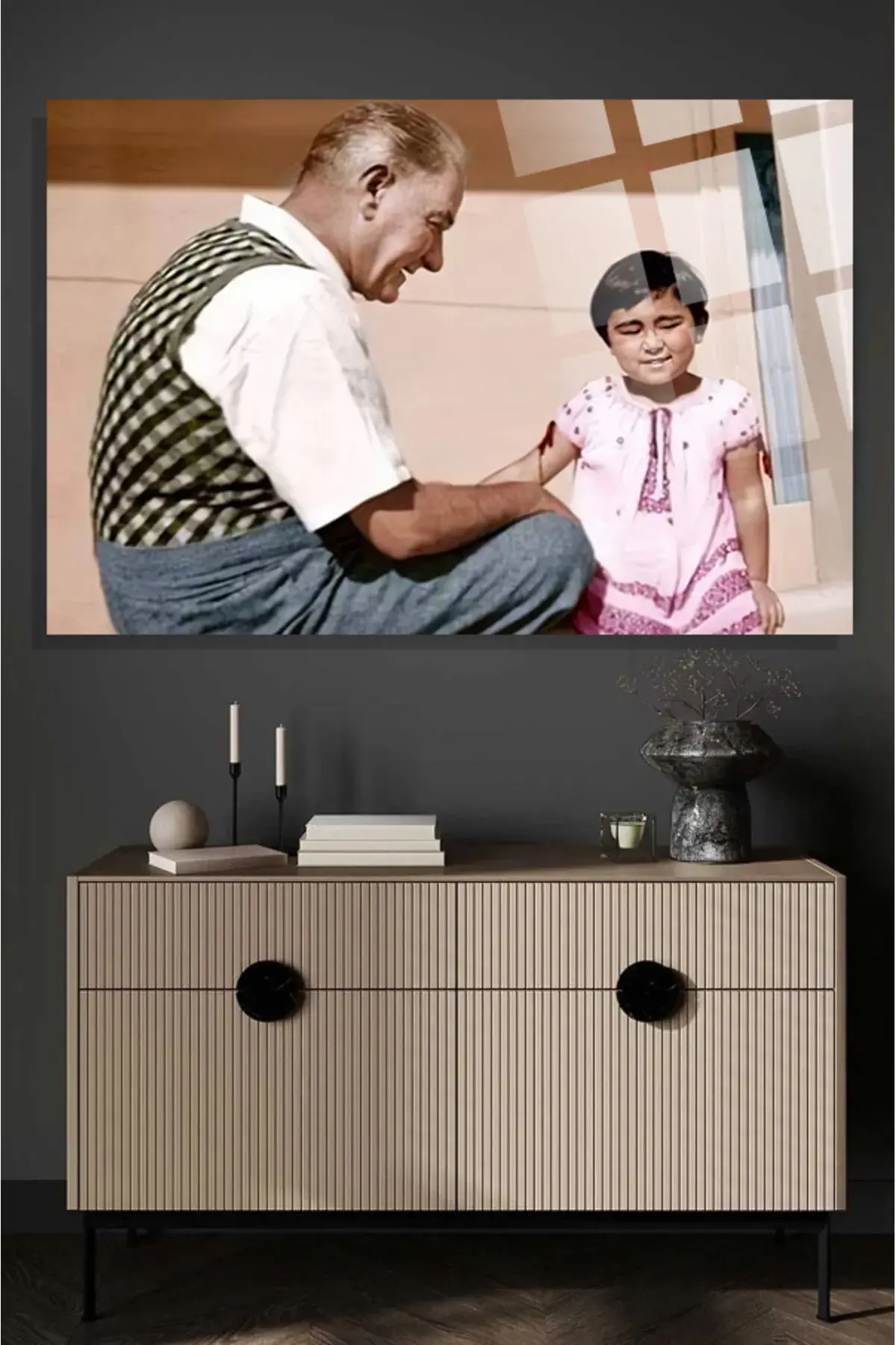 Atatürk Ve Çocuk Kaliteli 4mm Kırılmaz Temperli Yüksek Çözünürlüklü Cam Tablo