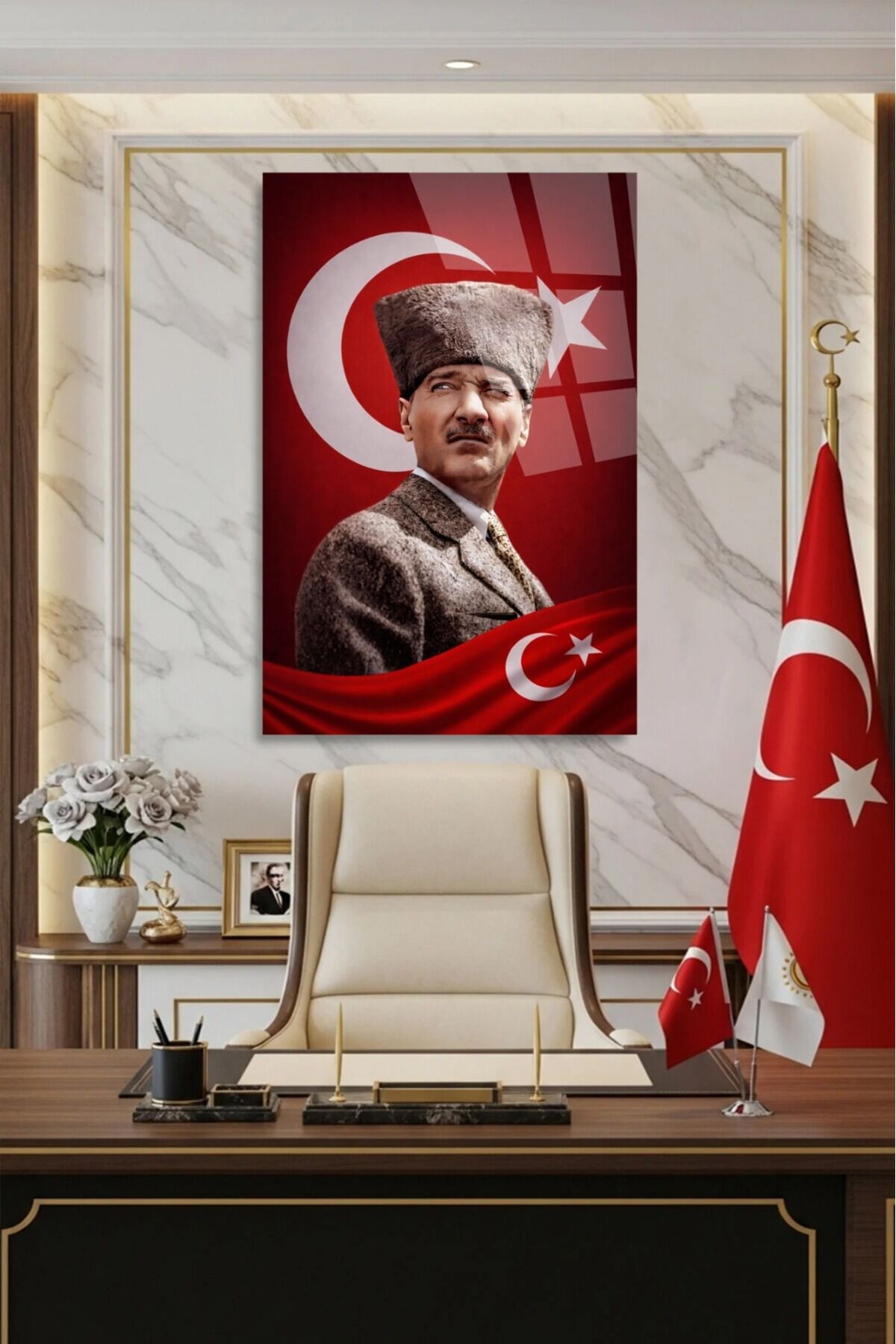 ATATÜRK VE TÜRK BAYRAKLI CAM TABLO | ULU ÖNDER PORTRE | PREMİUM DUVAR DEKORU Kırmızı