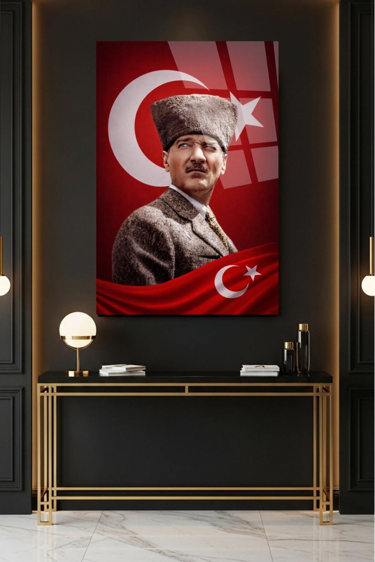 - Atatürk ve Türk bayrağının özgün bir yansıması, soyut tema ile modern bir dokunuş sunar.; - Premium kalite cam materyal kullanılarak üretilmiş, uzun ömürlü ve dayanıklı bir duvar dekorasyon parçasıdır.; - Çerçevesiz tasarımı sayesinde, mevcut dekorasyonunuza kolayca uyum sağlar ve farklı çerçeve seçenekleriyle kişiselleştirilebilir.; - Türkiye menşeli olmasıyla yerel üretim desteklenir ve kaliteli işçilikten emin olunur.; - Tek parça halinde gelen bu cam tablo, kolay montaj imkanı sunarak evinizin veya ofisinizin atmosferini zenginleştirir.;