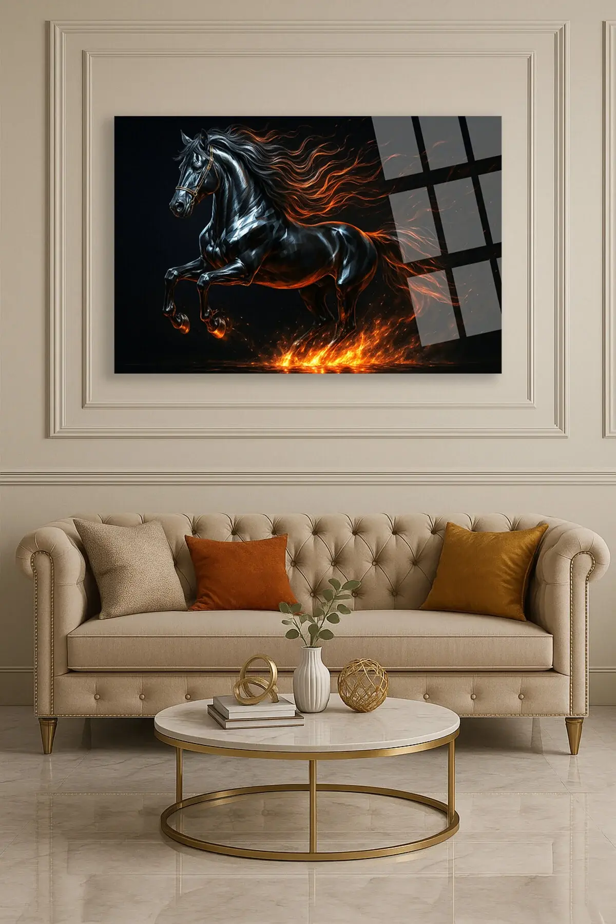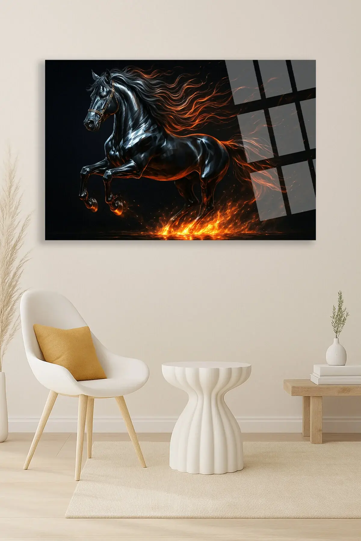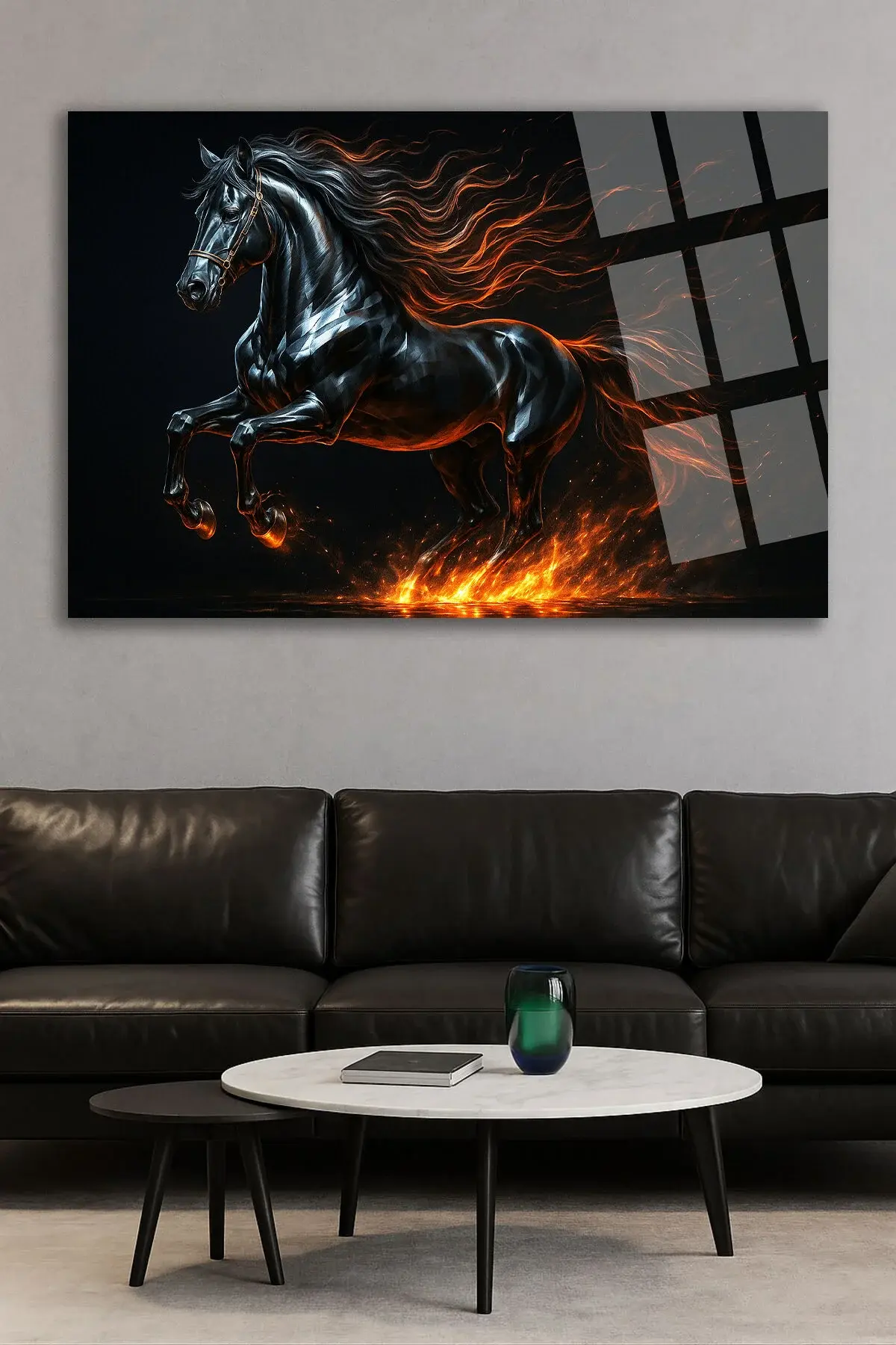 ATEŞ SAÇAN KRİSTAL LÜKS YATAY AT TABLOSU KIRILMAZ CAM TABLO EV HEDİYESİ TABLO MODERN TABLO Siyah