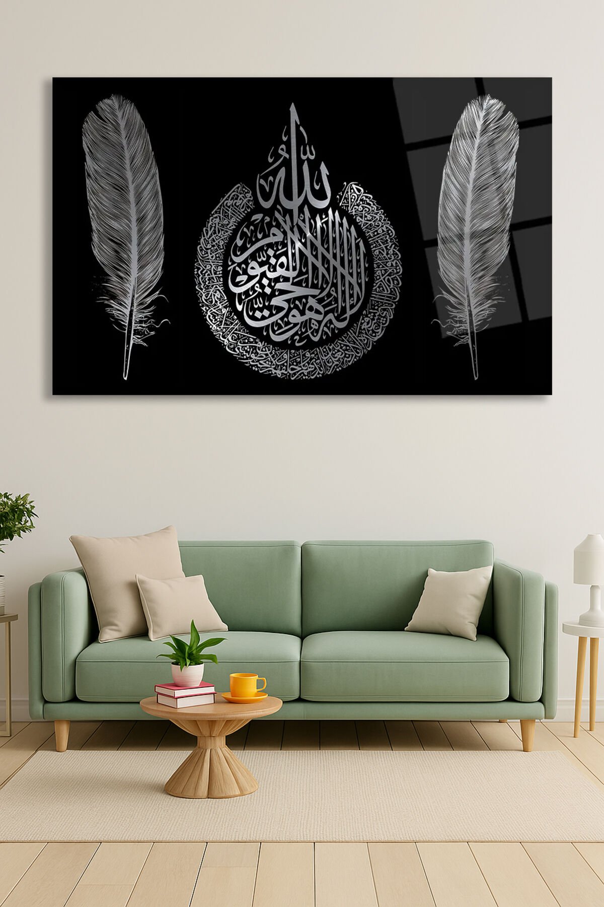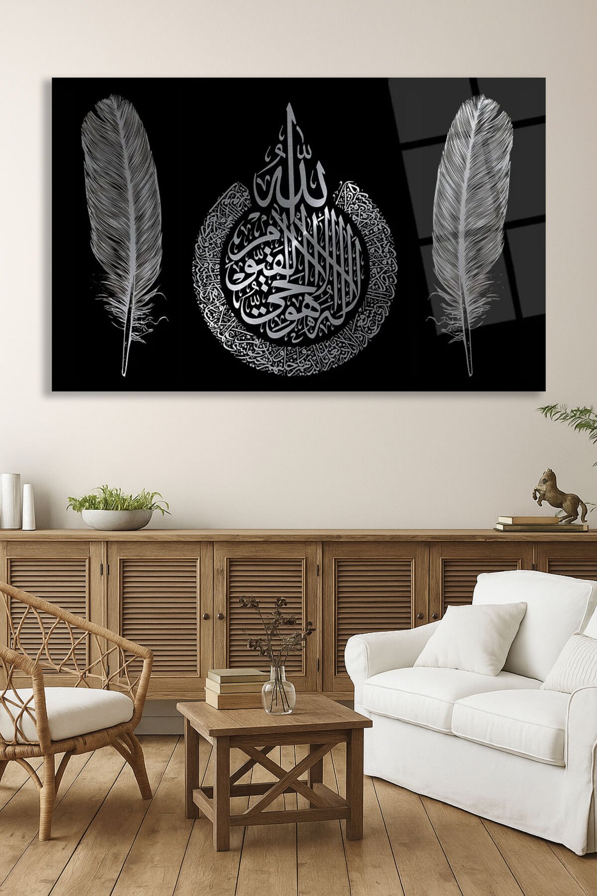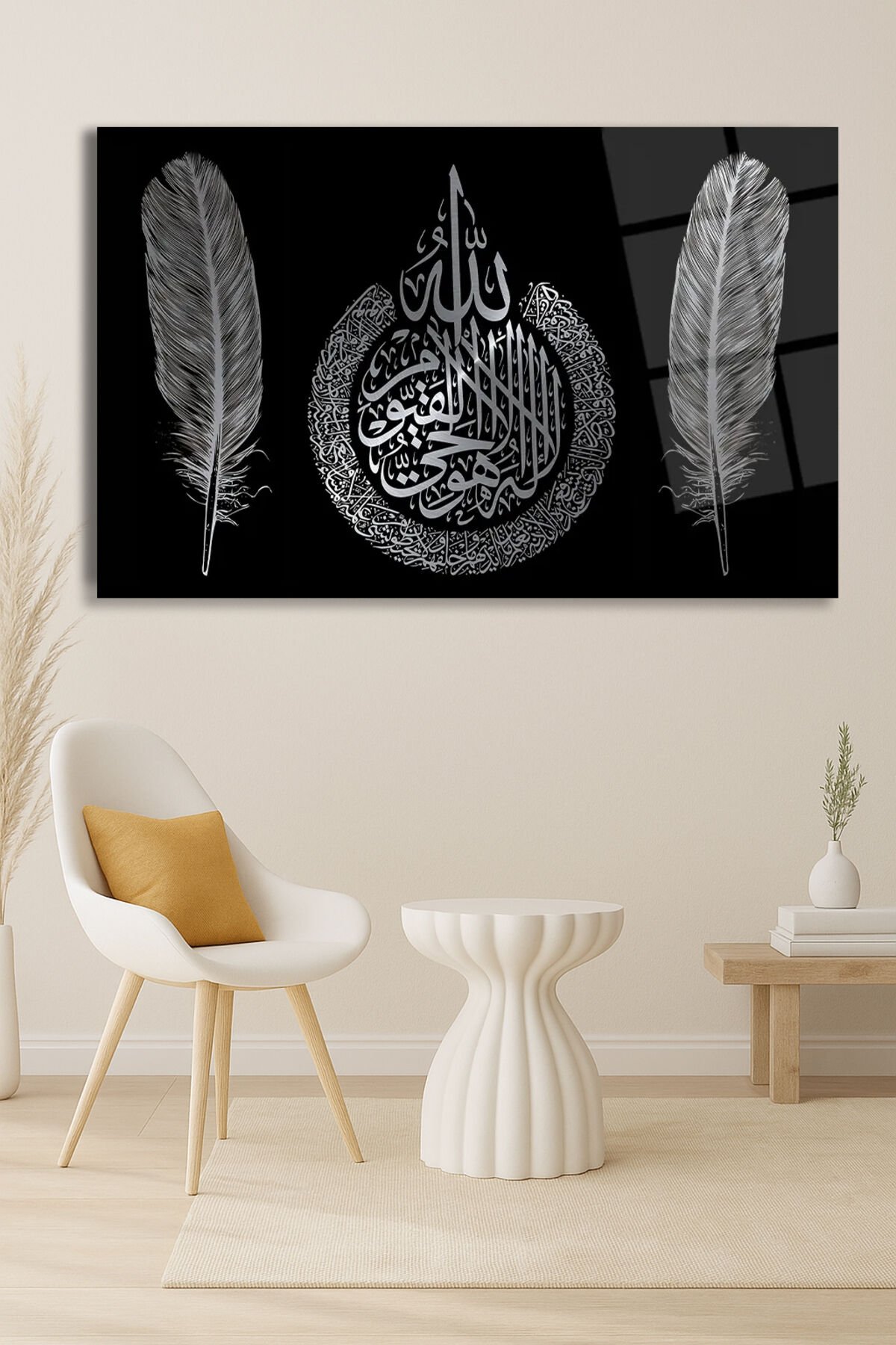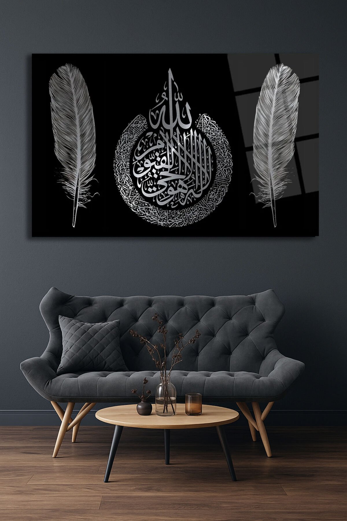 Ayetel Kürsi Ayet ve Tüy Cam Tablo Dini İslami Ev Ofis Salon İçin Hediyelik Duvar Dekoru Büyük Tablo Siyah Gümüş