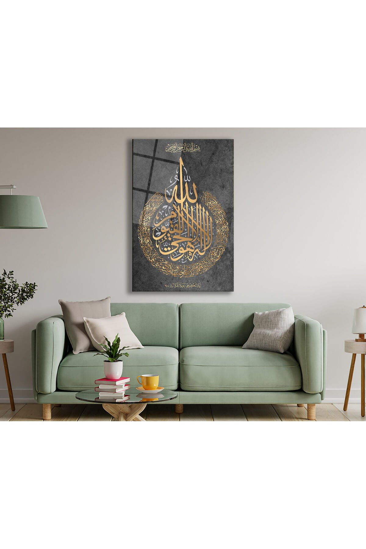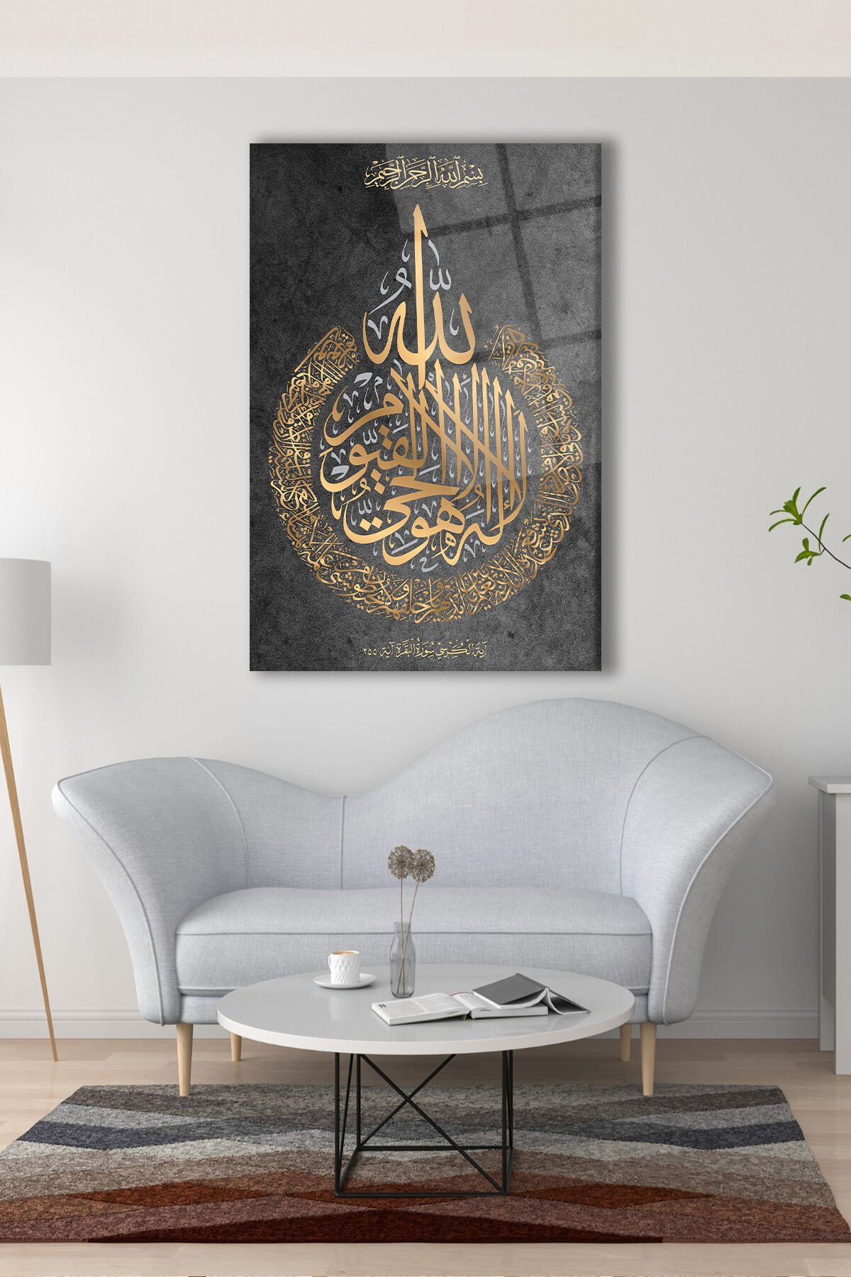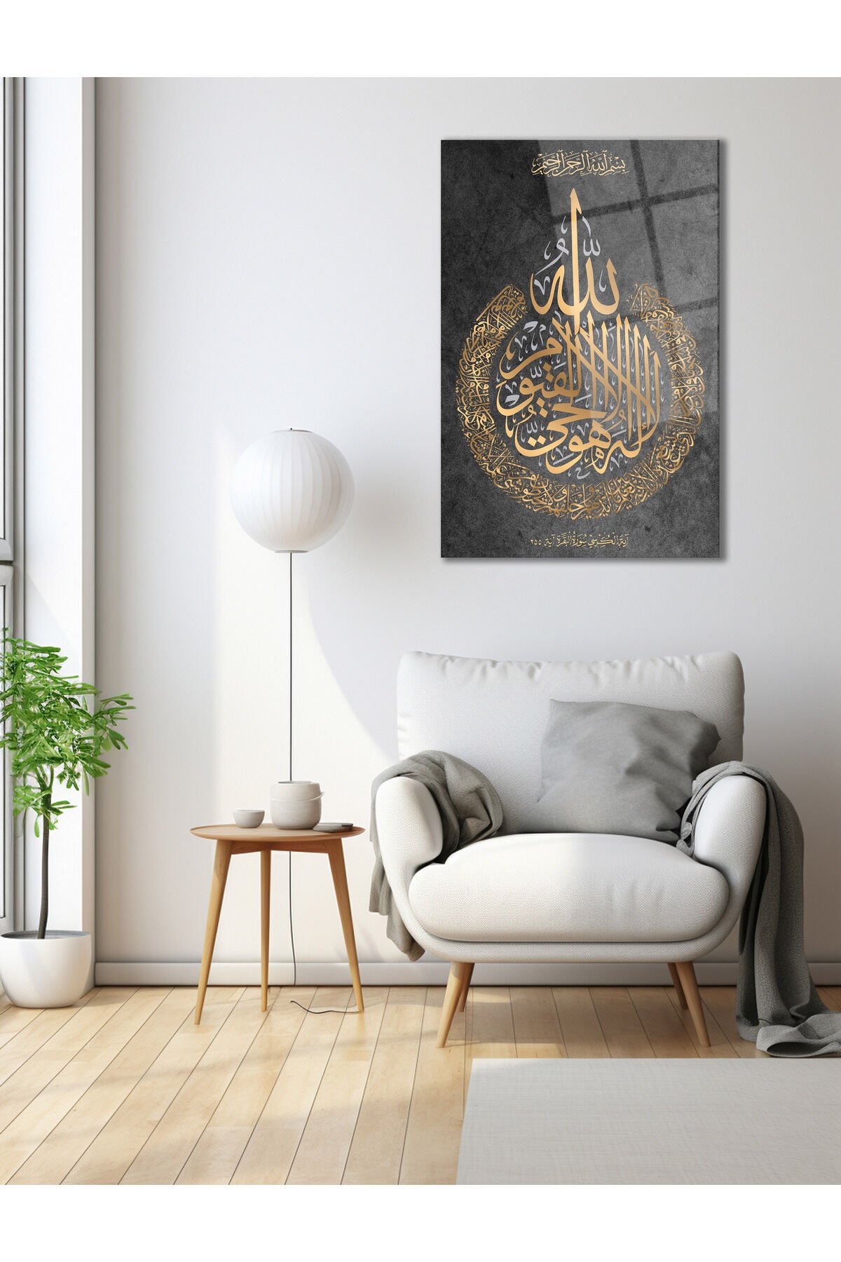 Ayetel Kürsi Dikey Cam Tablo, Dini İslami Modern Ev Ofis Salon Duvar Dekoru, Hediyelik Tablo Dekor Gri