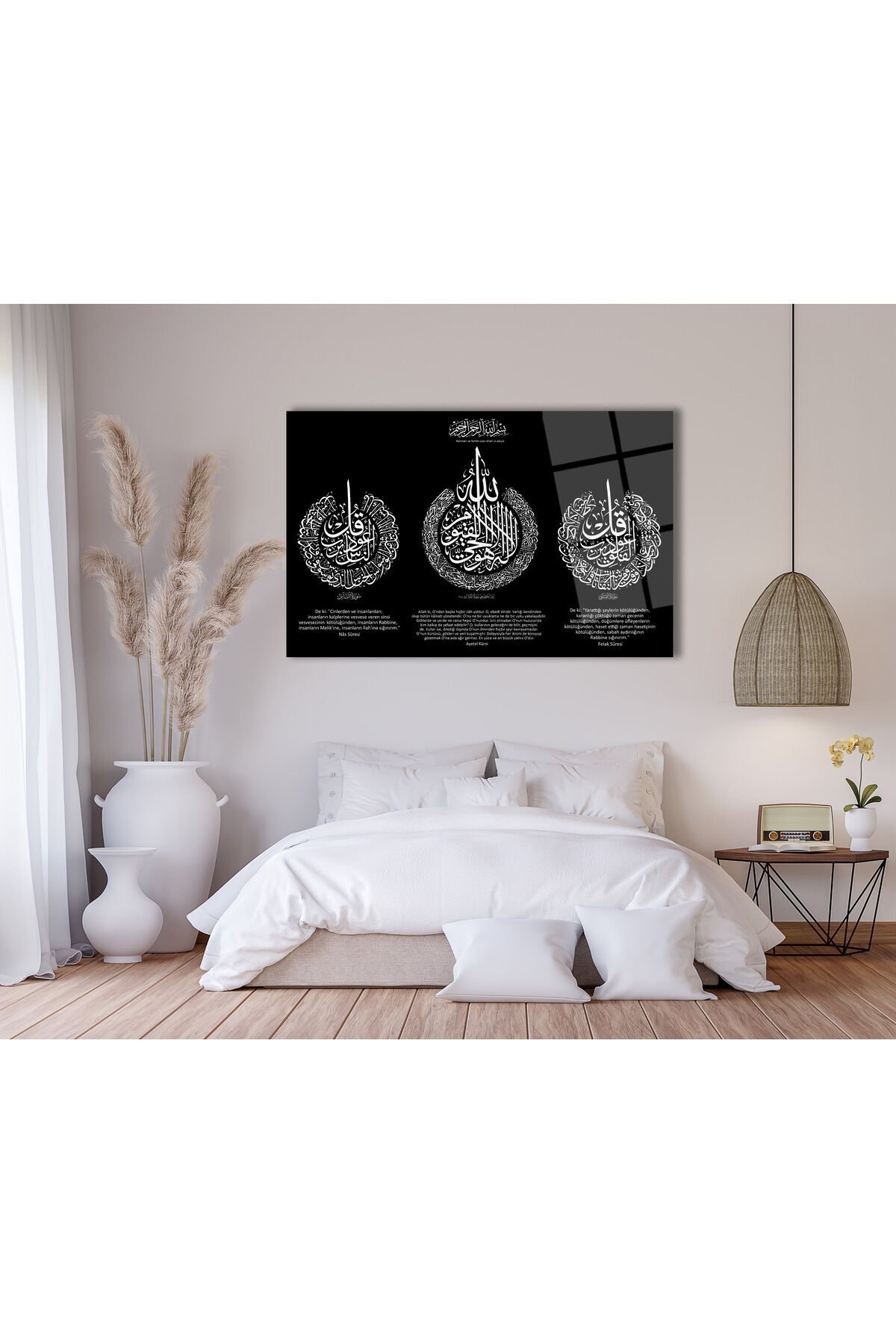Manevi ve dini temalı tasarımıyla ev ve ofis ortamlarınıza huzur veren bir atmosfer yaratır; Yüksek kaliteli cam malzemesi sayesinde uzun ömürlü kullanım sunar ve kolay temizlenebilir özelliğiyle pratik bir bakım imkanı sağlar; Modern ve şık görünümüyle mekanınıza estetik bir dokunuş eklerken, aynı zamanda manevi değerleri yansıtan bir dekoratif obje olarak öne çıkar; Ayetel Kürsi, Felak ve Nas surelerinin Türkçe meali ile hem dini bilgilerinizi pekiştirir hem de evinizde veya ofisinizde manevi bir rehber olarak hizmet eder; Hediye olarak tercih edebileceğiniz bu tablo, sevdiklerinize özel ve anlamlı bir hediye alternatifi sunar;