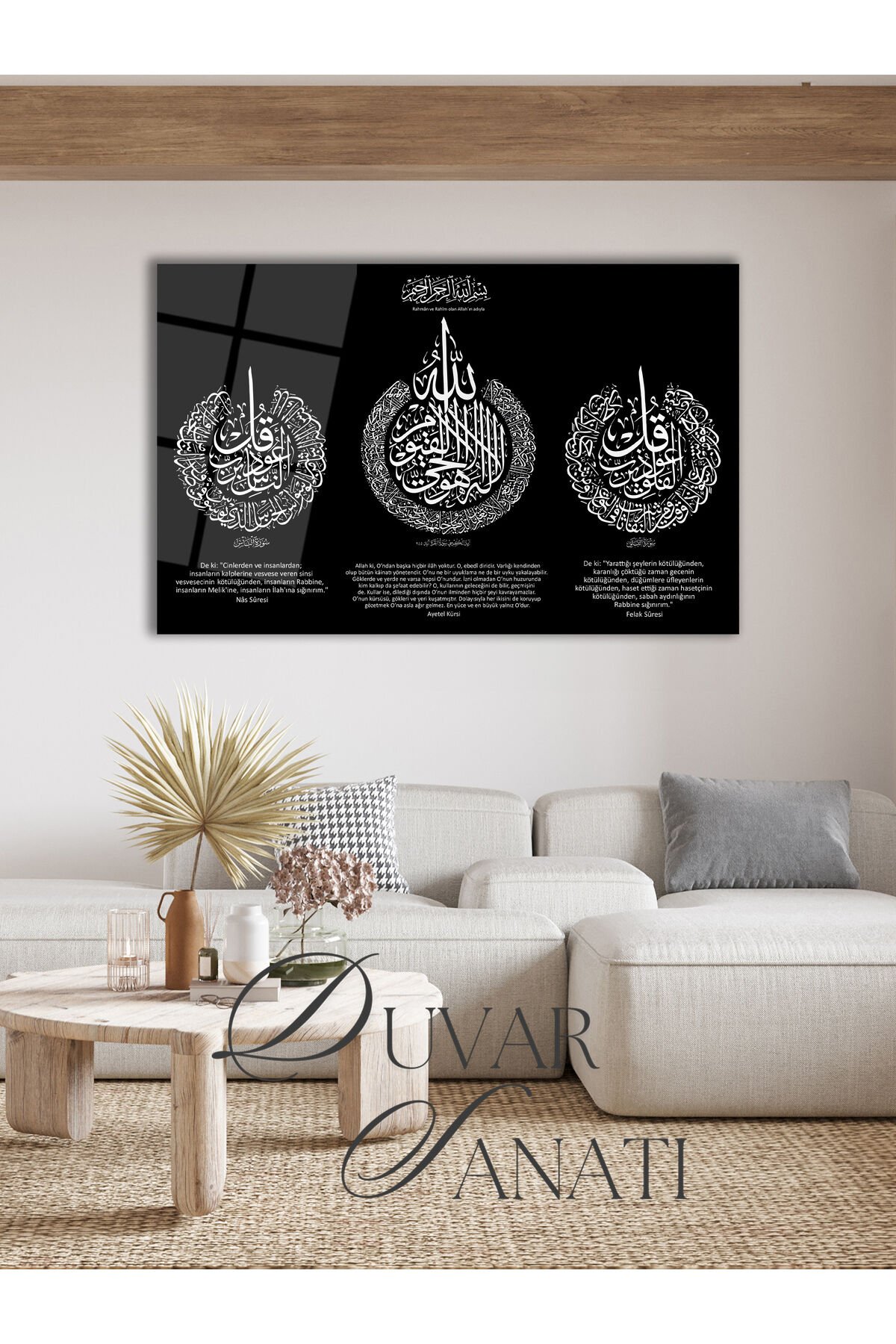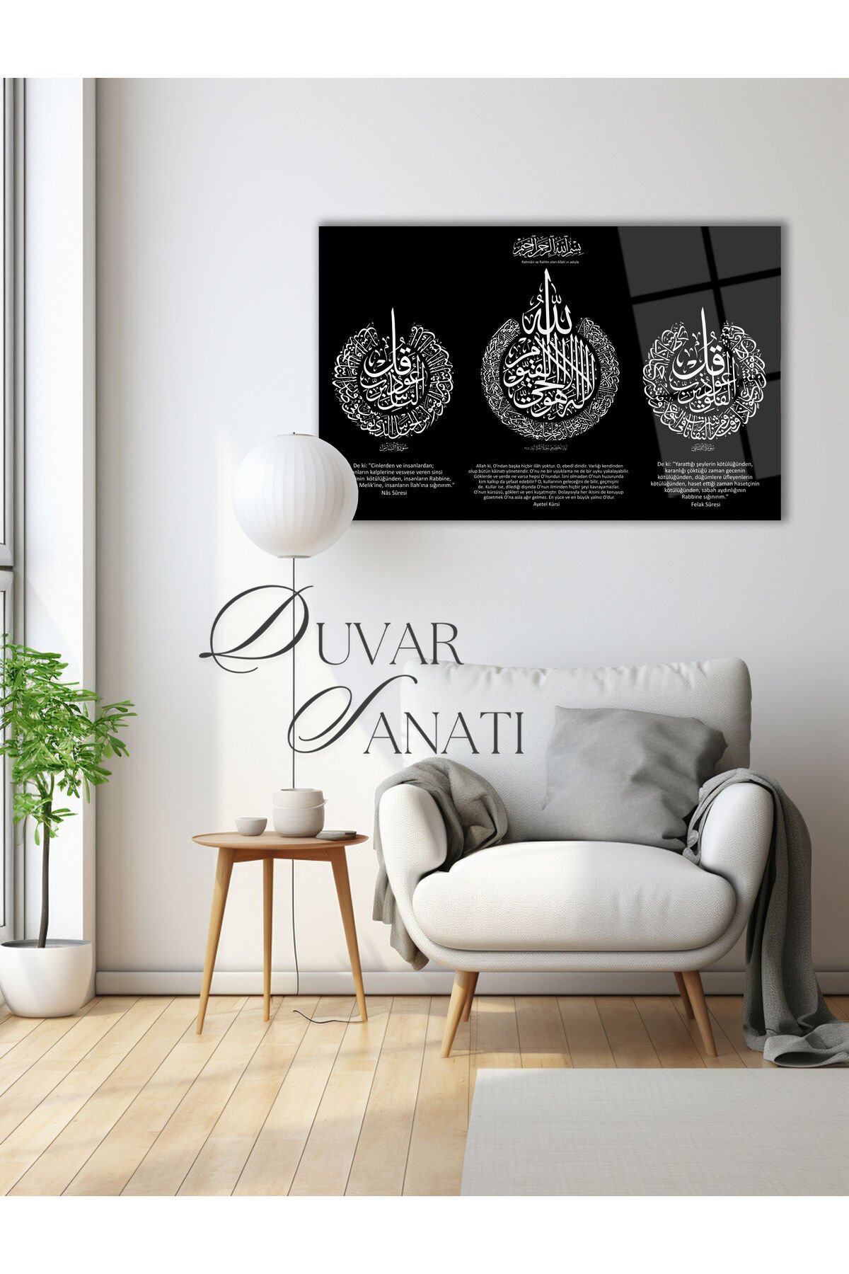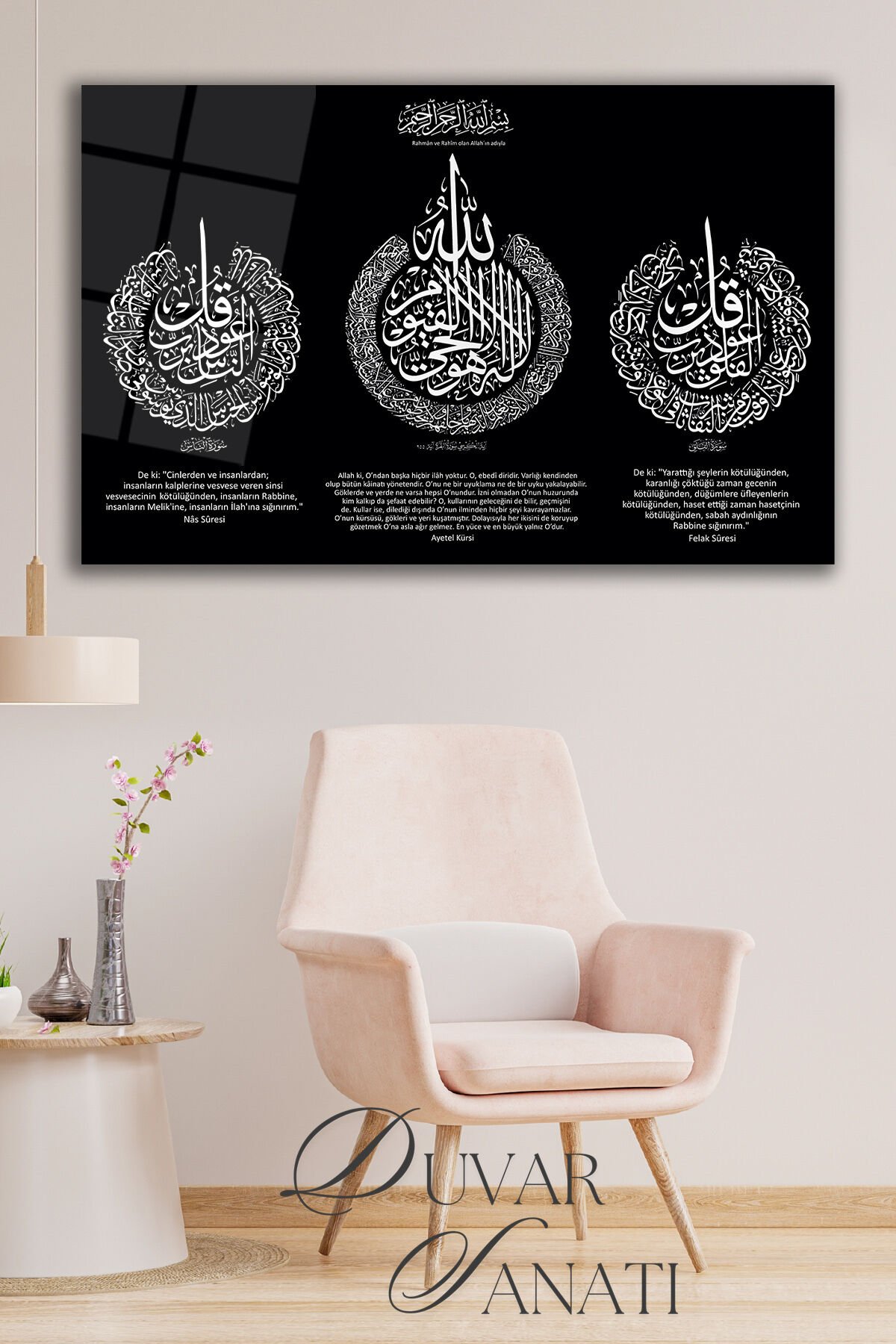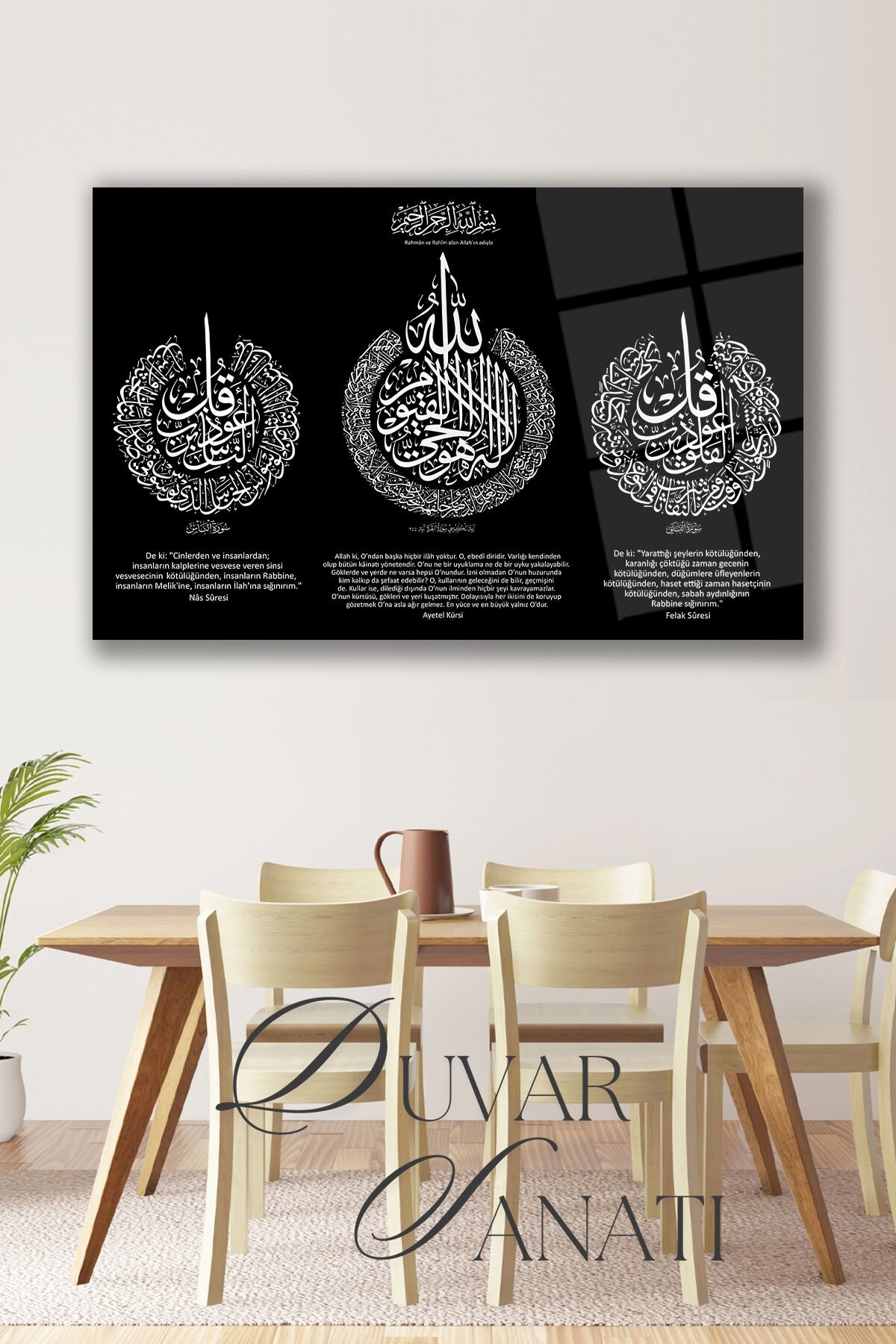 Ayetel Kürsi Felak Nas ve Türkçe Meali Cam Tablo,Dini İslami Modern Ev Ofis Duvar Dekoru , Hediyelik Siyah Beyaz
